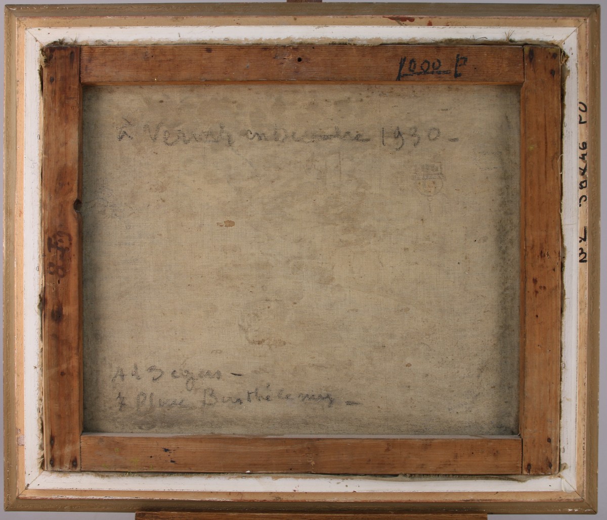 Inscription manuscrite au dos: "à vernir en décembre 1930 / Ad Segers 7, place Barthélémy" (Rouen).
