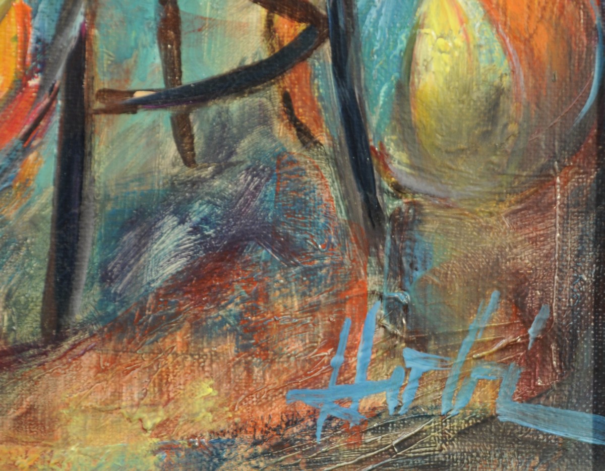 - Arlequin à la chaise. Toile, signée en bas à droite. Haut. 33 Larg. 24,5 cm.