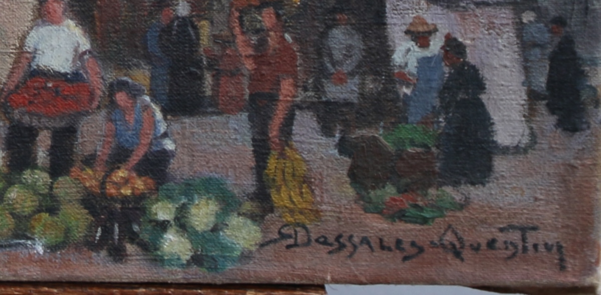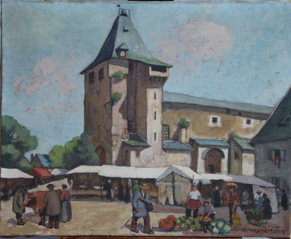 Jour de marché au pied de l'église fortifiée Saint-Jean-Baptiste d'Allassac (Corrèze).