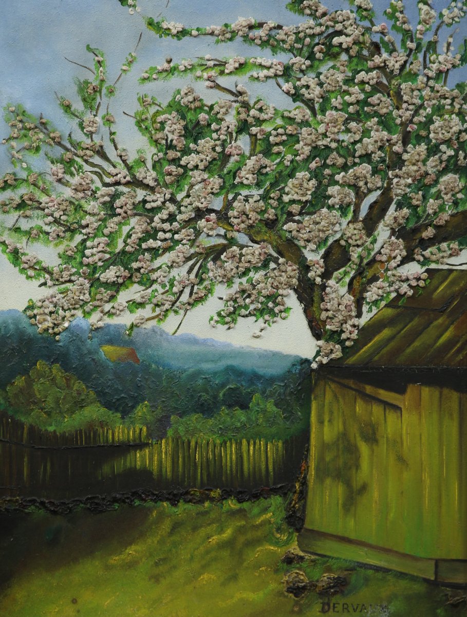 JOINT: DERVAUX (XXe). Paysage au cerisier en fleurs. Isorel signé. Haut. 65, Larg. 49 cm.