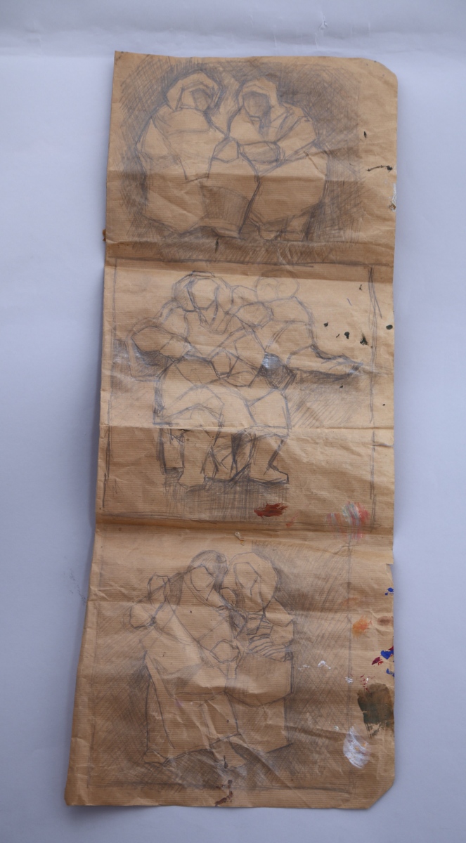 Joint: du même artiste, trois dessins préparatoires au graphite groupé sur papier kraft, 76 x 32 cm.