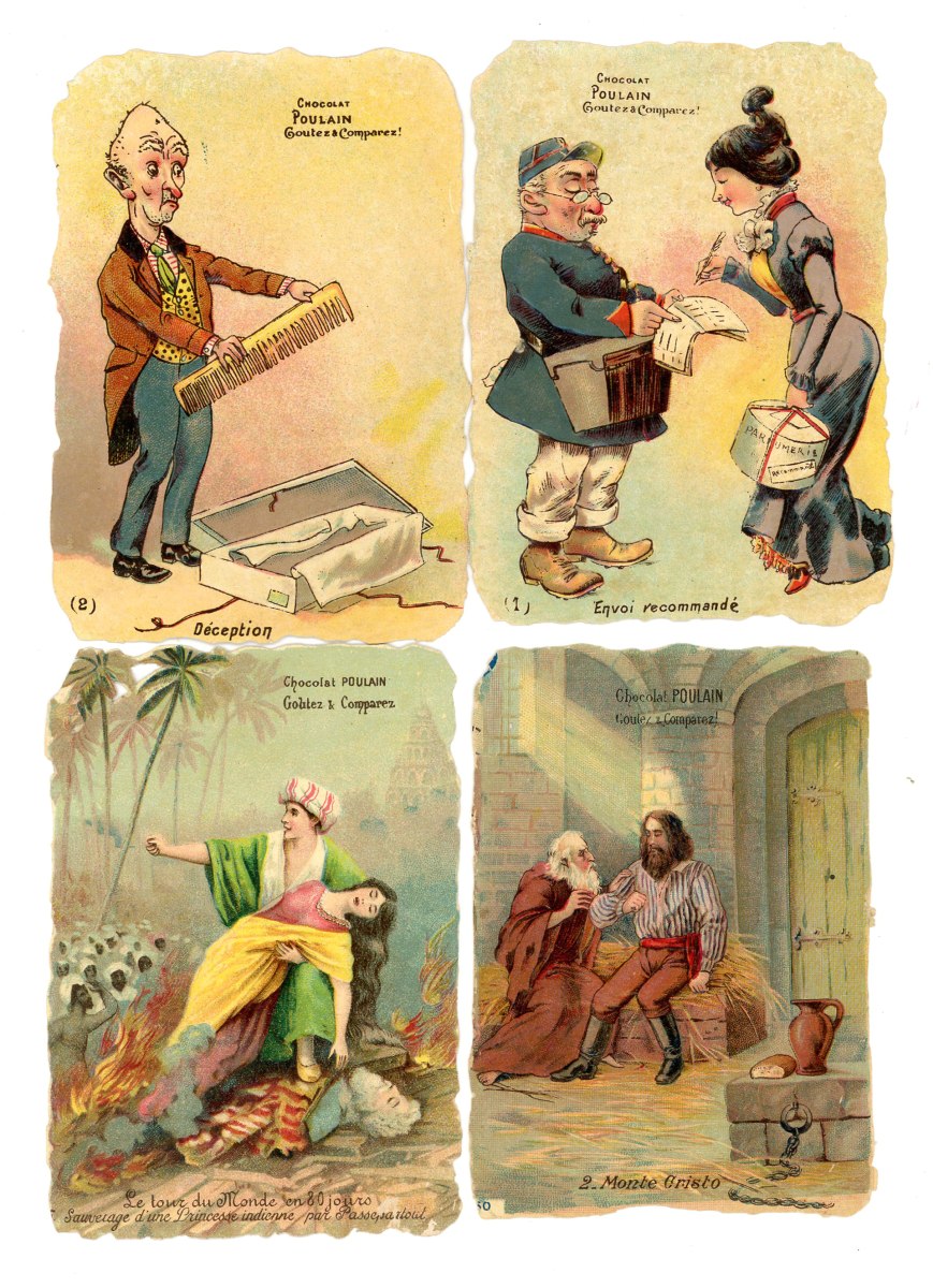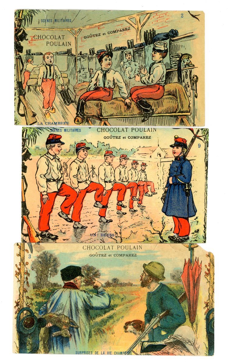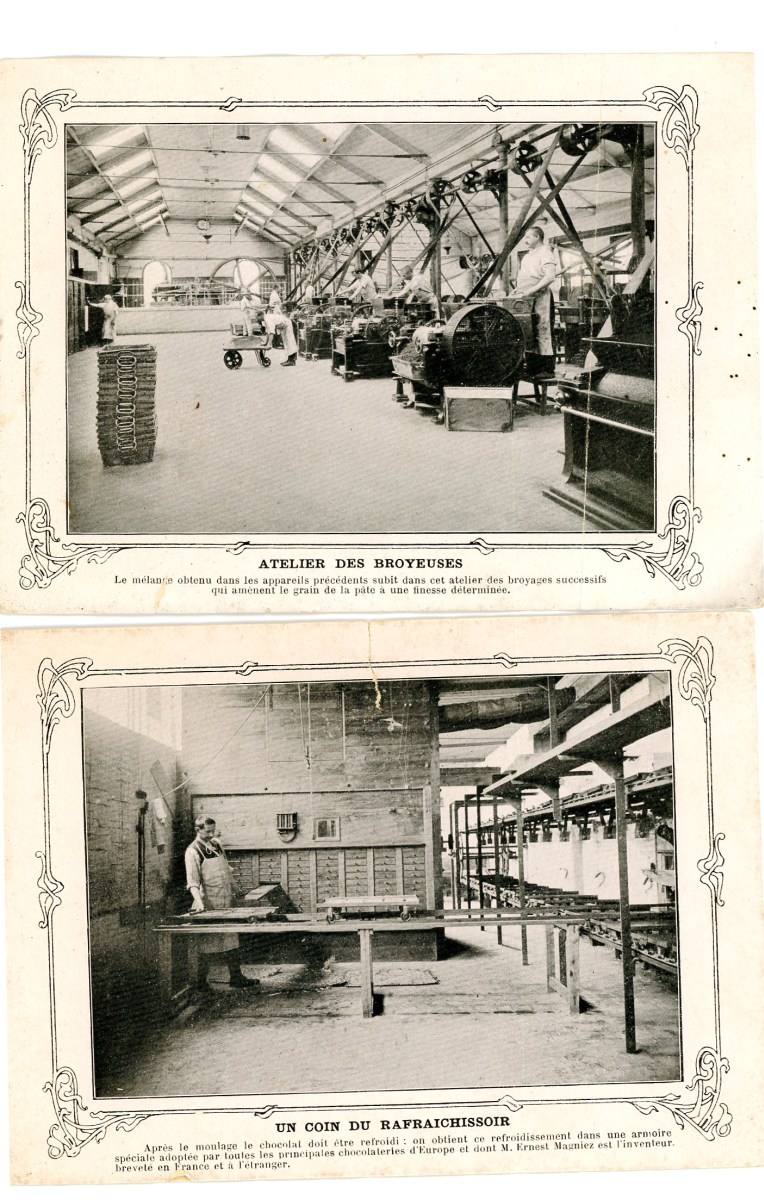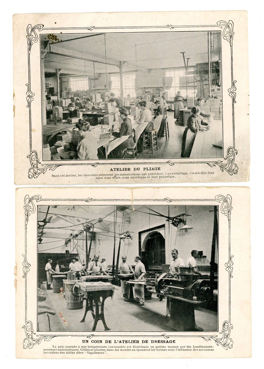 Joint: 4 pages imprimées d'ateliers d'une chocolaterie, Poulain à Blois? ; buvards chocolats Poulain.