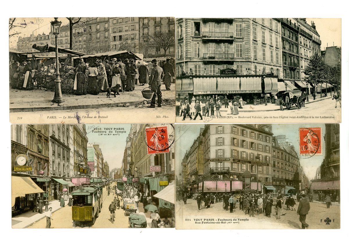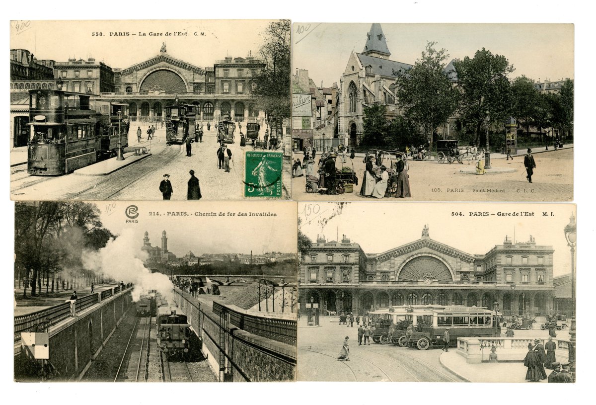 [PARIS] Env. 600 cartes postales anciennes et cpsm, en album, monuments, bâtiments, rues, places, gares, églises, ponts, crues, vieux métiers, etc.