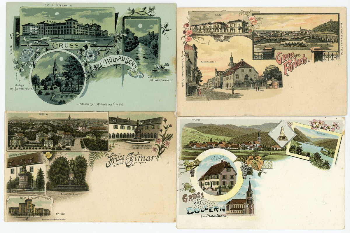 [ALSACE-LORRAINE] Env. 105 cartes postales, en majorité écrites et voyagées, années 1890-1920 dont 55 cp type GRUSS AUS (Strasbourg, Mulhouse, Colmar, Forbach, Dollern, Zabern, Grendelbruch, les Vosges, etc), " En Alsace Libérée " [4 cp], " Souvenir des fêtes de la libération " [5 cp], etc.