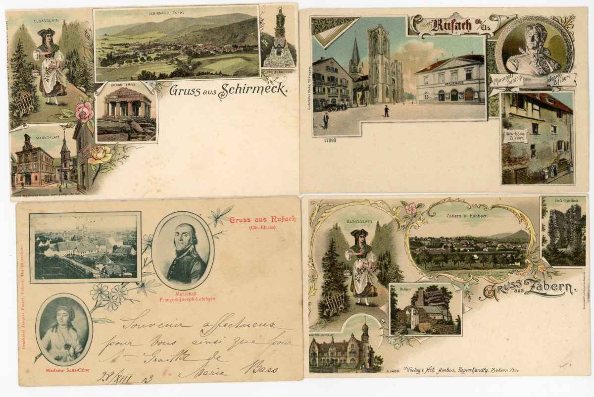 ![Lot 30 - [ALSACE-LORRAINE] Env. 105 cartes postales, en majorité écrites et voyagées,... [ALSACE-LORRAINE] Env. 105 cartes postales, en majorité écrites et voyagées,...](<150:ddoc-725668-07bfd0b9f6d4f28a641e5a9f64956fd5-p100201716600073.jpg, <480:ddoc-725669-d97d19b6e3b87485d9e9e3684487c870-p100201716600073.jpg, <640:ddoc-725670-6bcd7d73294ee07784787d2846fae094-p100201716600073.jpg, <900:ddoc-725671-6a971bbc5edd75b911c7e6befbd0d7ef-p100201716600073.jpg, >900:ddoc-725667-11fc05297f00c1101ecbbfd4ce165850-p100201716600073.jpg)