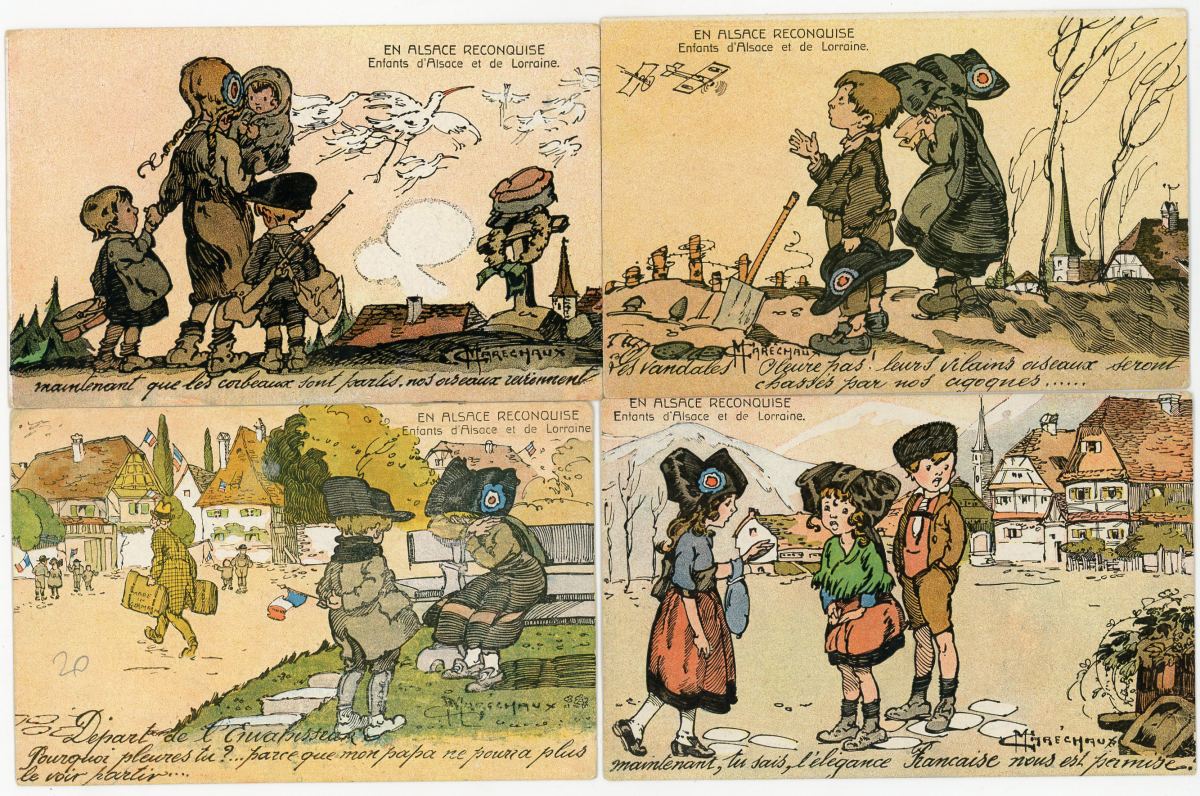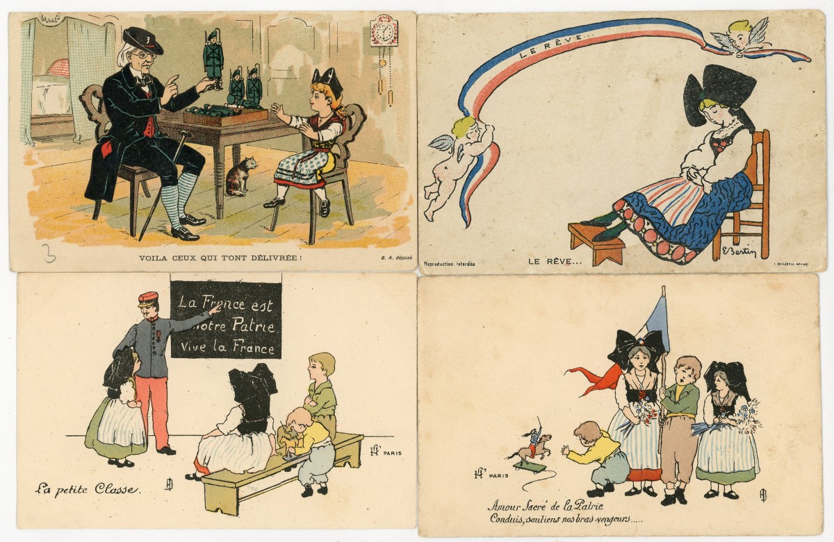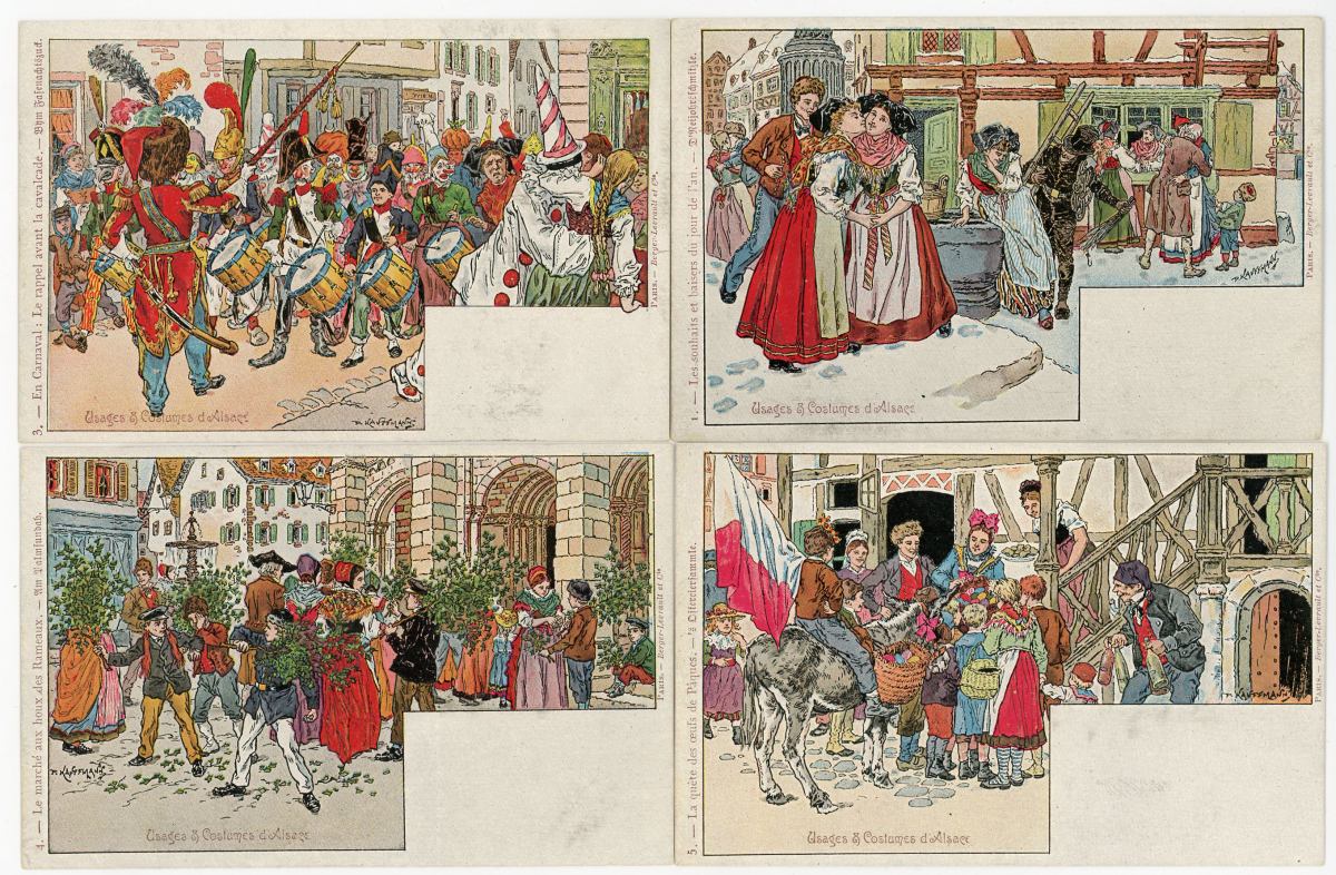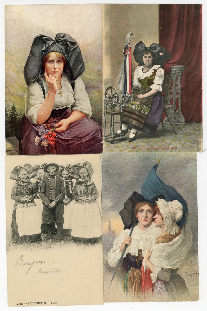 [ALSACE-LORRAINE] Env. 265 cartes postales, en majorité écrites et voyagées, années 1900-1940, dont env. 125 cartes patriotiques, et env. 135 cartes folkloriques, illustrations et humoristiques dont Paul KAUFFMANN " Usages et coutumes d'Alsace ", série complète de 24 cp non écrite ni voyagée.
