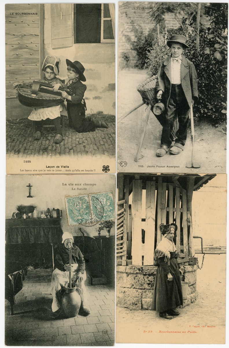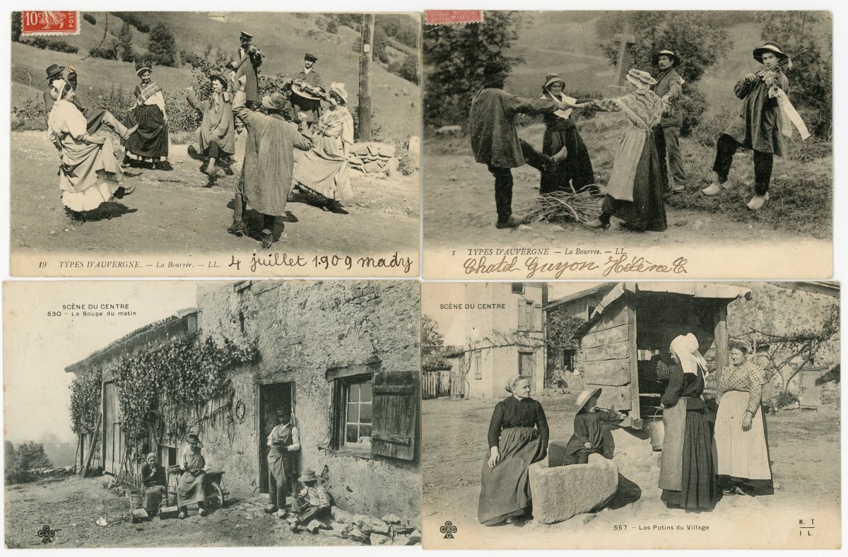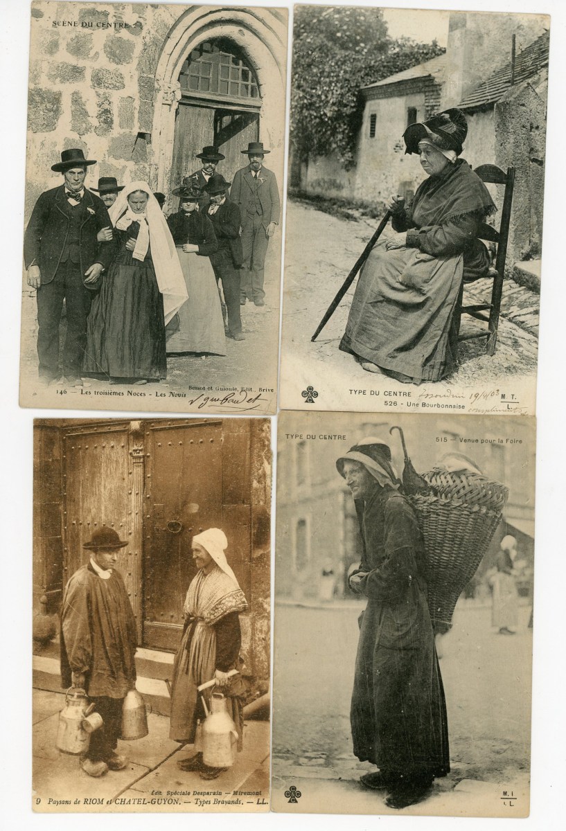 [AUVERGNE] env. 335 cartes postales anciennes et qqs cpsm, principalement scènes et types [env. 70 cp], et villes, qqs villages, stations thermales, animations, etc.