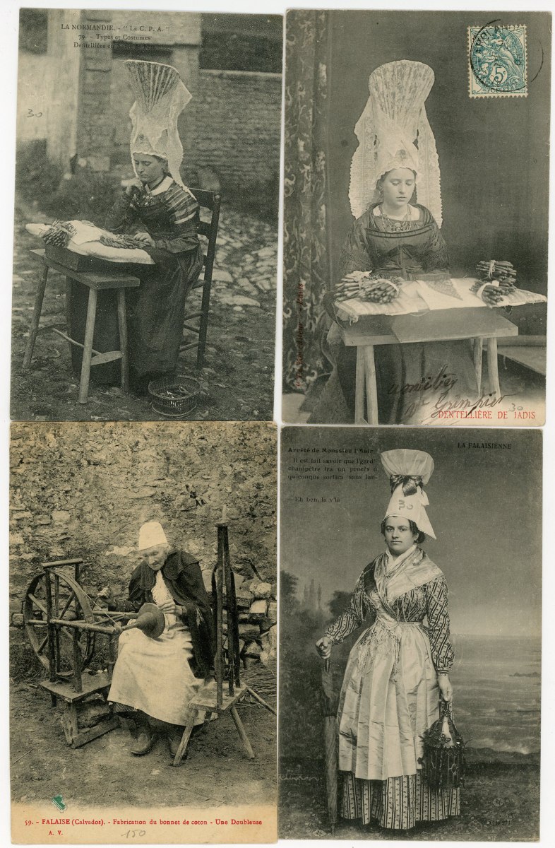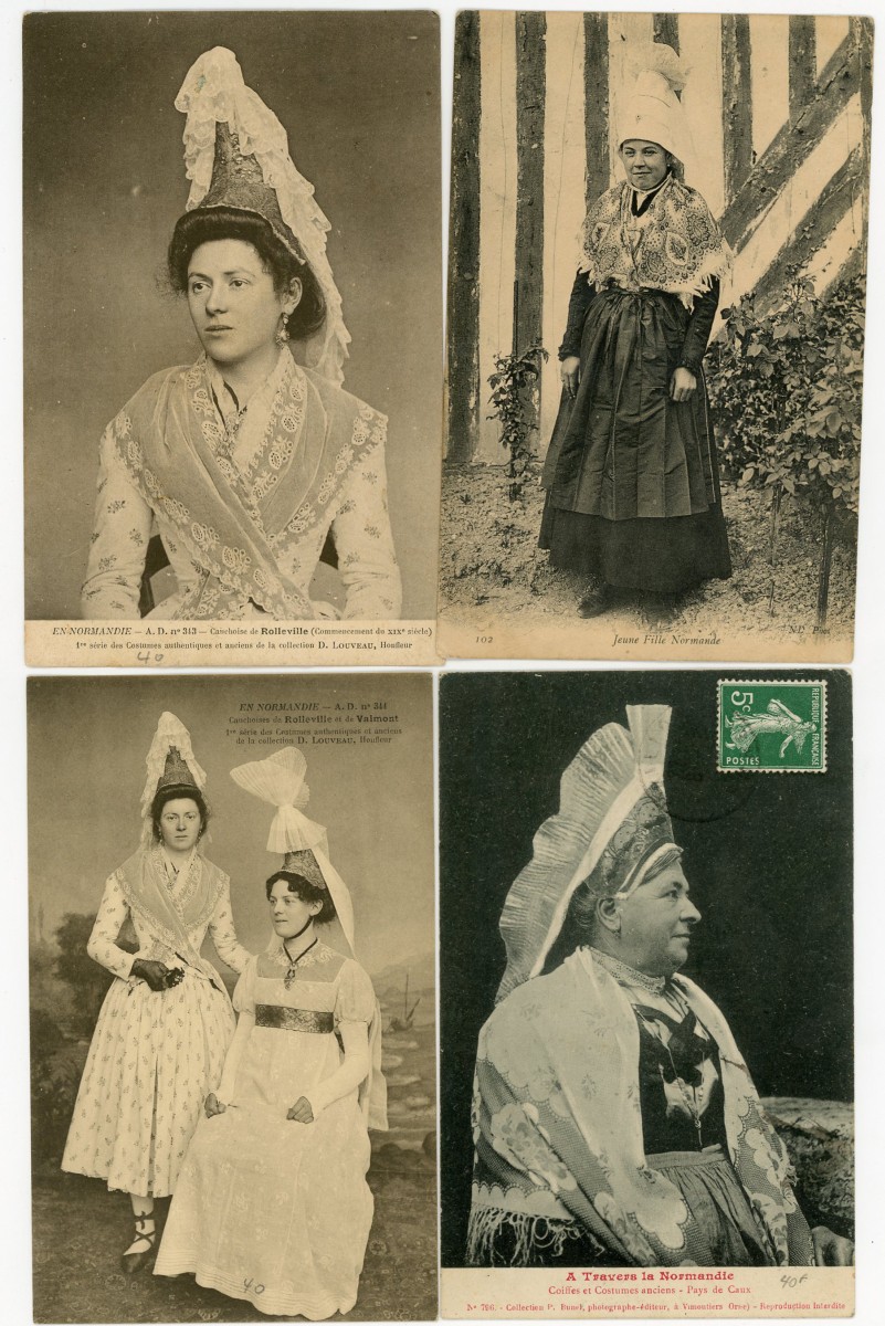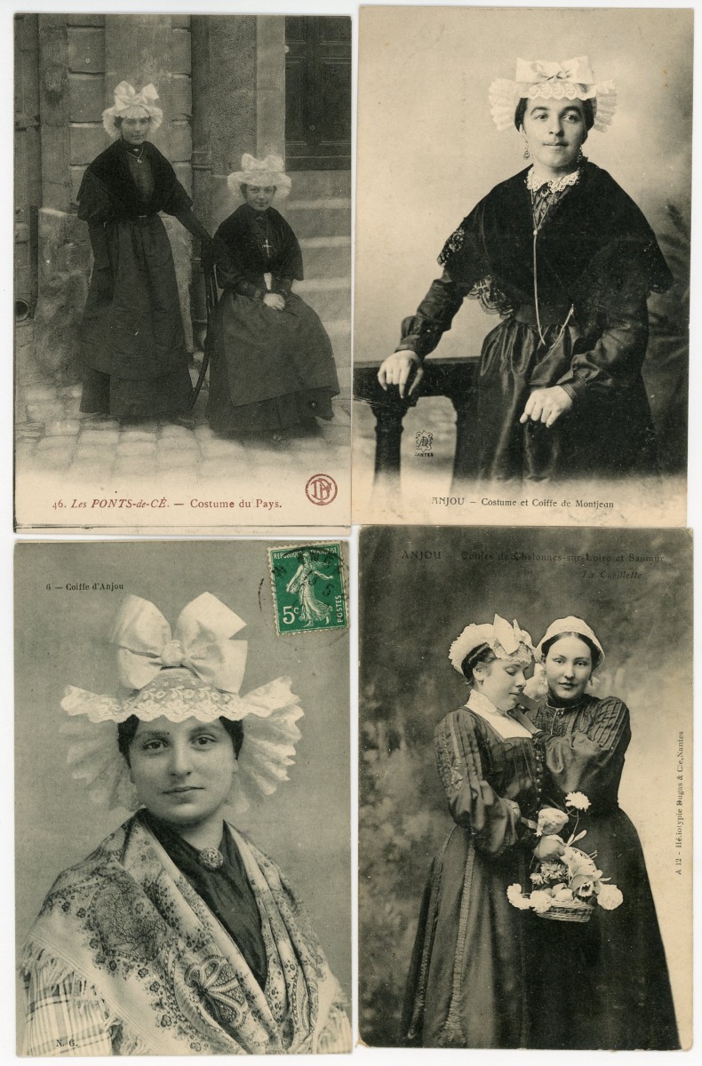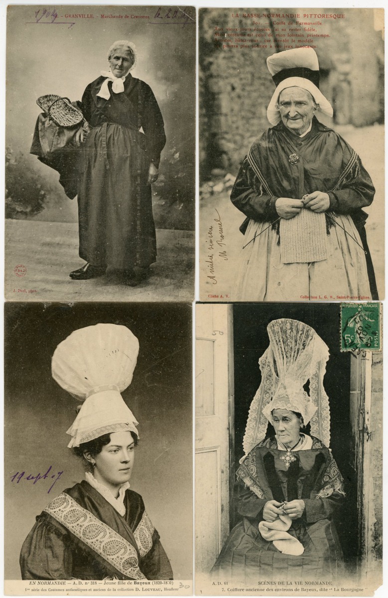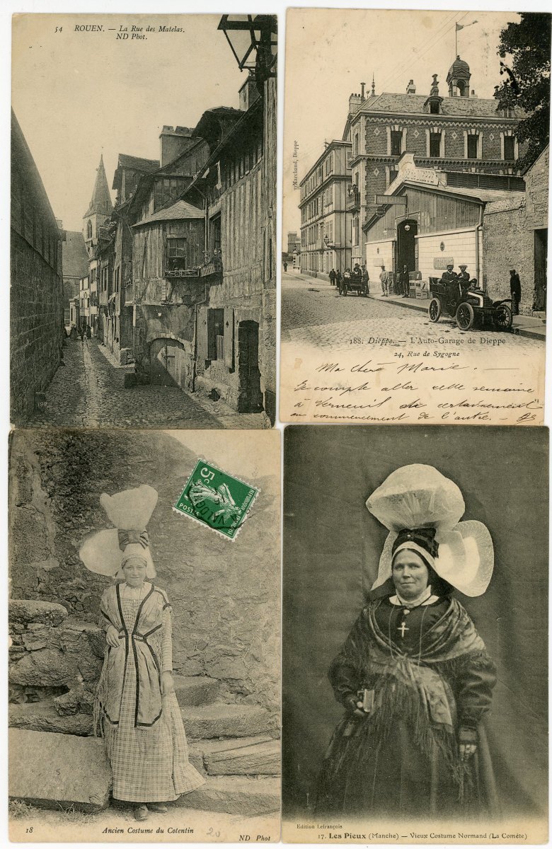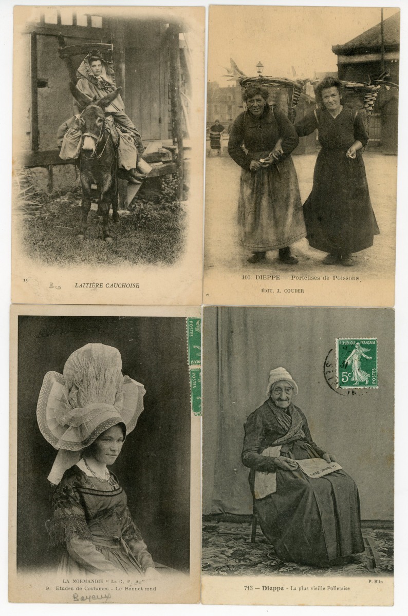 [NORMANDIE/ANJOU] env. 700 cartes postales anciennes et cpsm, dépts 14-27-49-50-53-61 et 76, principalement scènes et types [env. 255 cp] dont séries coiffes d'hier, et villes, qqs villages, ports, bateaux, plages, animations, châteaux, églises, etc.