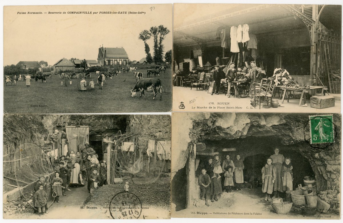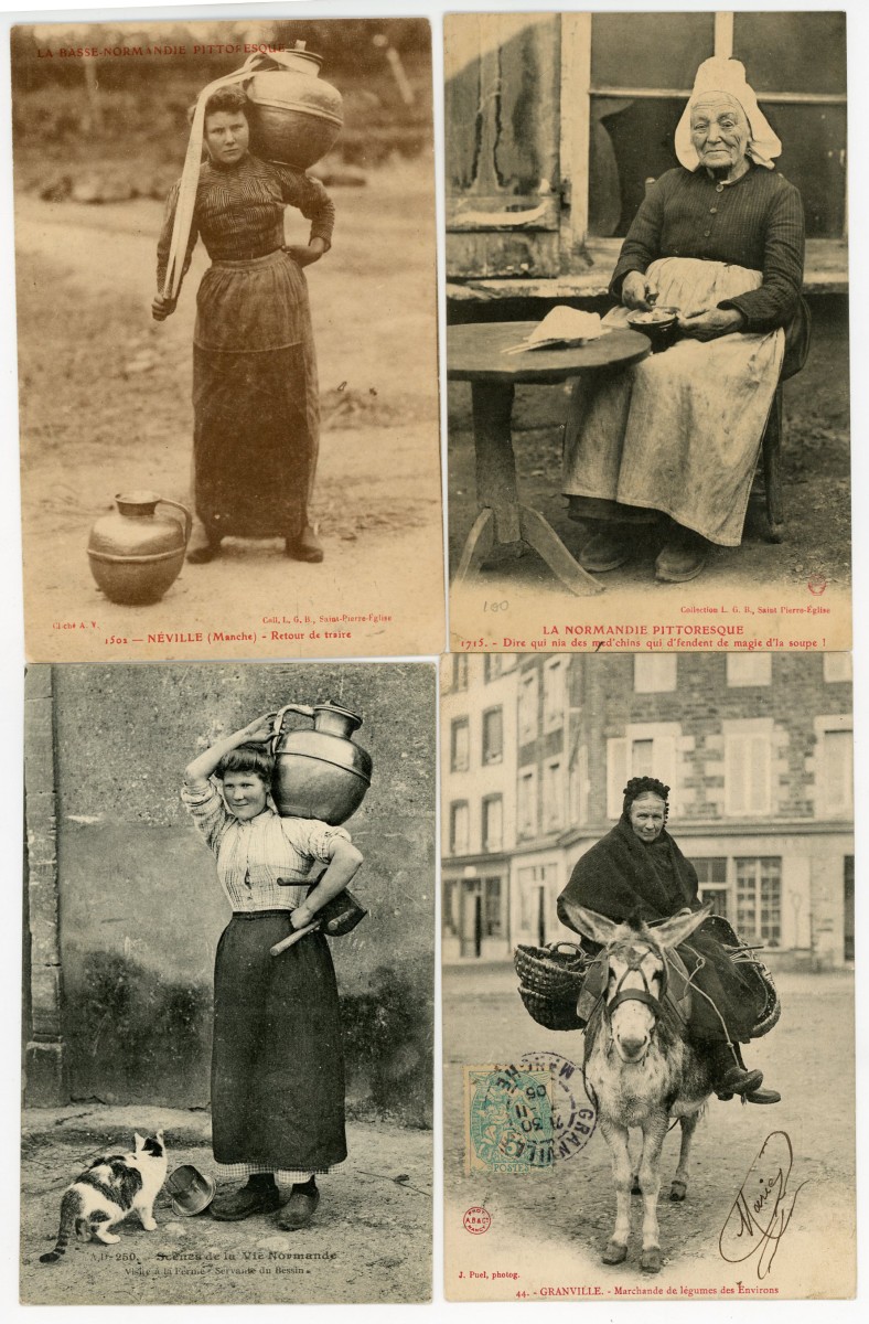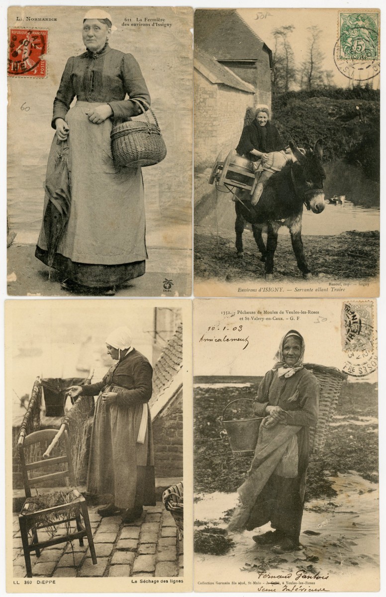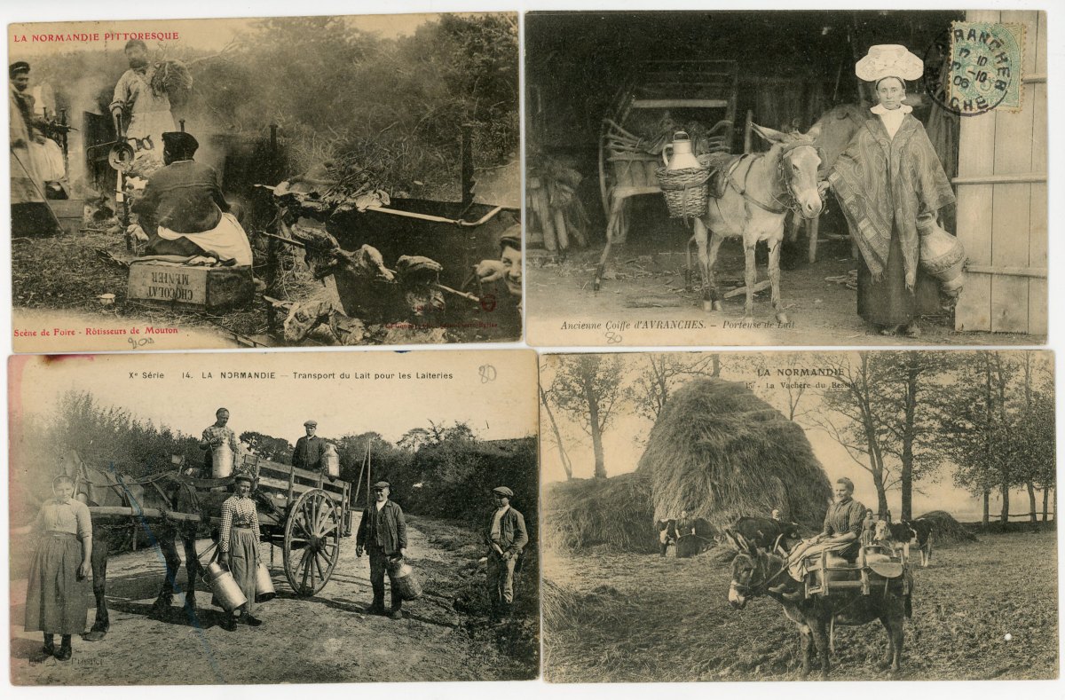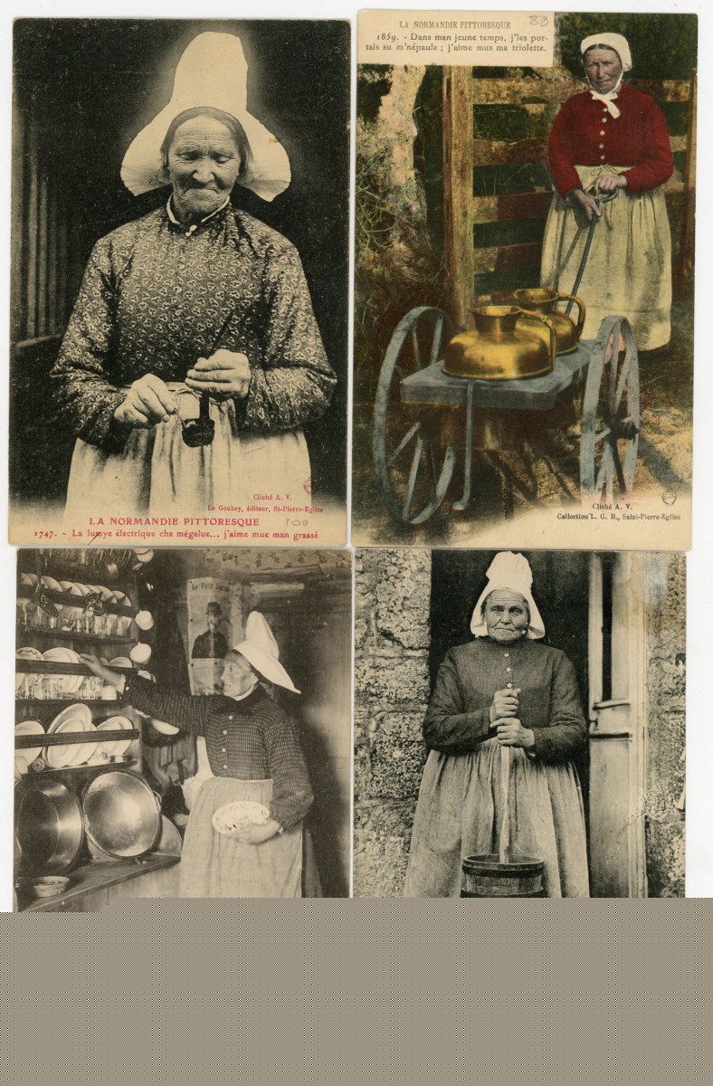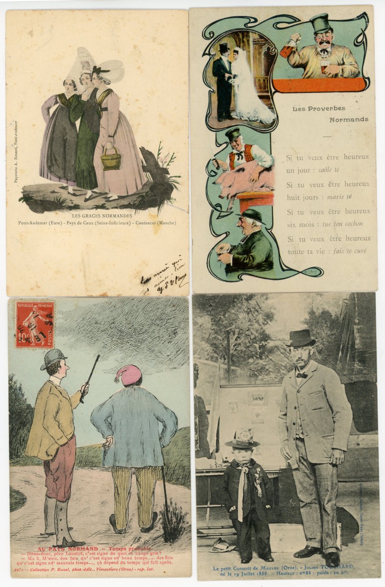 [NORMANDIE/ANJOU] env. 700 cartes postales anciennes et cpsm, dépts 14-27-49-50-53-61 et 76, principalement scènes et types [env. 255 cp] dont séries coiffes d'hier, et villes, qqs villages, ports, bateaux, plages, animations, châteaux, églises, etc.