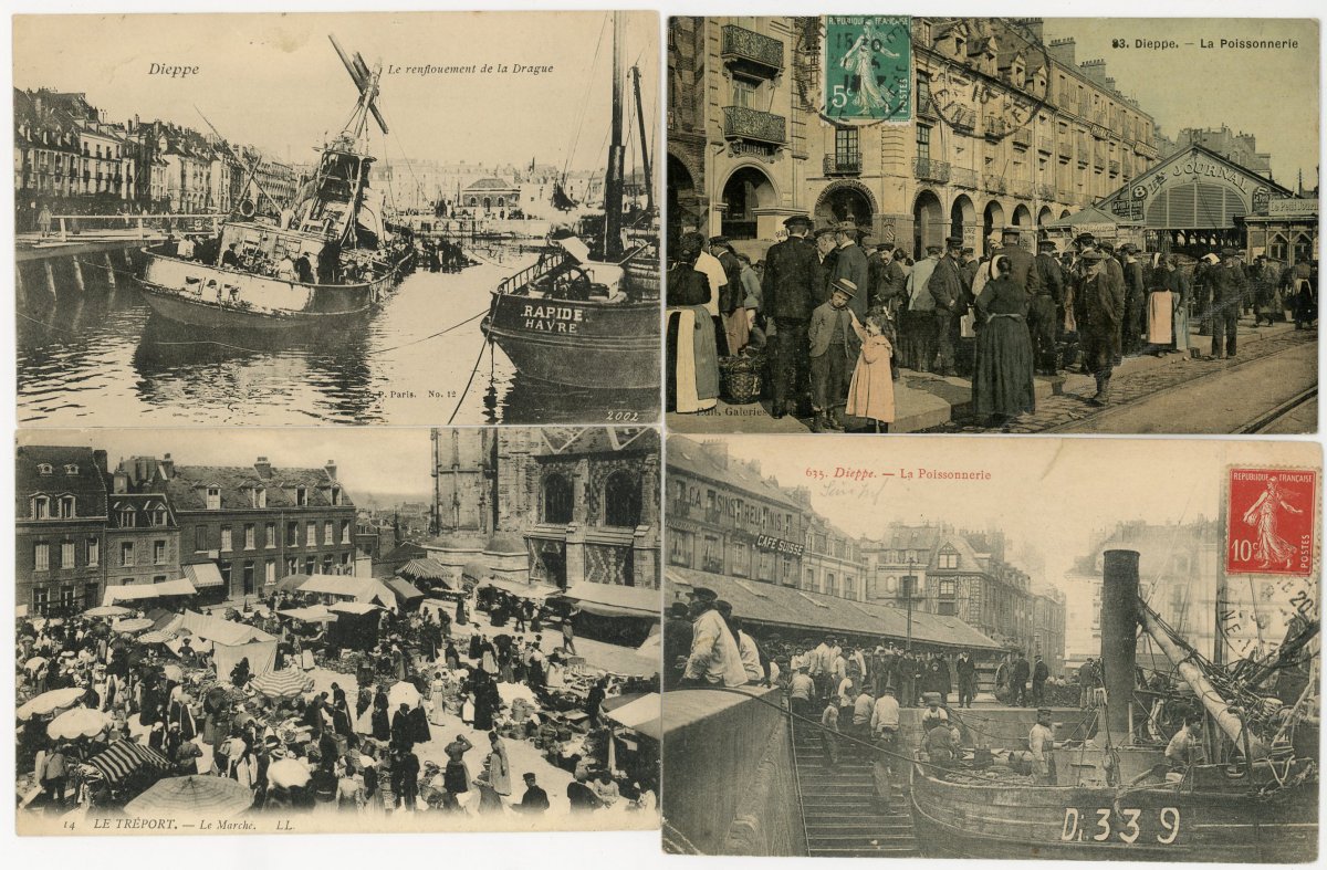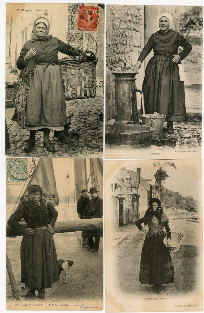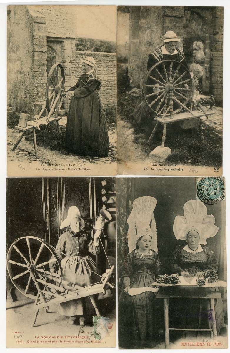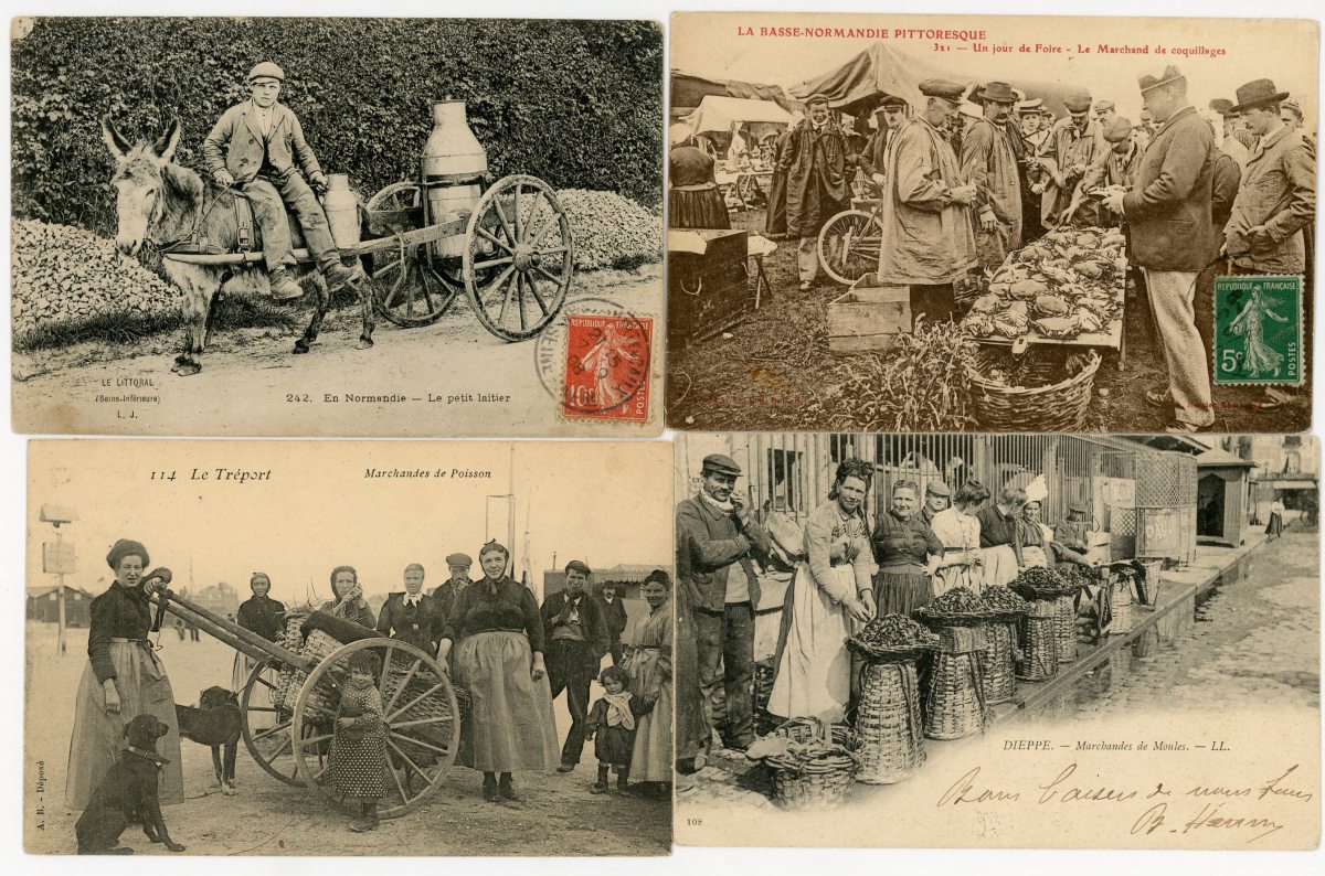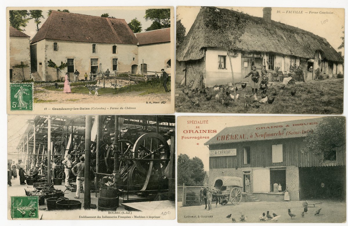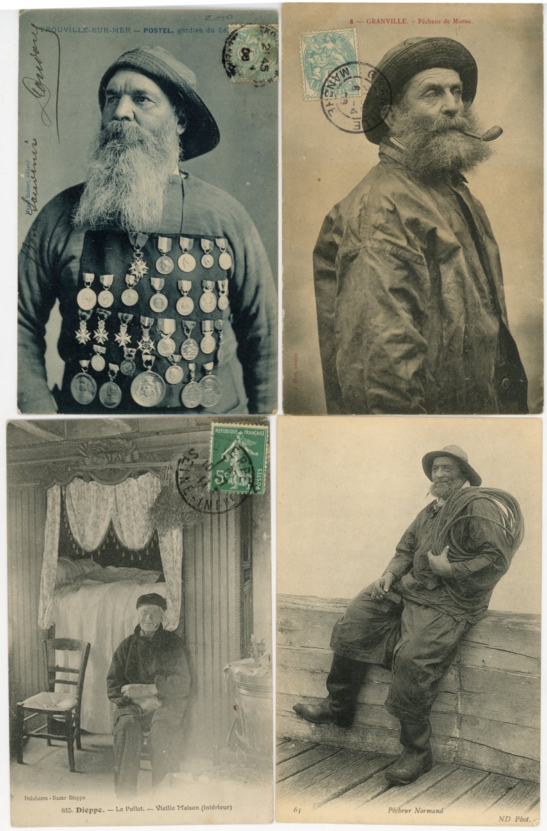 [NORMANDIE/ANJOU] env. 700 cartes postales anciennes et cpsm, dépts 14-27-49-50-53-61 et 76, principalement scènes et types [env. 255 cp] dont séries coiffes d'hier, et villes, qqs villages, ports, bateaux, plages, animations, châteaux, églises, etc.