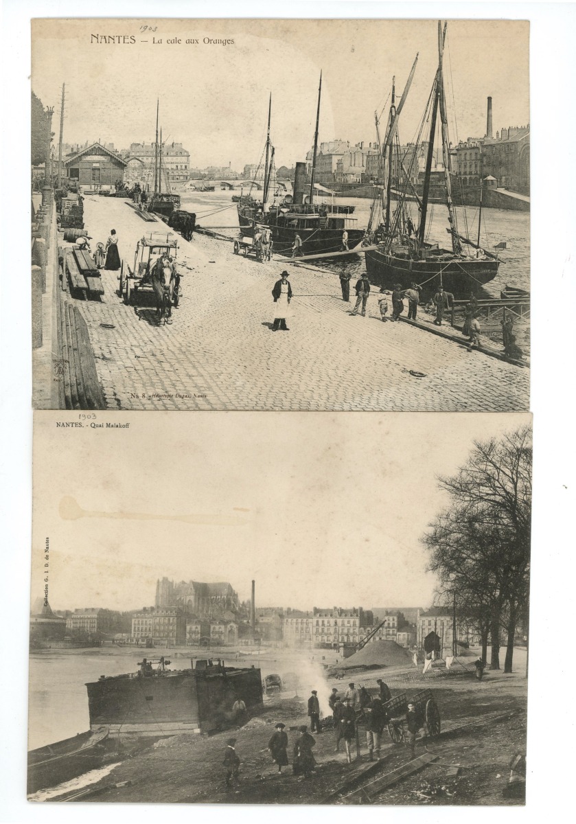 [LOIRE-ATLANTIQUE] NANTES: 7 cartes postales doubles anciennes, ni écrites ni circulées dont la cale aux oranges, quai Malakoff.