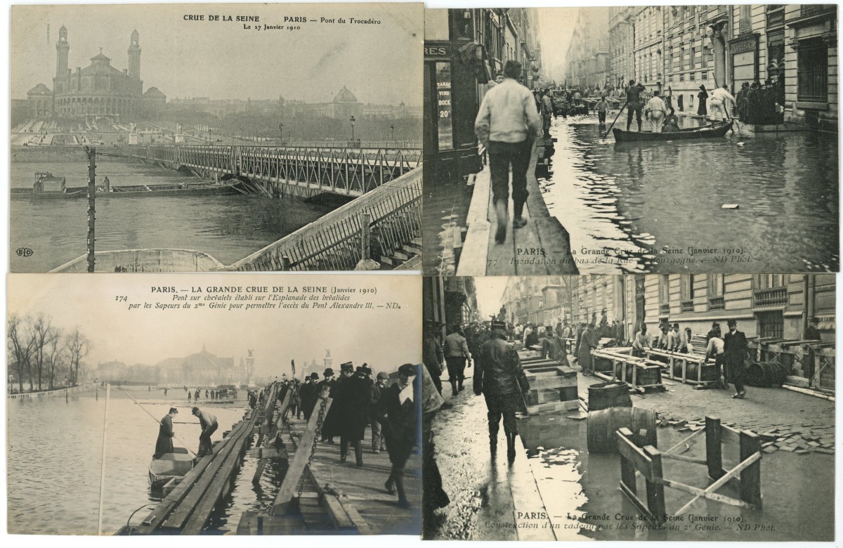 [PARIS] 34 cartes postales anciennes, inondations de 1910, rues, animations, ponts, monuments de Paris inondés.