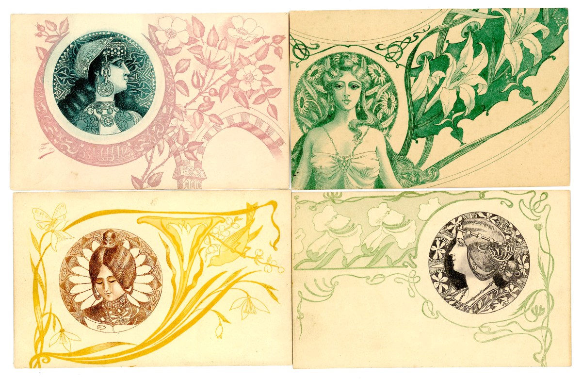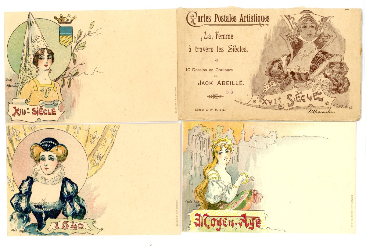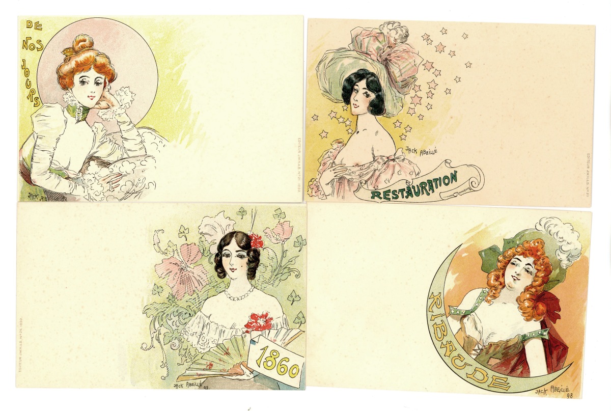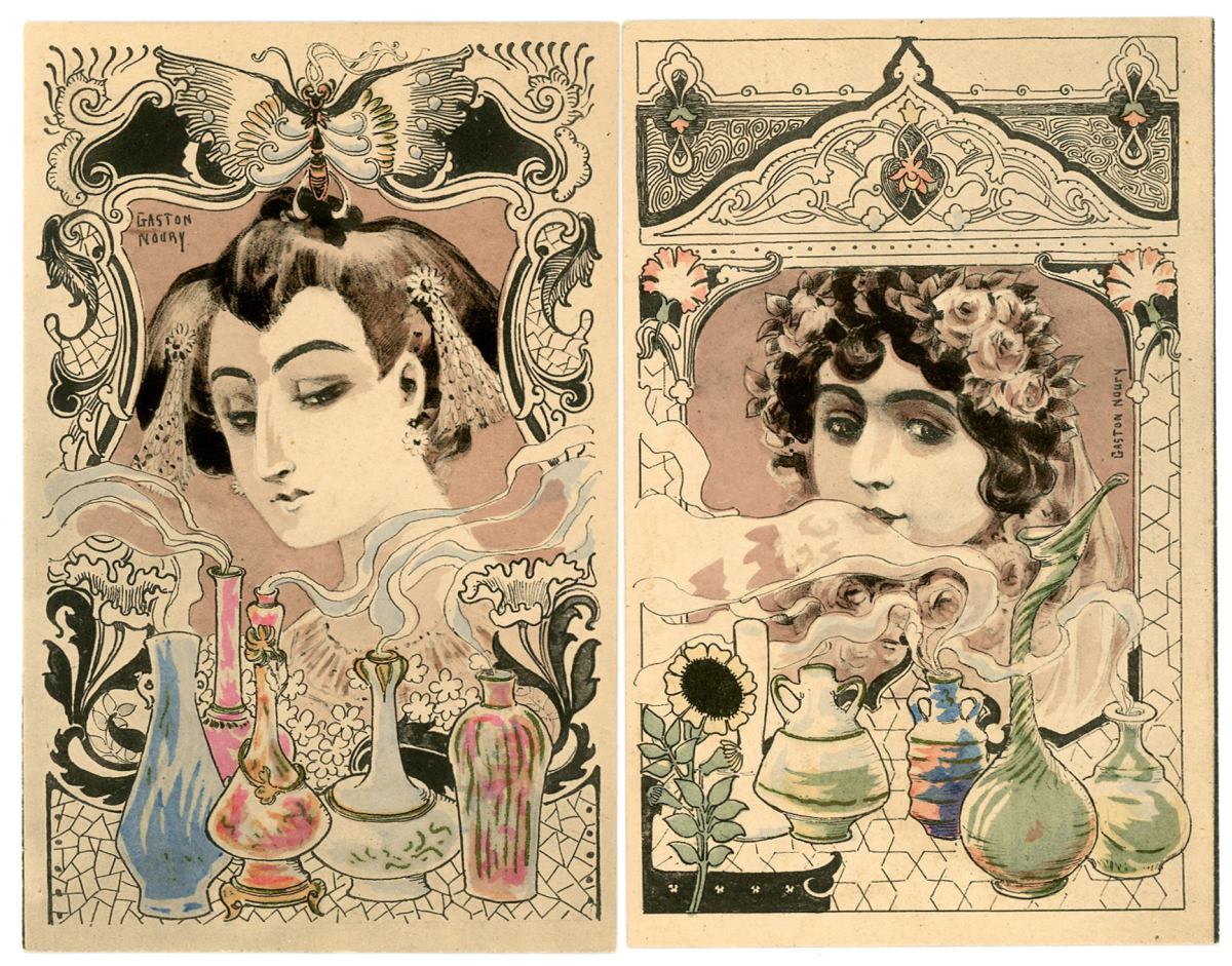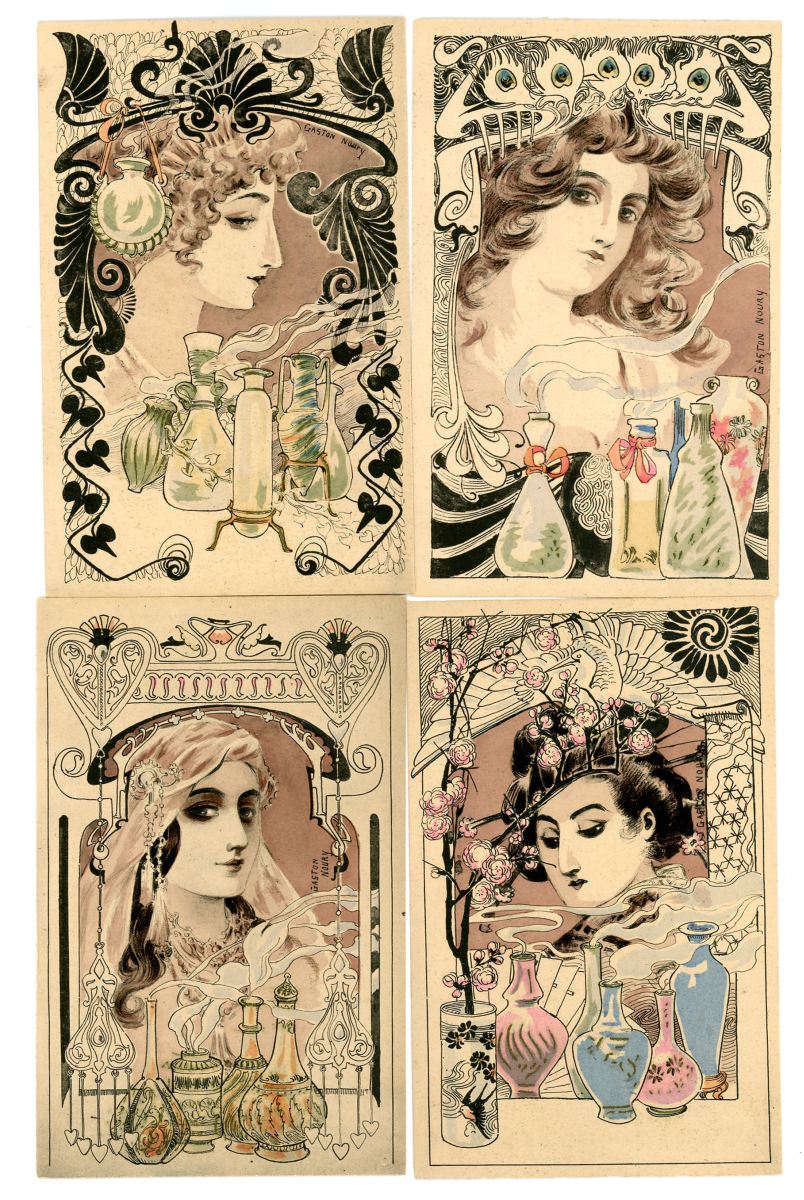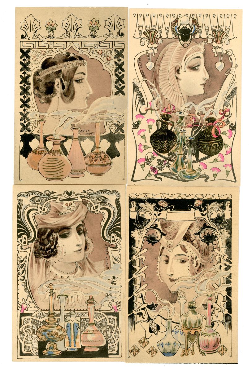 [ART NOUVEAU - ILLUSTRATEURS] 51 cartes postales artistiques, non circulées et non écrites, bon état, thèmes sur les femmes, dans le goût Art Nouveau, dont Gaston NOURY (série complète de 10 cp avec enveloppe pochette titrée " Les parfums à travers les âges "), Jack ABEILLE (série complète de 10 cp avec enveloppe pochette titrée " Les femmes à travers les siècles "), FREDILLO (suite de 9 cp artistiques), THEOLIN (6 cp femmes de Paris, eaux fortes), Gaston BUSSIERE (4 cp), Henry RYLAND (4 cp, dos recollés) avec enveloppe pochette titrée " Jeunes filles de Pompéi ", etc.