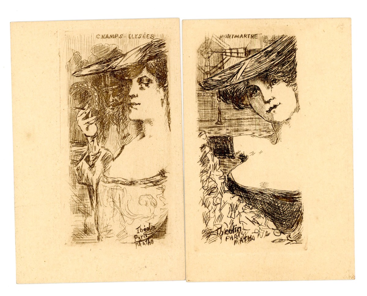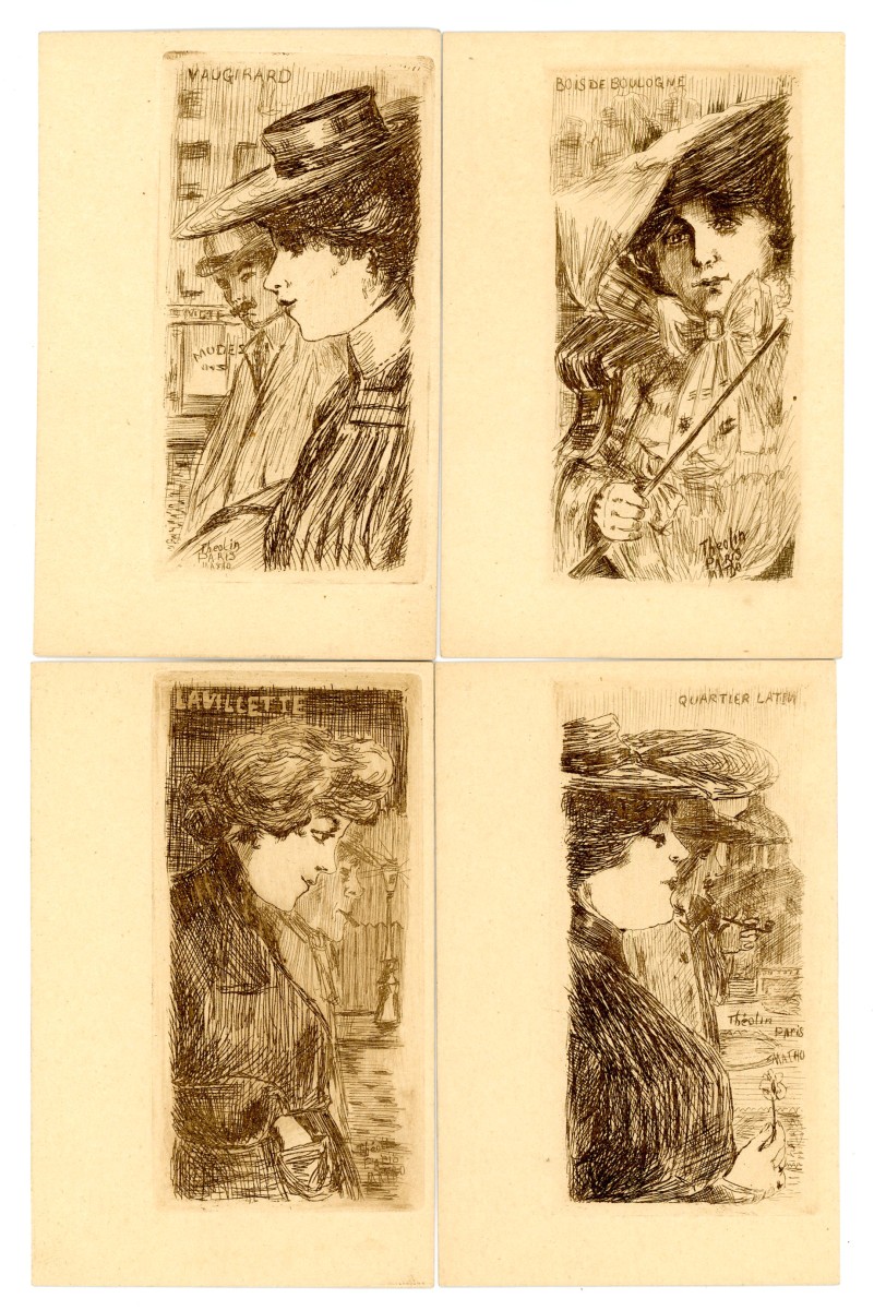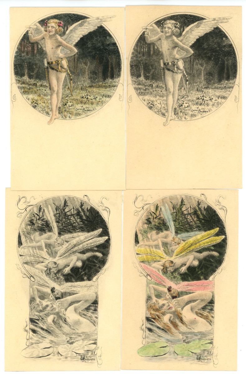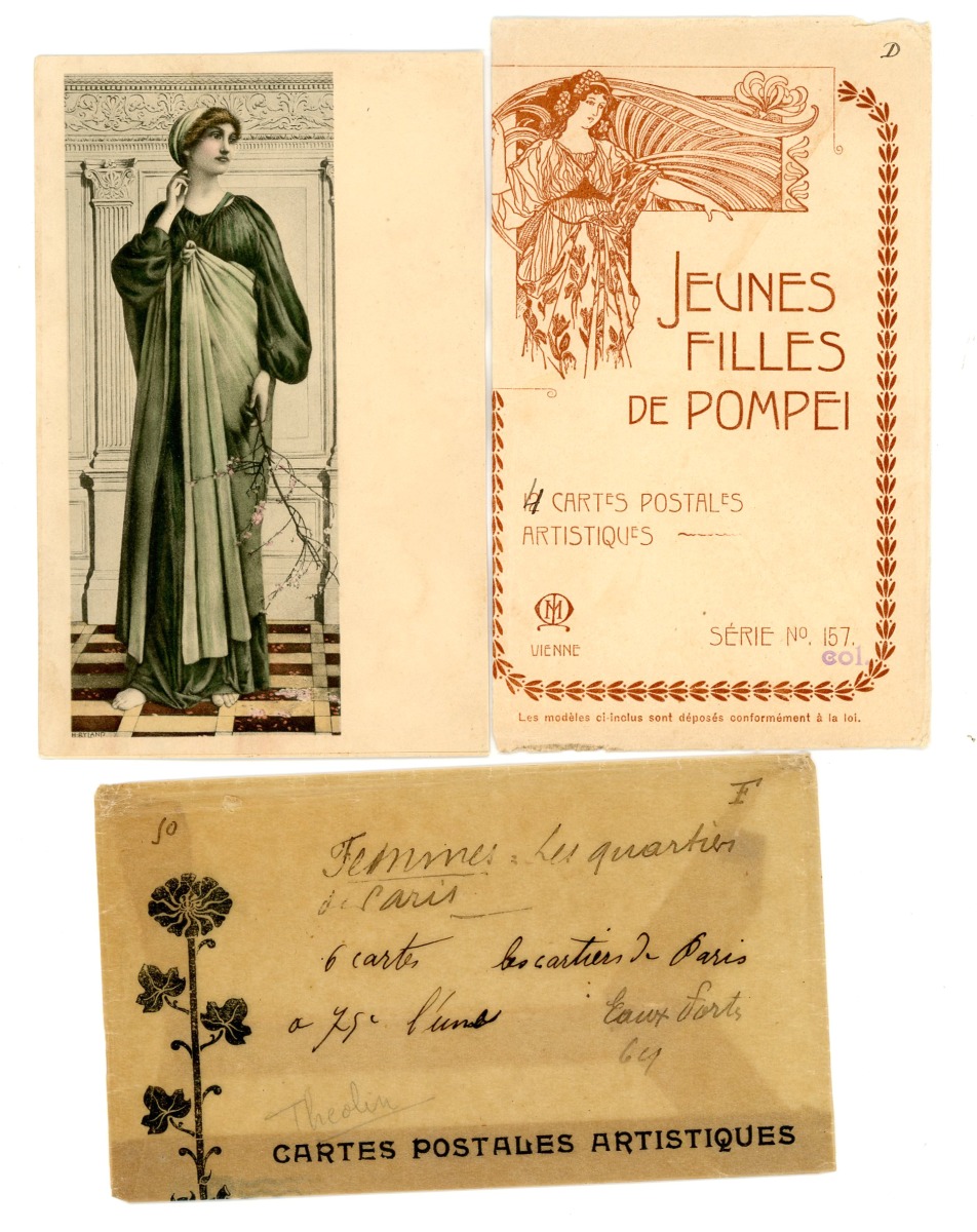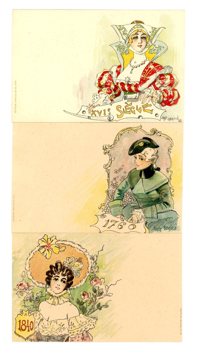 [ART NOUVEAU - ILLUSTRATEURS] 51 cartes postales artistiques, non circulées et non écrites, bon état, thèmes sur les femmes, dans le goût Art Nouveau, dont Gaston NOURY (série complète de 10 cp avec enveloppe pochette titrée " Les parfums à travers les âges "), Jack ABEILLE (série complète de 10 cp avec enveloppe pochette titrée " Les femmes à travers les siècles "), FREDILLO (suite de 9 cp artistiques), THEOLIN (6 cp femmes de Paris, eaux fortes), Gaston BUSSIERE (4 cp), Henry RYLAND (4 cp, dos recollés) avec enveloppe pochette titrée " Jeunes filles de Pompéi ", etc.