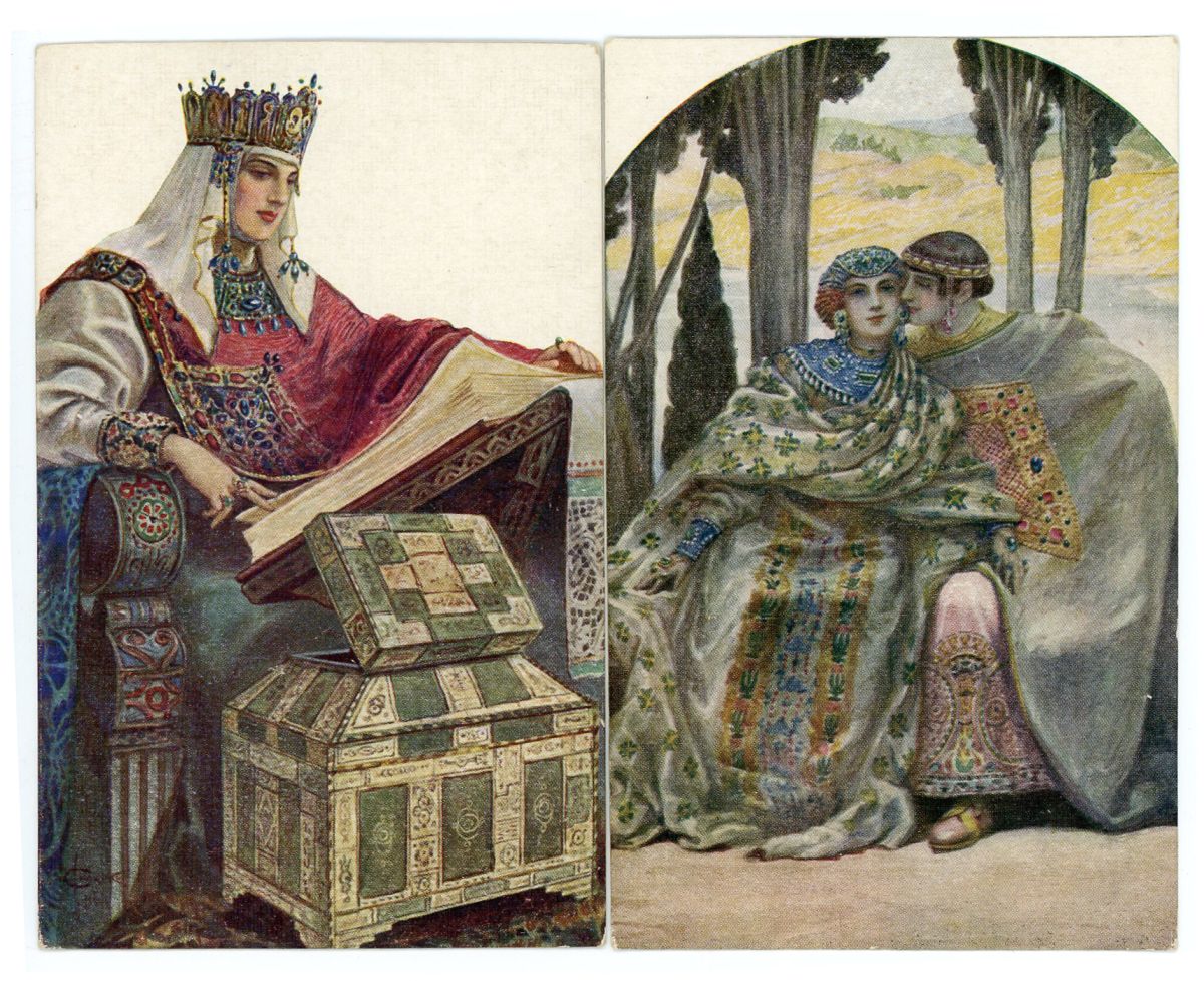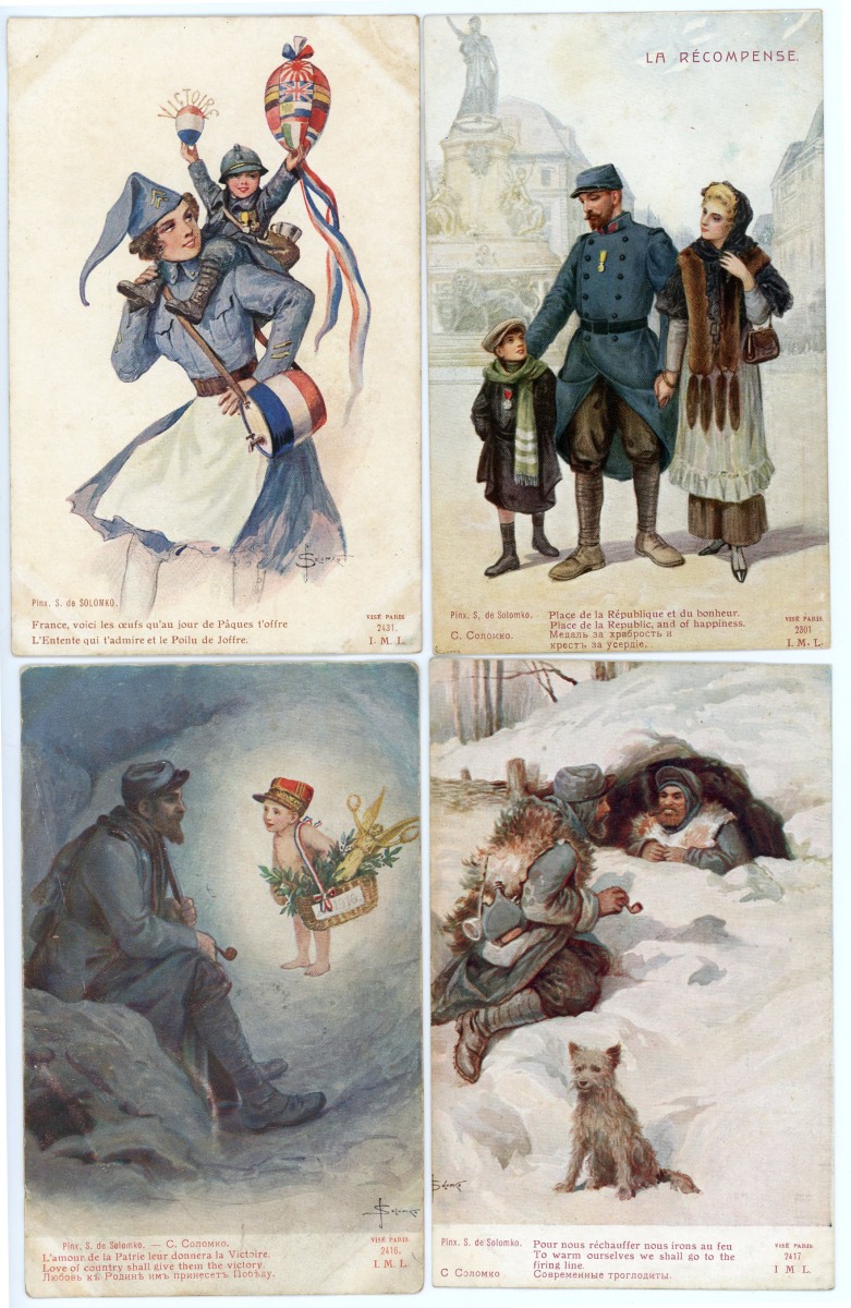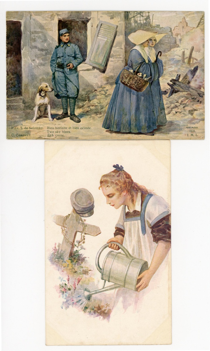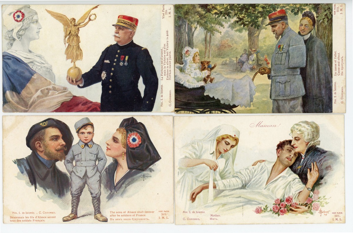 [ILLUSTRATEUR] 13 cartes postales illustrées par Serge de SOLOMKO (russe), en majorité non ni écrites ni voyagées: 11 cp (2 doubles) édition patriotique dont " Bleu horizon et bleu céleste ", " Place de la République et du bonheur ", " La Fortune est d'argent… mais la victoire est d'or ", Désormais les fils d'Alsace seront tous des soldats Français ", etc - 2 cp: " Idylle Byzantine ", Princesse Apraksia ".