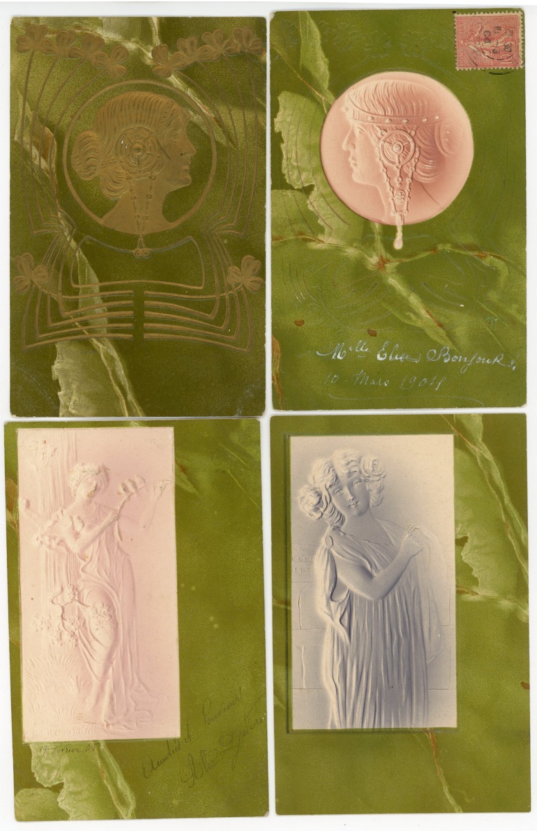 [ART NOUVEAU] 31 cartes postales gaufrées et illustrées dans le goût de Kirchner ou Mucha, thème de la femme. Portraits à l'antique ou à la byzantine sur fond blanc, or ou vert.