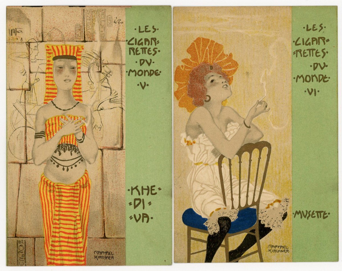 [ILLUSTRATEUR] Série complète de 6 cartes postales illustrées par Raphaël KIRCHNER, " Les Cigarettes du Monde ". Dos simple, ni écrites, ni voyagées, Bel état.