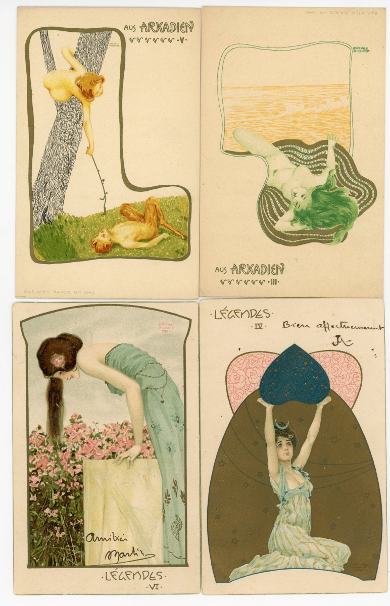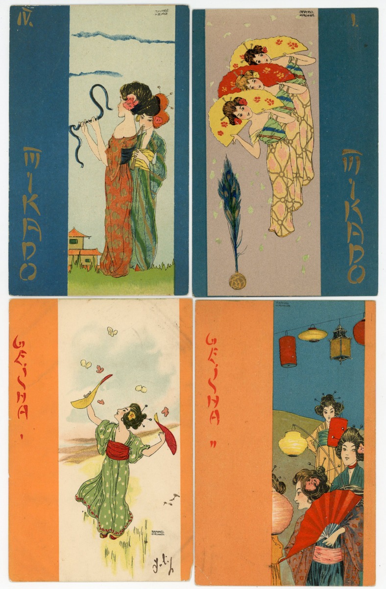 [ILLUSTRATEUR] 33 cartes postales illustrées par Raphaël KIRCHNER. Signées. Séries incomplètes et cartes isolées. Toutes différentes, en majorité écrites et voyagées, états divers: Geisha [2 cp - I et II] - Mikado [2 cp - I et IV] - Aus Arkadien [2 cp - III et V - Non écrites ni voyagées - Bel état] - A quatre feuilles [5 cp - en l'état] - Portraits de dames viennoises [2 cp] - Girls and flowers [2 cp] - Enfants de la mer [2 cp - VIII et IX] - Légendes [2 cp - IV et VI] - Soleil - La favorite - Hinter den Coulissen [IX - Non écrite ni voyagée] - Femmes, fond bistre [4 cp] - Femme à la cigarette - Fleurs d'amour - Chute de vélo - Princesse Riquette - L'Escarpolette - Maud cambrioleuse - La Mer Fleurie.