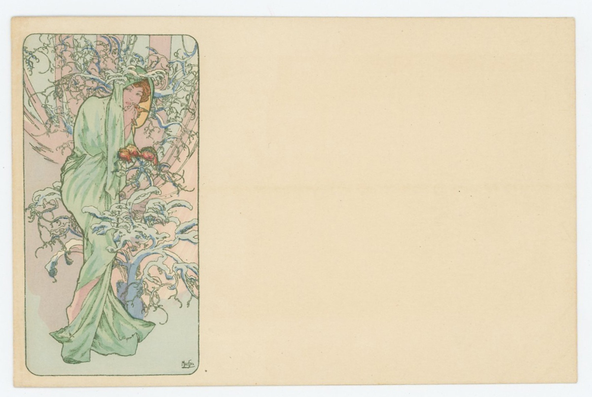 [ILLUSTRATEUR] Suite complète de 4 cartes postales artistiques illustrées par Alfons MUCHA, " Les Saisons ", 1ère série, c. 1900: le Printemps (petite tâche), l'Été, l'Automne, l'Hiver. Ni écrites, ni voyagées. Très bel état.