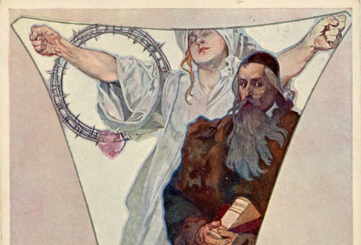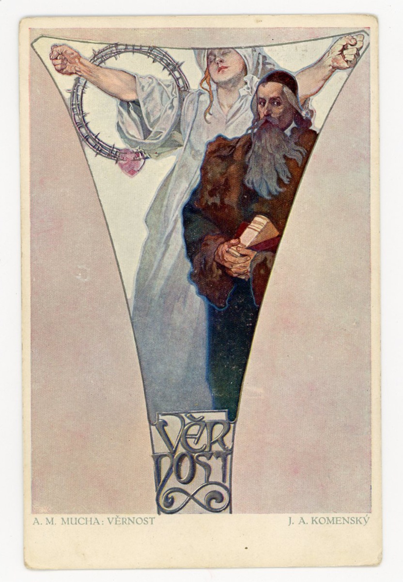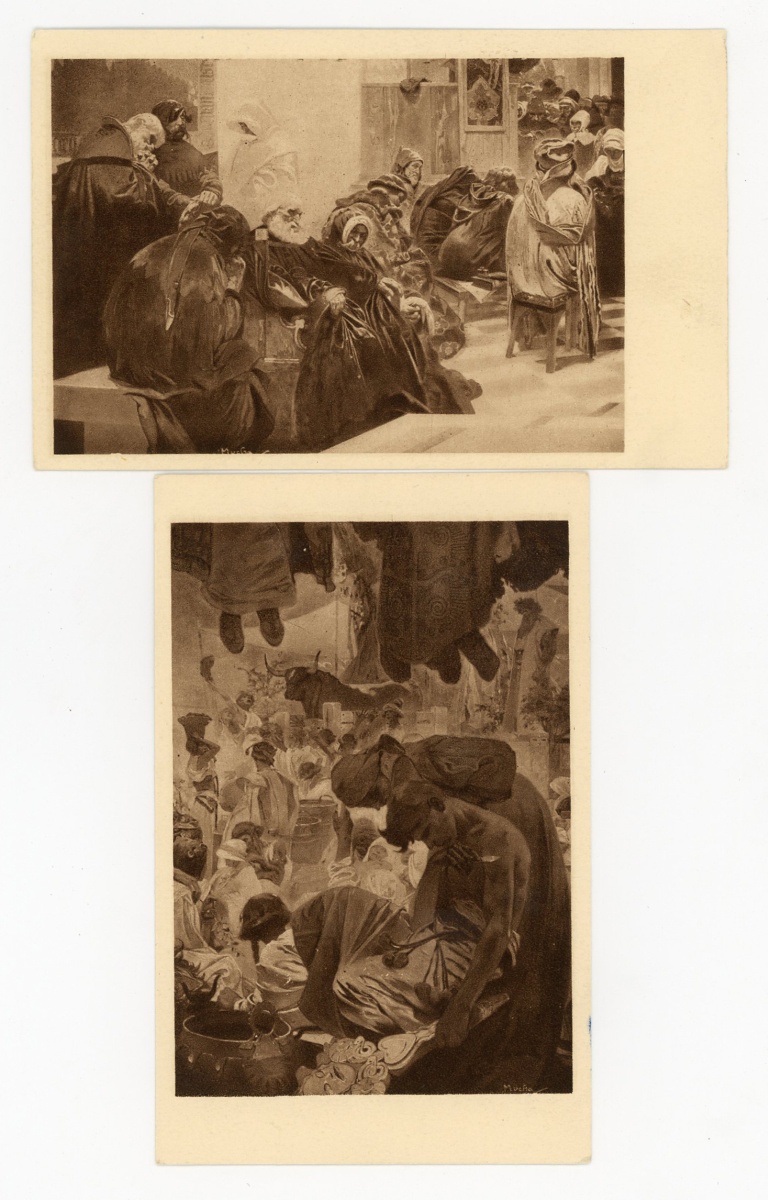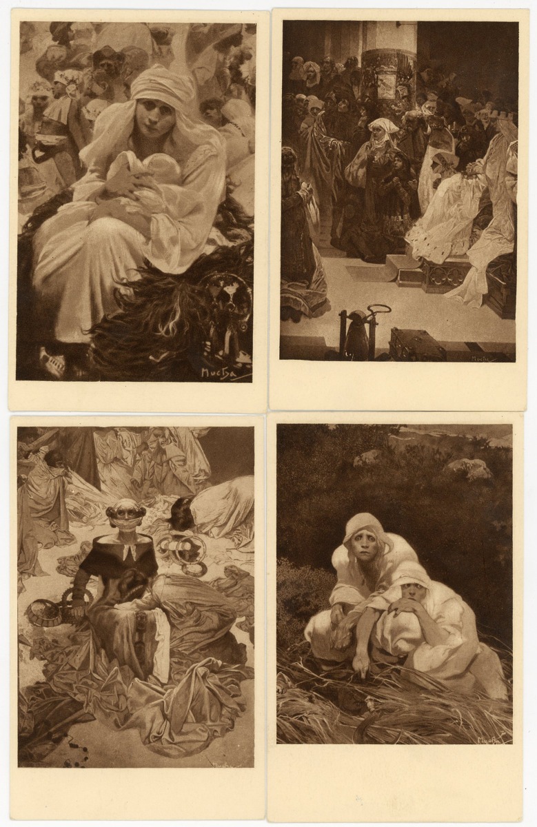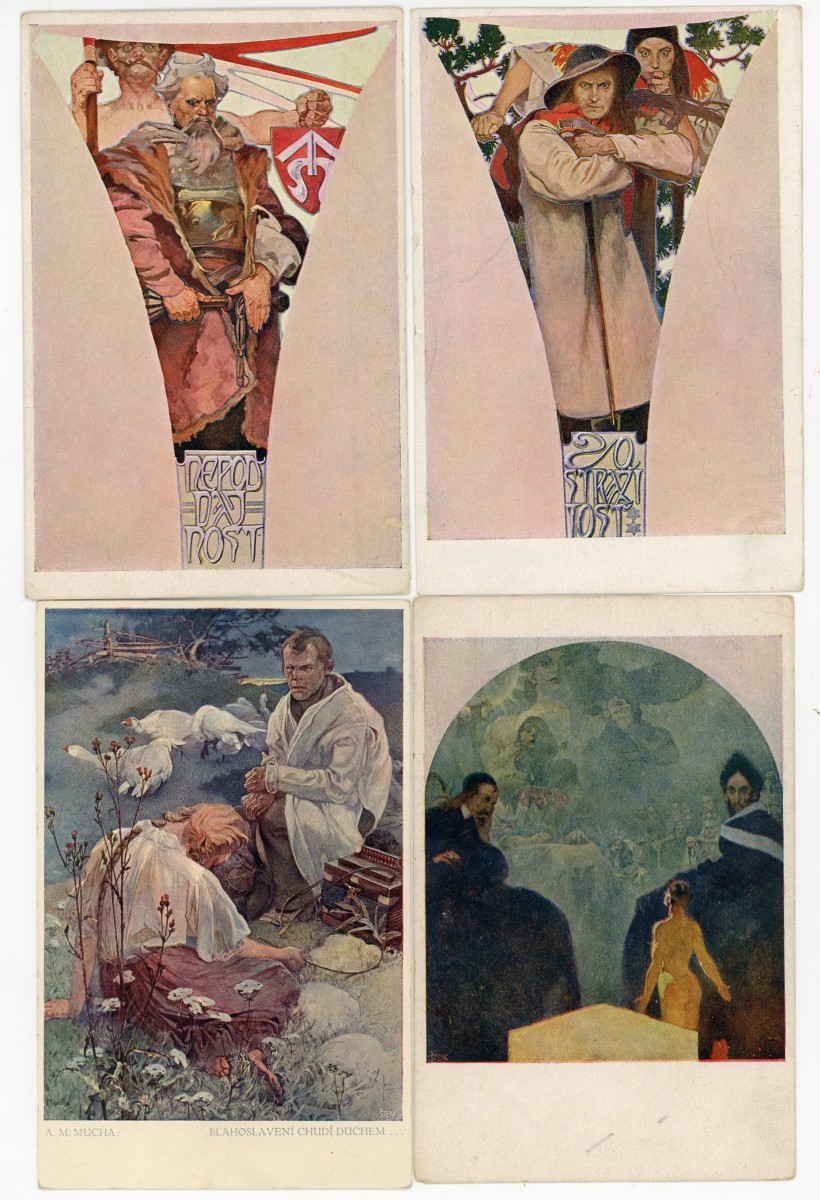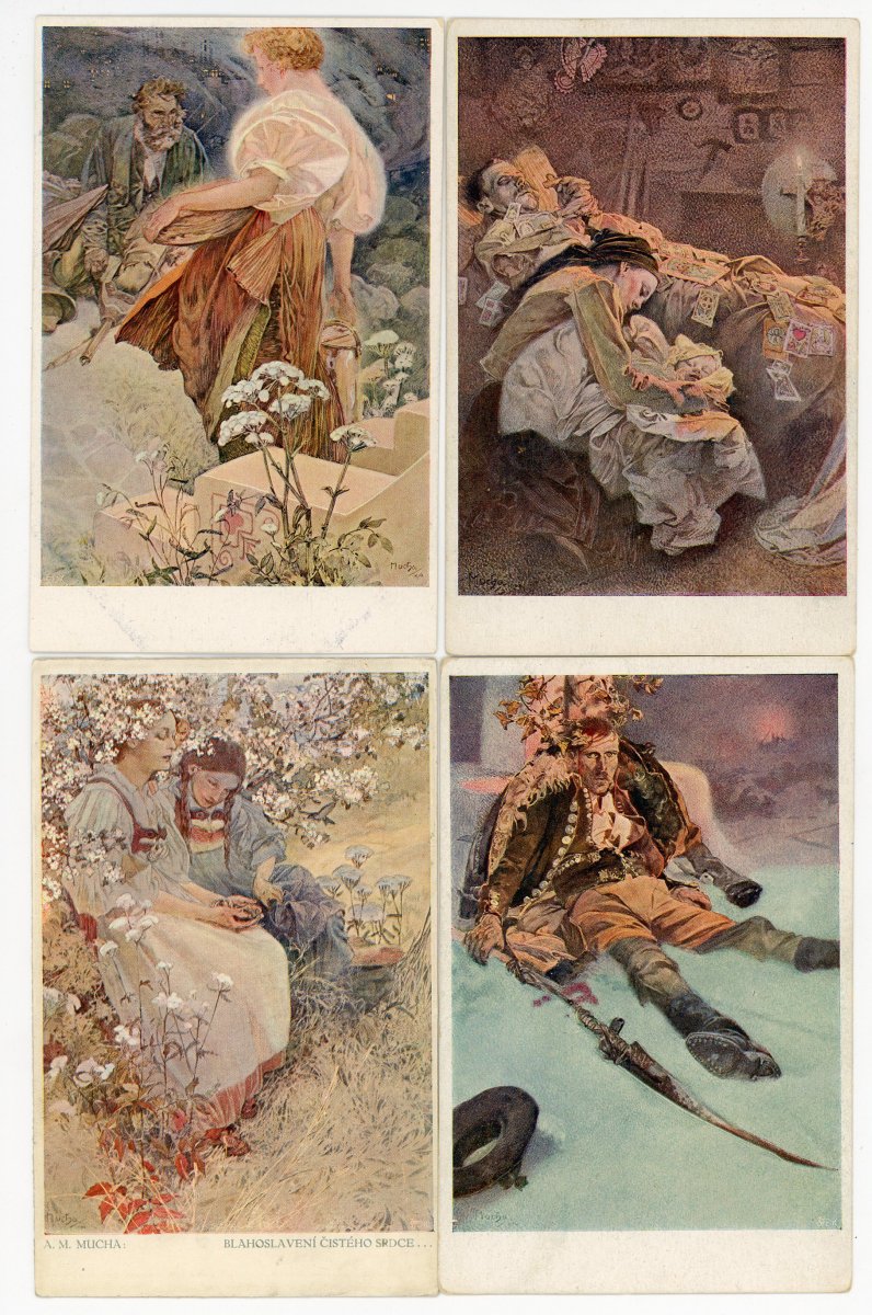 [ILLUSTRATEUR] 15 cartes postales illustrées par Alfons MUCHA, Époque Tchécoslovaque, représentant des sujets historiques et mythologiques slaves, années 1920: l'évêque J.A. Komensky (L. Notvony Praha ; écrite et voyagée) - Suite complète de 6 cp de la série " Slovanska Epopeje " (Hollarotypie-Neubert ; ni écrite, ni voyagée) - 5 cp de la série Blahoslaveni [Heureux ceux qui sont