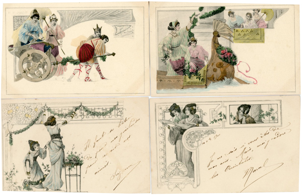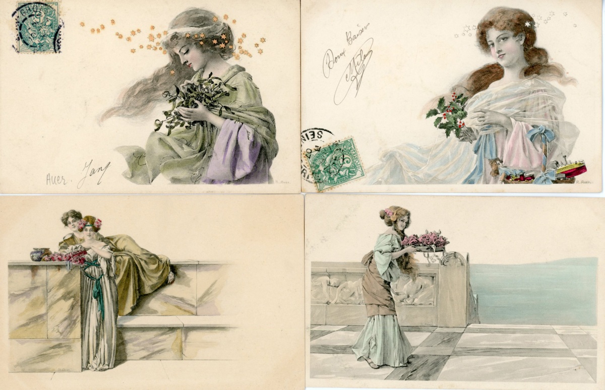 [ILLUSTRATIONS] 72 cartes postales anciennes, " Viennoises " et type Viennoises, thématique de l'Antiquité grecque et mythologie ; divers éditeurs dont MM VIENNE [26 cp], et illustrateurs dont " R. AUER " (Robert) [5 cp] ; couleurs et noir & blanc, gaufrées et qqs doubles.