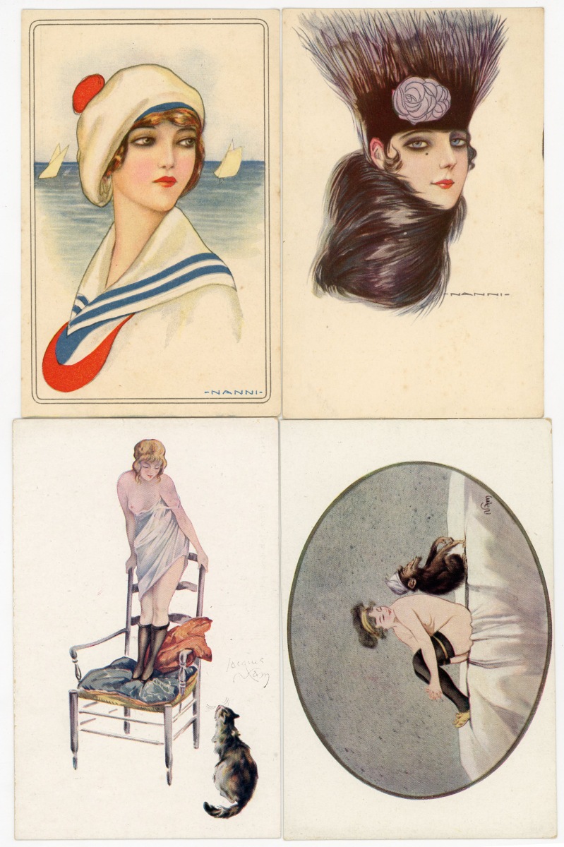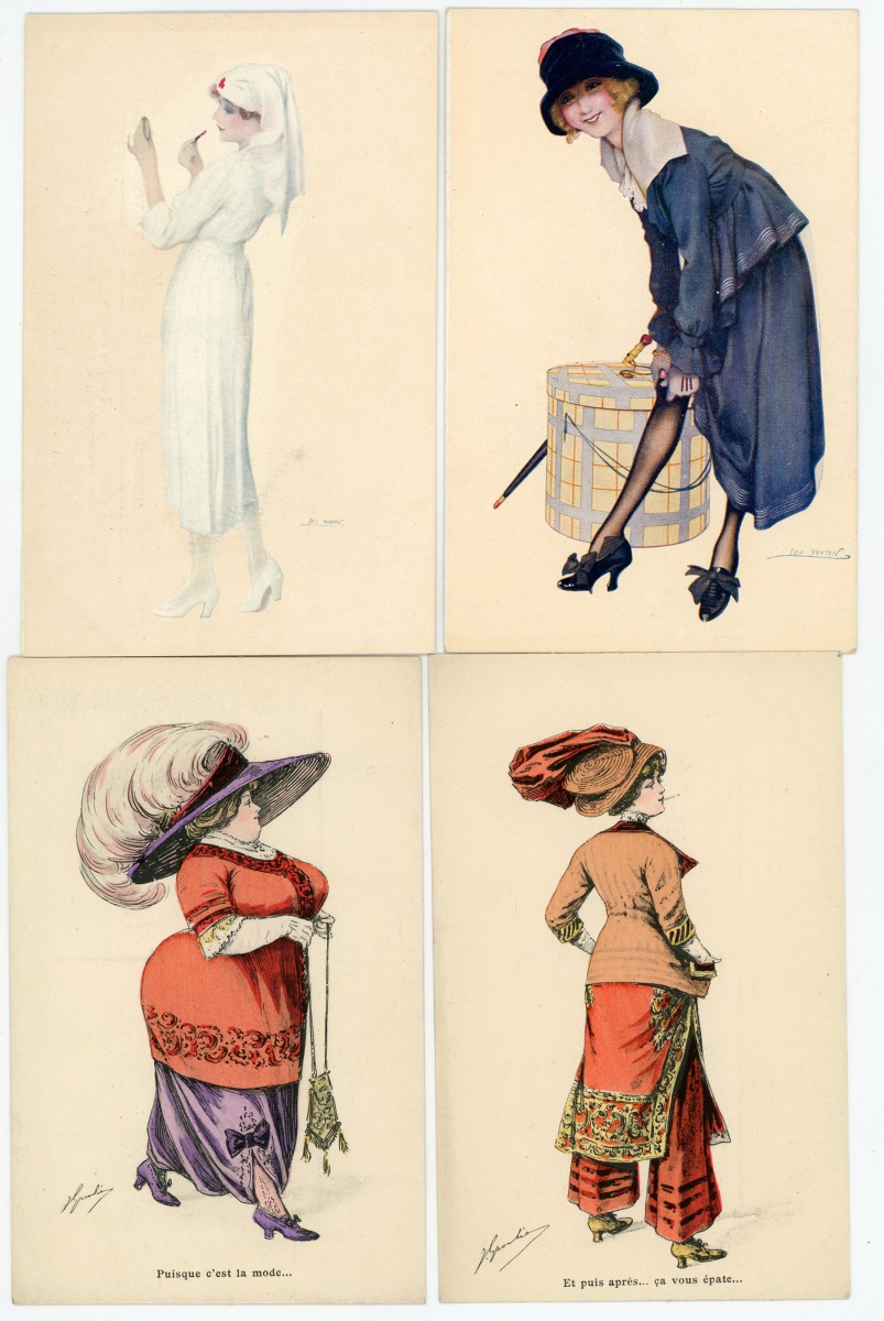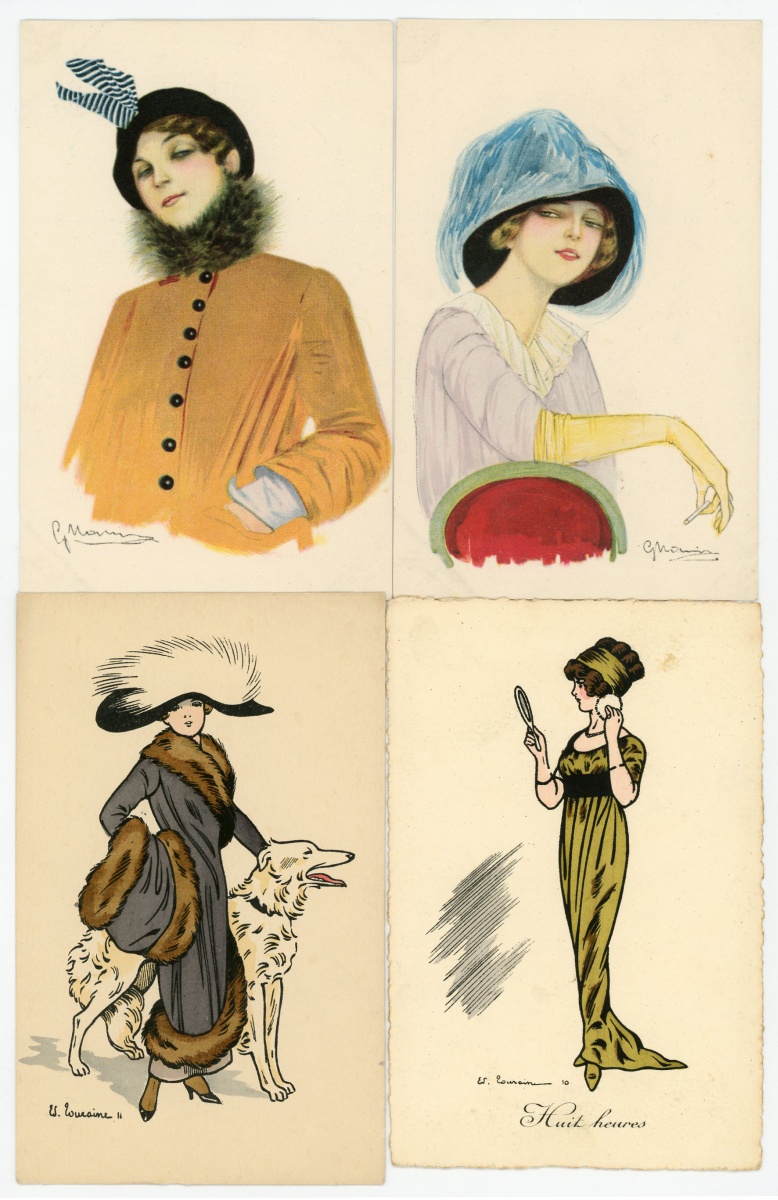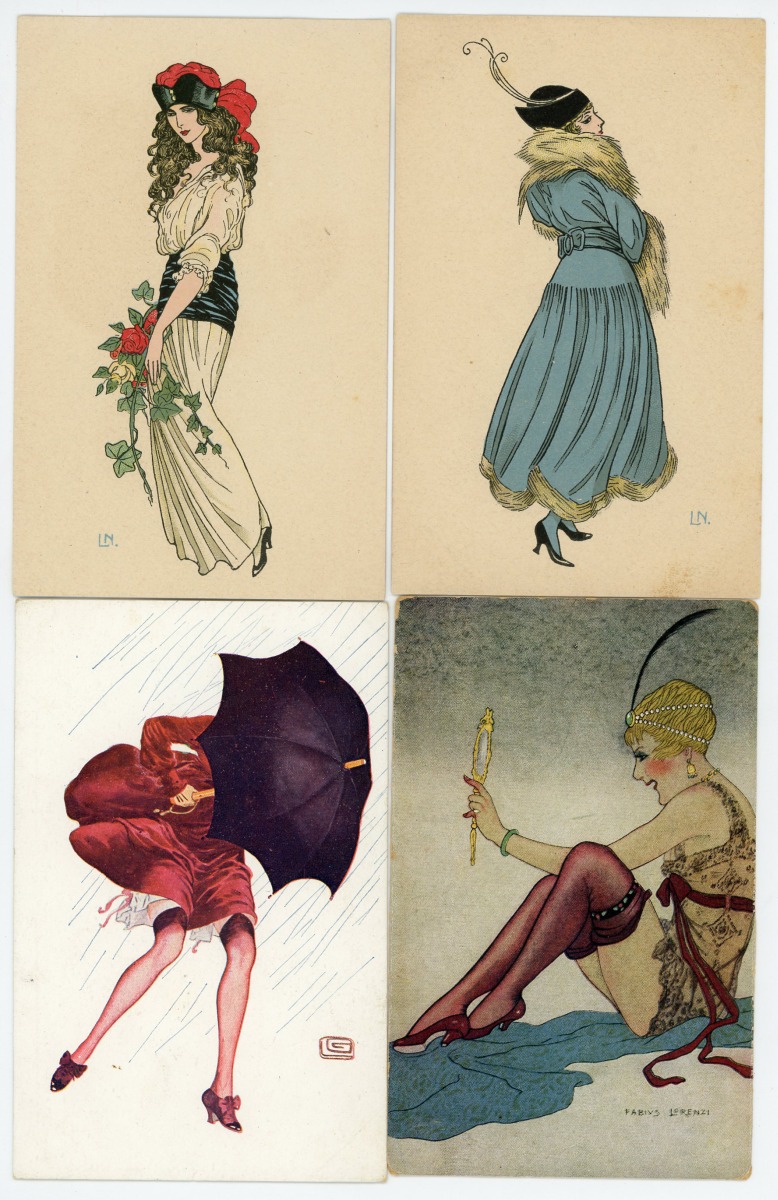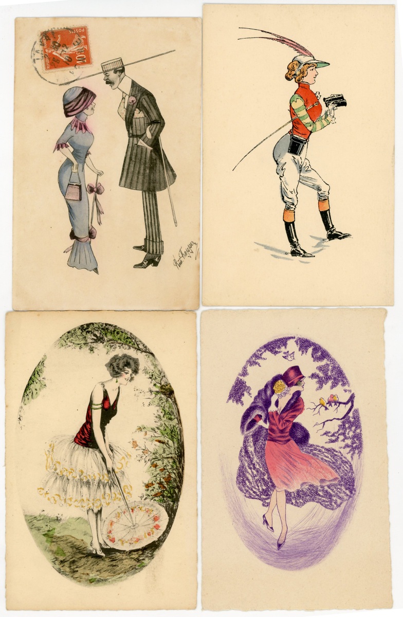 [ILLUSTRATEURS] Réunion de + de 695 cartes postales anciennes et cpsm, thème de la Femme et de la Mode, illustrateurs et illustrations, vers 1900-1930, toutes différentes, certaines peintes à la main, dont: Jack ABEILLÉ [3 cp] ; ALBERTINI [1 cp] ; ALICE [1 cp] ; " B. " [6 cp] ; Carlos BADT [6 cp] ; Gil BAER [2 cp] ; BALBO DEL VELLA [1 cp] ; BECK [1 cp] ; Alberto BERTIGLIA [6 cp] ; BIANCA [1 cp] ; BIANCHI [4 cp] ; BOB [1 cp] ; Philip BOILEAU [11 cp] ; S. BOMPARD [4 cp] ; Henri BOUTET? [1 cp] ; Wh. BRAUN [5 cp] ; BRIARÉE [3 cp] ; Ethel C. BRISLEY [13 cp] ; Adolfo BUSI [8 cp] ; Arthur BUTCHER [8 cp] ; G. CALDANA [4 cp] ; C. CALDERARA [2 cp] ; Elda CENNI [1 cp] ; CEOLOMBO [3 cp] ; CHIOSTRI [1 cp] ; P. Earl CHRISTY [3 cp] ; T. CORBELLA [44 cp] ; CREMIEU [1 cp] ; Géo DESAIN [2 cp] ; DOUKY [3 cp] ; DROG [7 cp] ; A. EICHENBERG [2 cp] ; Edy PARIS [15 cp] ; FERN [4 cp] ; FIDLER [4 cp] ; Harrison FISHER [4 cp] ; R. FRANZONI [9 cp] ; Léo FONTAN [3 cp] ; GIRIS [4 cp] ; GUNN [1 cp] ; J. HARDY [5 cp] ; HEROUARD [6 cp] ; Knut HANSEN [2 cp] ; R. Ford HARPERG [4 cp] ; Helena HORWITZ [1 cp] ; Martin KAVEL [1 cp] ; Mela KOEHLER [1 cp] ; KOISTER [2 cp] ; R. KRATKI [3 cp] ; JULIA [1 cp] ; de JUYNE [1 cp] ; François LAFON [6 cp série La Jupe Culotte] ; Georges LEONNEC [4 cp] ; Ralph LESTER [1 cp] ; " E. LESUR " [1 cp] ; " LN " [5 cp] ; Fabius LORENZI [1 cp] ; Law LUXON [1 cp] ; " G.M. " [11 cp] ; F. MADI [4 cp] ; Frederiks MANNING [3 cp] ; Henri MANUEL [5 cp] ; Achille MAUZAN [35 cp] ; ; G. MESCHINI [7 cp] ; MEDSILLE [1 cp] ; Suzanne MEUNIER [12 cp] ; MIARKO [2 cp] ; MILLE [6 cp] ; Maurice MILLIERE [5 cp] ; MIKI [31 cp] ; A. MOLYNK [1 cp] ; MAGGY MONIER [12 cp] ; M. MONTEDORO [1 cp] ; MORIN [1 cp] ; Marjorie MOSTYN [2 cp] ; Georges MOUTON [7 cp] ; Charles NAILLOD [27 cp] ; Jacques NAM [2 cp] ; Giovanni NANNI [13 cp] ; A.A. NASH [1 cp] ; Max NINON [1 cp] ; E. OCCHIPINTI [2 cp] ; V. ORLANDI [1 cp] ; Sophie PADNEY [4 cp] ; S. PAVY [4 cp] ; PENY [2 cp] ; PERO [3 cp] ; PLUM [17 cp] ; PINOCHI [8 cp] ; PREJELAN [1 cp] ; N. RAME [1 cp] ; RAPPINI [6 cp] ; Alexandre de RIQUER [4 cp] ; E. ROUSSELET [1 cp] ; L. ROSA [1 cp] ; ROBERTY [22 cp] ; SAN MARCO [4 cp] ; SANTINO [6 cp] ; Jean TAM [4 cp] ; Edouard TOURAINE [4 cp] ; Clarence F. UNDERWOOD [7 cp] ; VAL [1 cp] ; VALERIS [2 cp] ; F. VECCHI [1 cp] ; VILLA [2 cp] ; P. VILLANI [4 cp] ; A. WUYTS [2 cp] ; WILL [1 cp] ; WILLY [4 cp] ; etc.