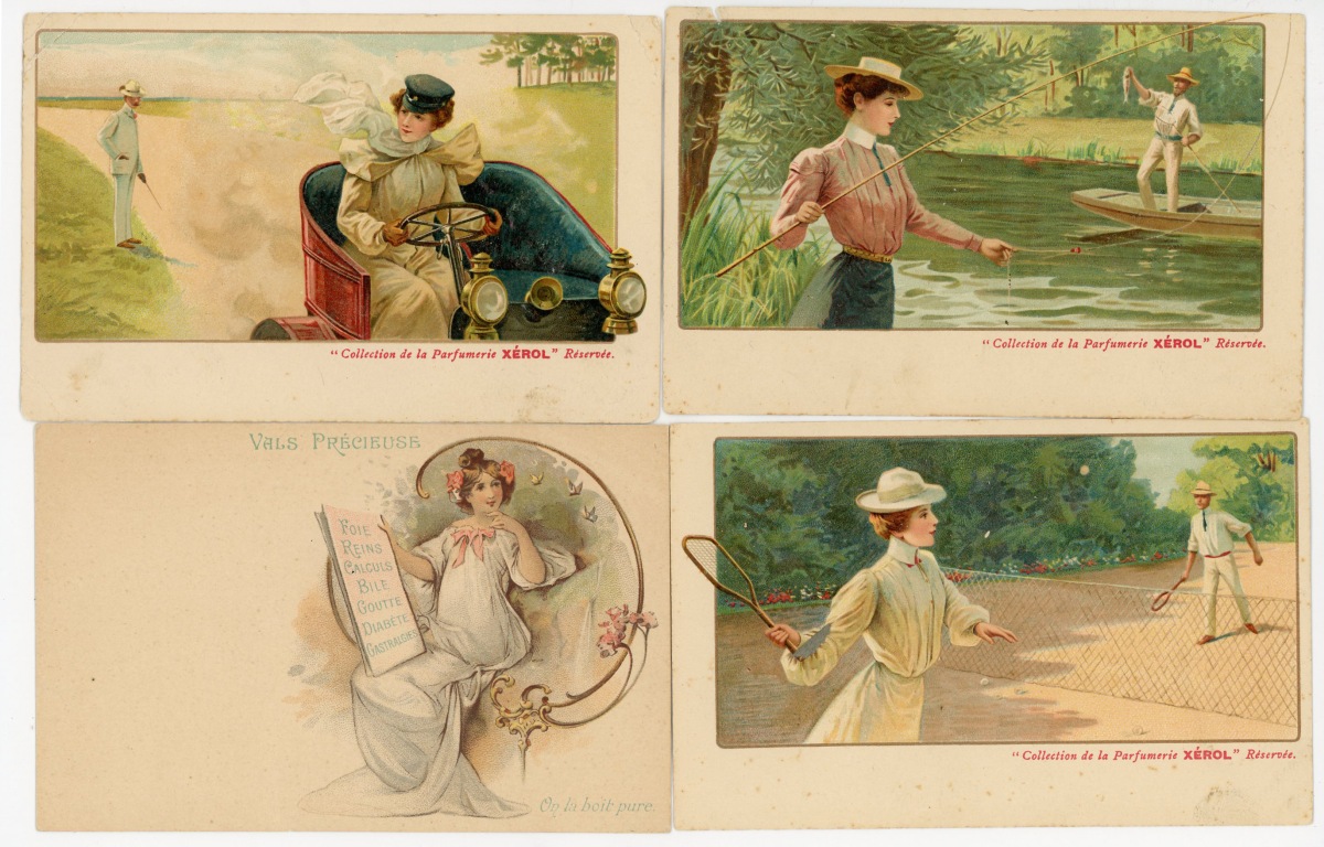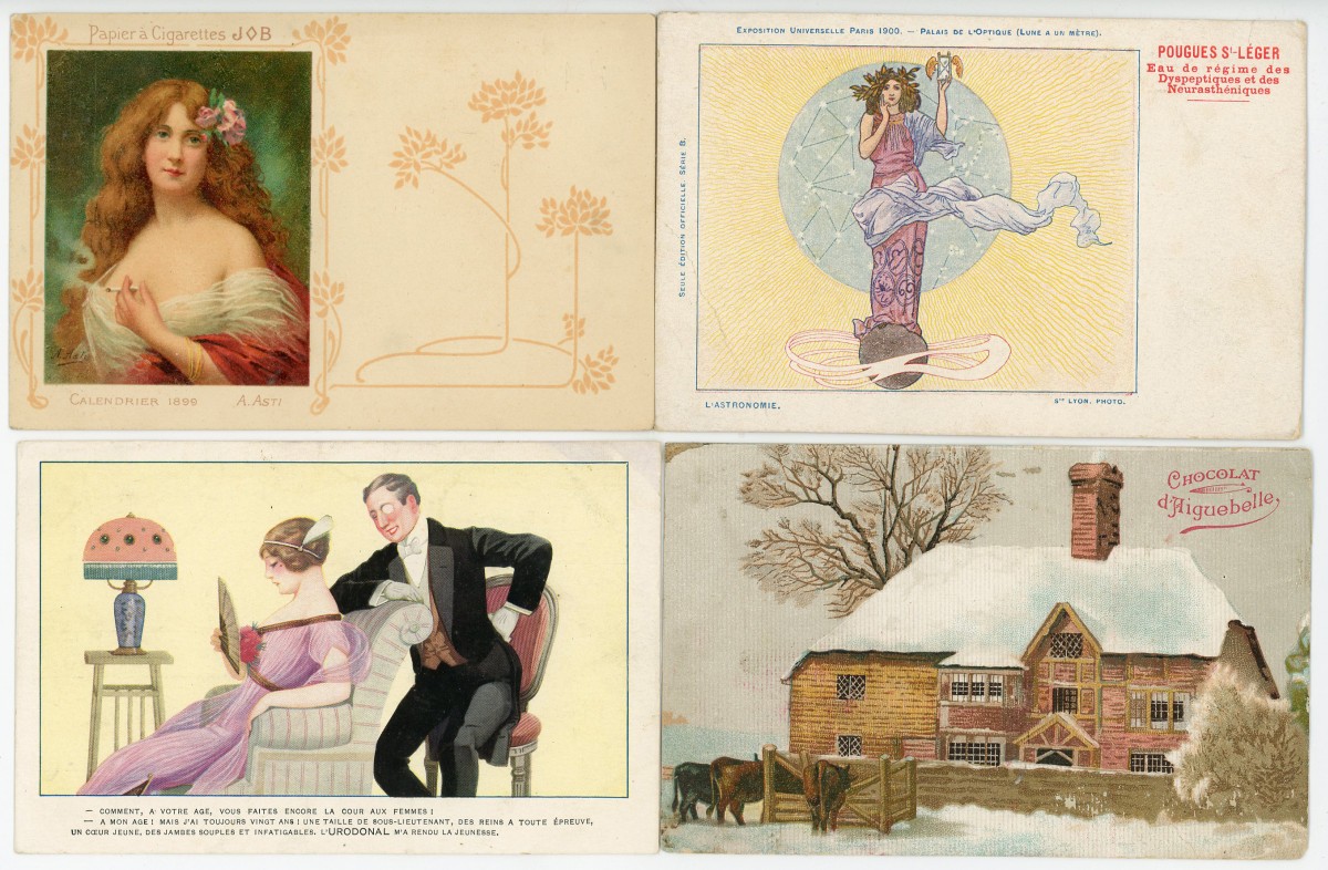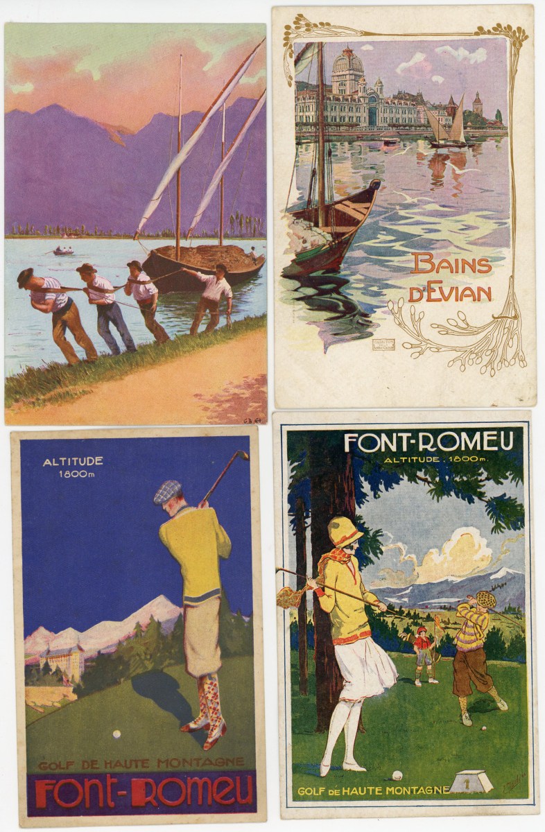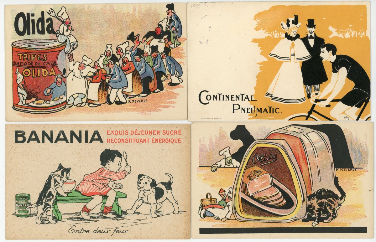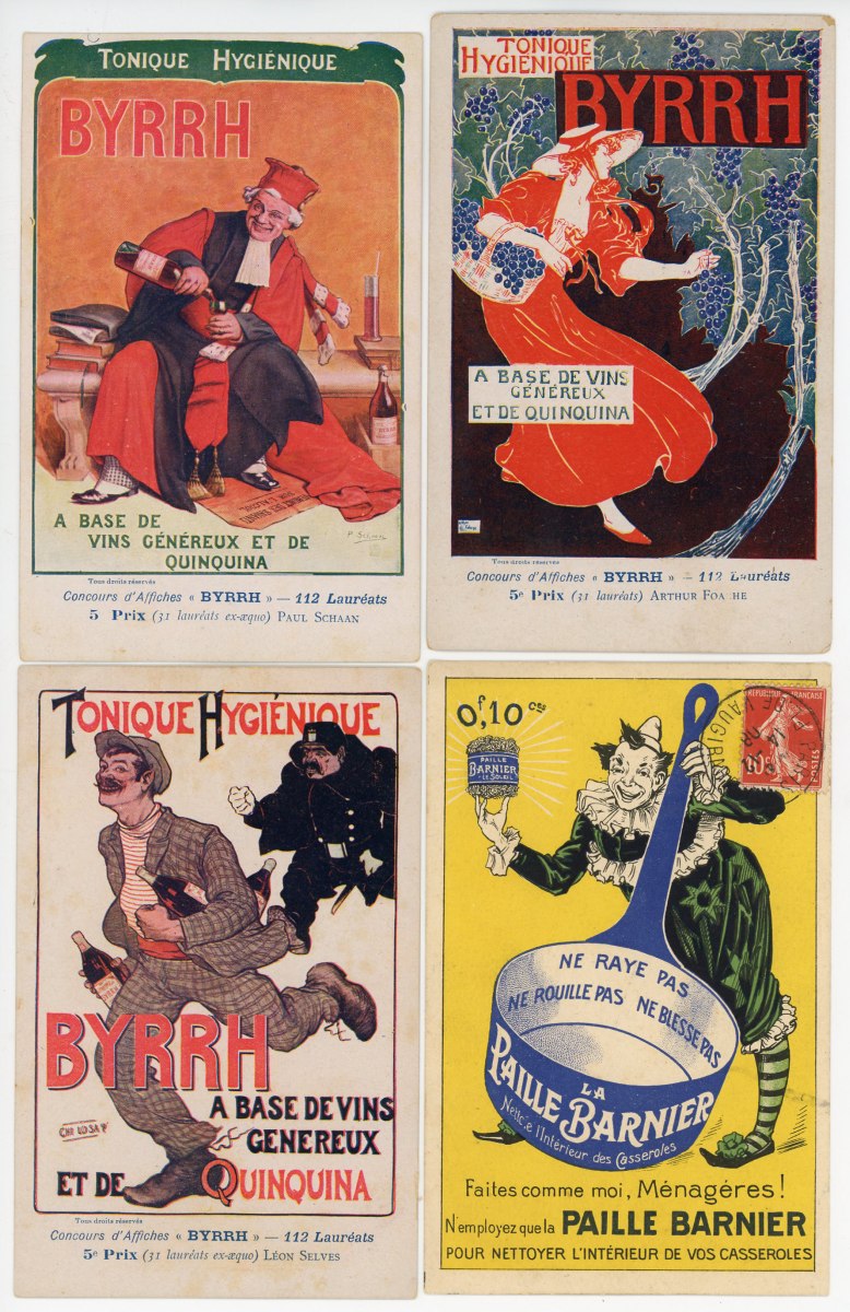 [ILLUSTRATIONS] 80 cartes postales anciennes et cpsm, thème de la publicité: " Concours d'affiches BYRRH " [3 cp] - " Vals Précieuse " [4 cp] - " Moteurs Ballot " [4 cp] - " Olida " par R. REVERDY [2 cp] - " Au Bon Marché, Maison A. Boucicaut, Paris " par H. GRAY [2 cp] - " Chocolat Lombart, Paris " [2 cp] - " Cacao Bensdorp " - " New Home " - " Banania " -"Collection de la Source Cachat / Evian-Les-Bains " [9 cp] - " Chaussures Raoul " [3 cp] - " Cacao Suchard " [2 cp] - " Compagnie de Saint Gobain " -" Chocolat Lindt, Chocolat Sprüngli " - " Biscuits Nantais Ducasse & Guibal " [2 cp] - etc.