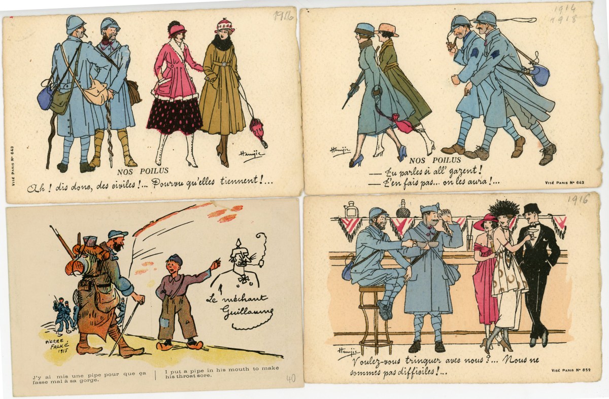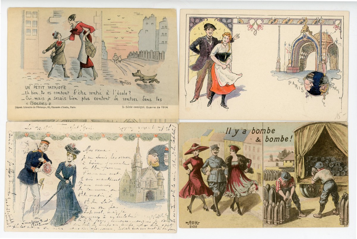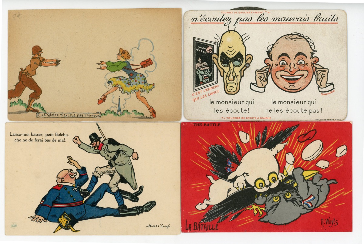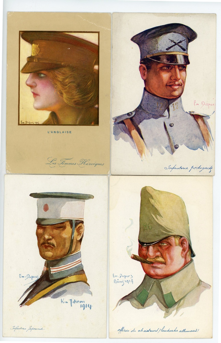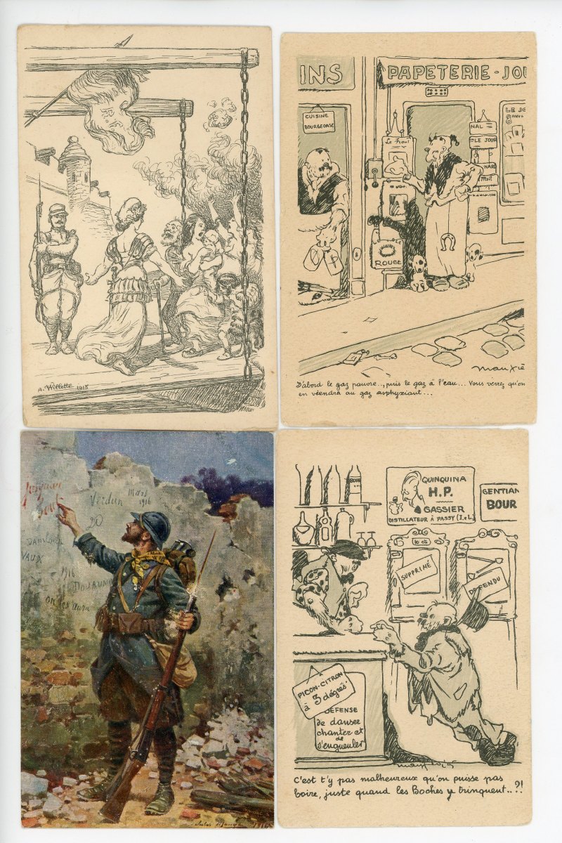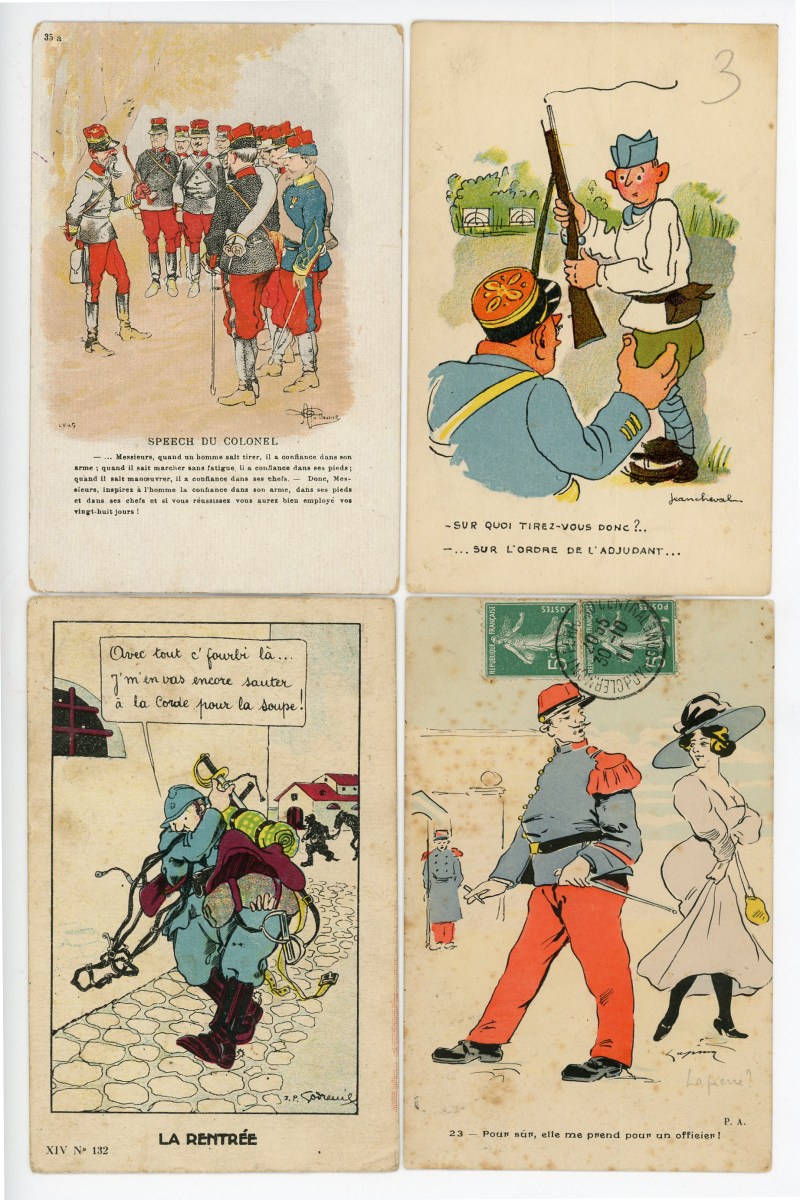 [MILITARIA] env. 395 cartes postales anciennes et qqs cpsm, Militaria et Guerre 14-18: satiriques et patriotiques, illustrateurs et illustrations dont: Em Dupuis [49 cp], André Soriac [14 cp dont 2 écrites et signées par Soriac], Edy [10 cp], A. Bertiglia [9 cp], F. Chamouin [8 cp], B. de Guinbald [8 cp], Hemjic [6 cp], Arthur Foache [4 cp], C. Maréchaux [4 cp], Bergère [4 cp], Willette, Manfredini, Falké, Moriss, Paracini [4 cp], etc.