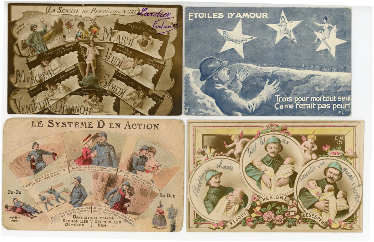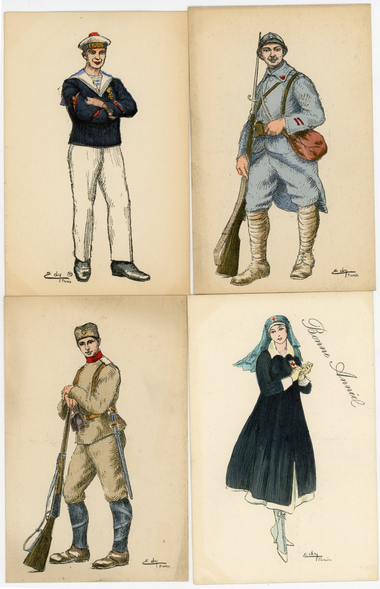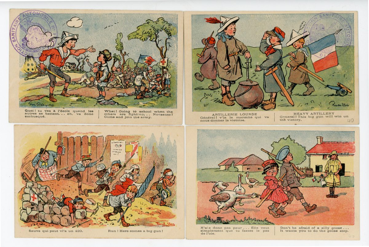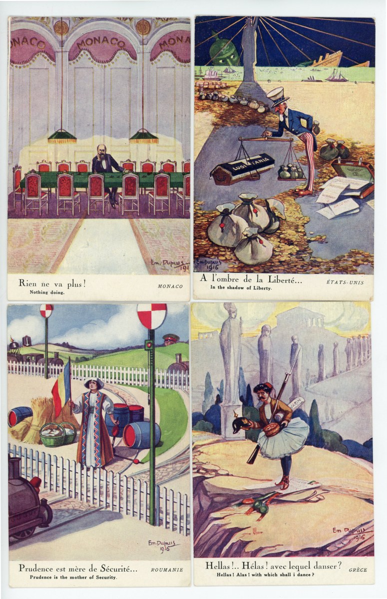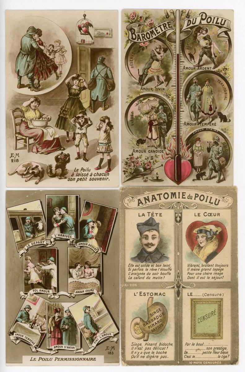 [MILITARIA] env. 395 cartes postales anciennes et qqs cpsm, Militaria et Guerre 14-18: satiriques et patriotiques, illustrateurs et illustrations dont: Em Dupuis [49 cp], André Soriac [14 cp dont 2 écrites et signées par Soriac], Edy [10 cp], A. Bertiglia [9 cp], F. Chamouin [8 cp], B. de Guinbald [8 cp], Hemjic [6 cp], Arthur Foache [4 cp], C. Maréchaux [4 cp], Bergère [4 cp], Willette, Manfredini, Falké, Moriss, Paracini [4 cp], etc.