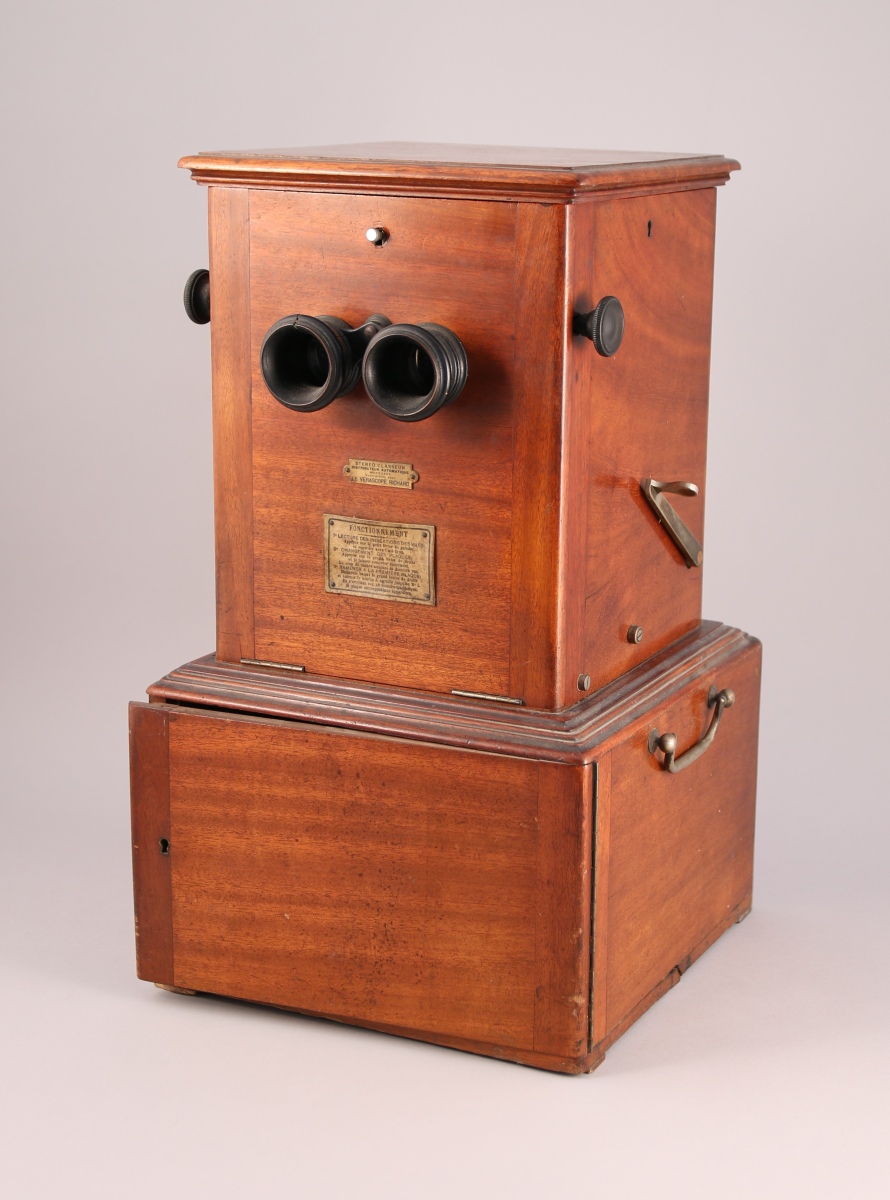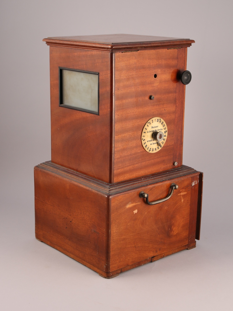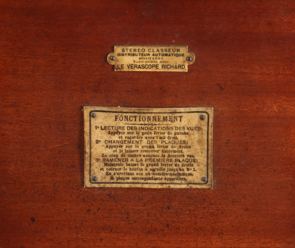 VERASCOPE Jules RICHARD. Borne visionneuse stéréo classeur "distributeur automatique" en acajou sapelli pour VUES STRÉRÉOSCOPIQUES.