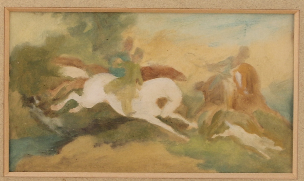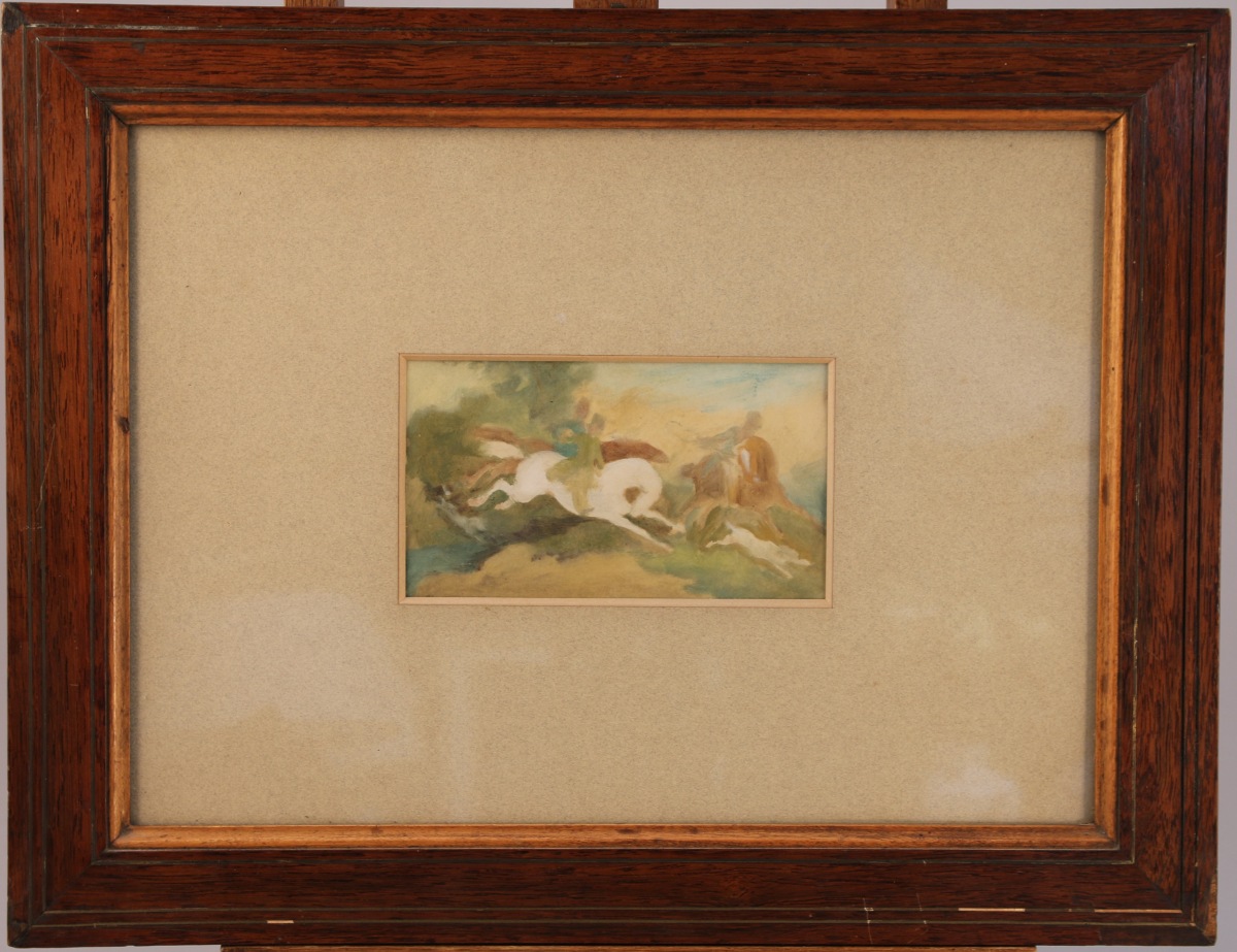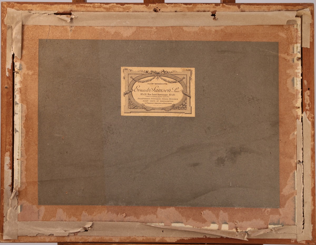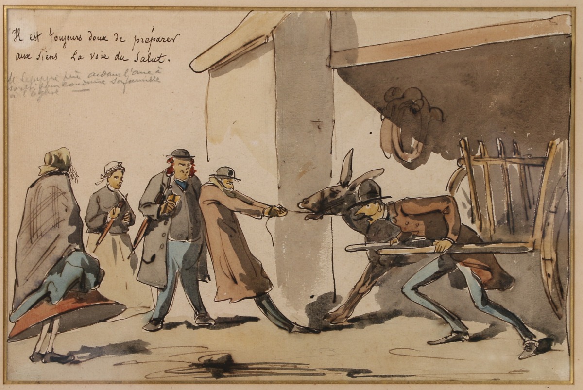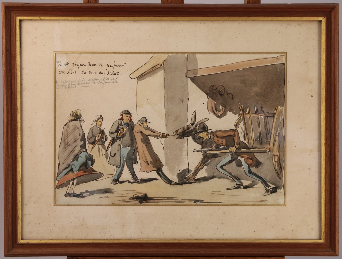 JOINT: École FRANÇAISE (XIX-XXe). "Il est toujours doux de préparer aux siens la voie du Salut / Le (?) père aidant l'âne à sortir pour conduire sa famille à l'église. Aquarelle. Haut. 22, Larg. 33,5 cm.
