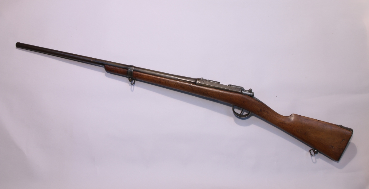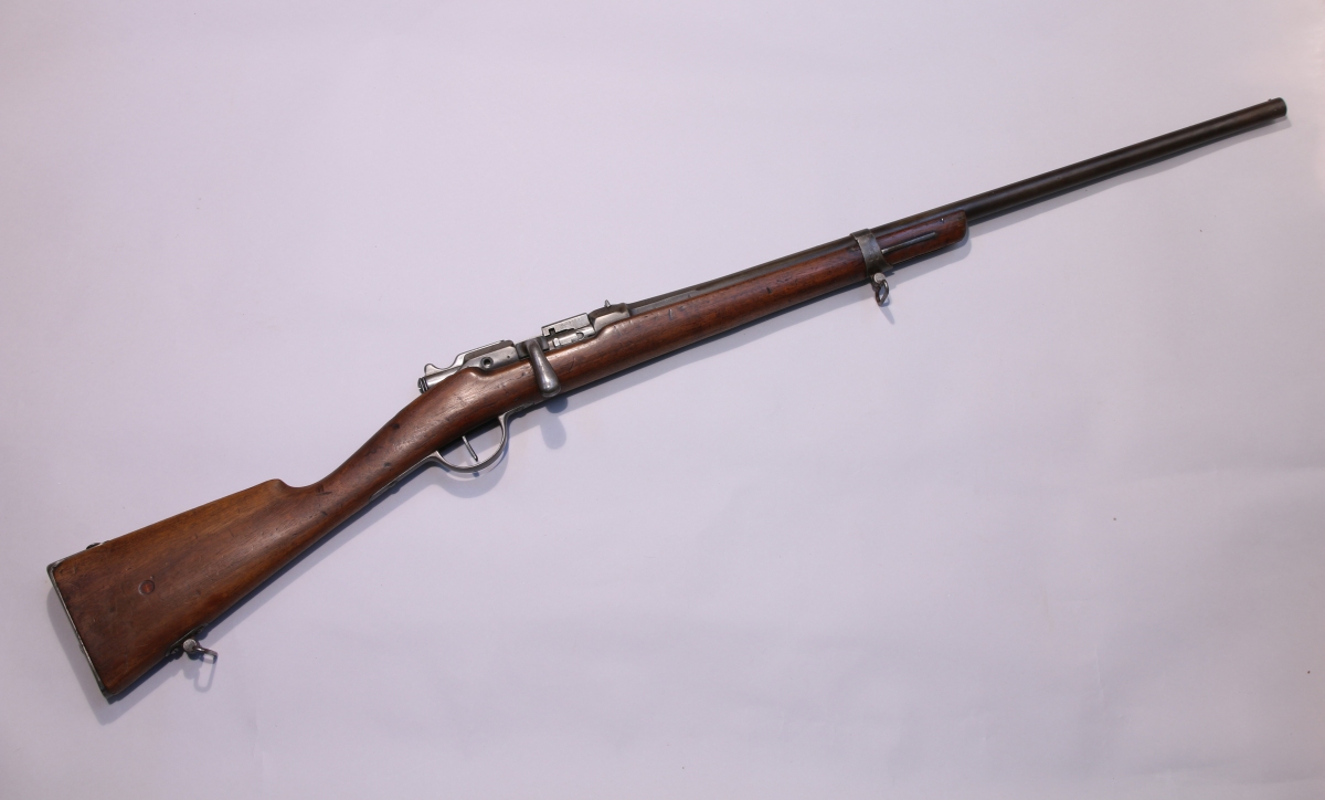 FUSIL D'INFANTERIE CHASSEPOT modifié GRAS 1866-74, calibre 15 mm composite. Boîtier de culasse marqué "Manufacture d'armes de Châtellerrault, 1876". Crosse en noyer.