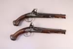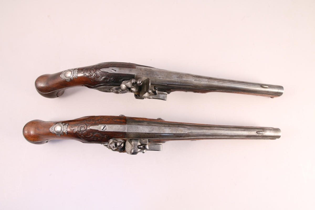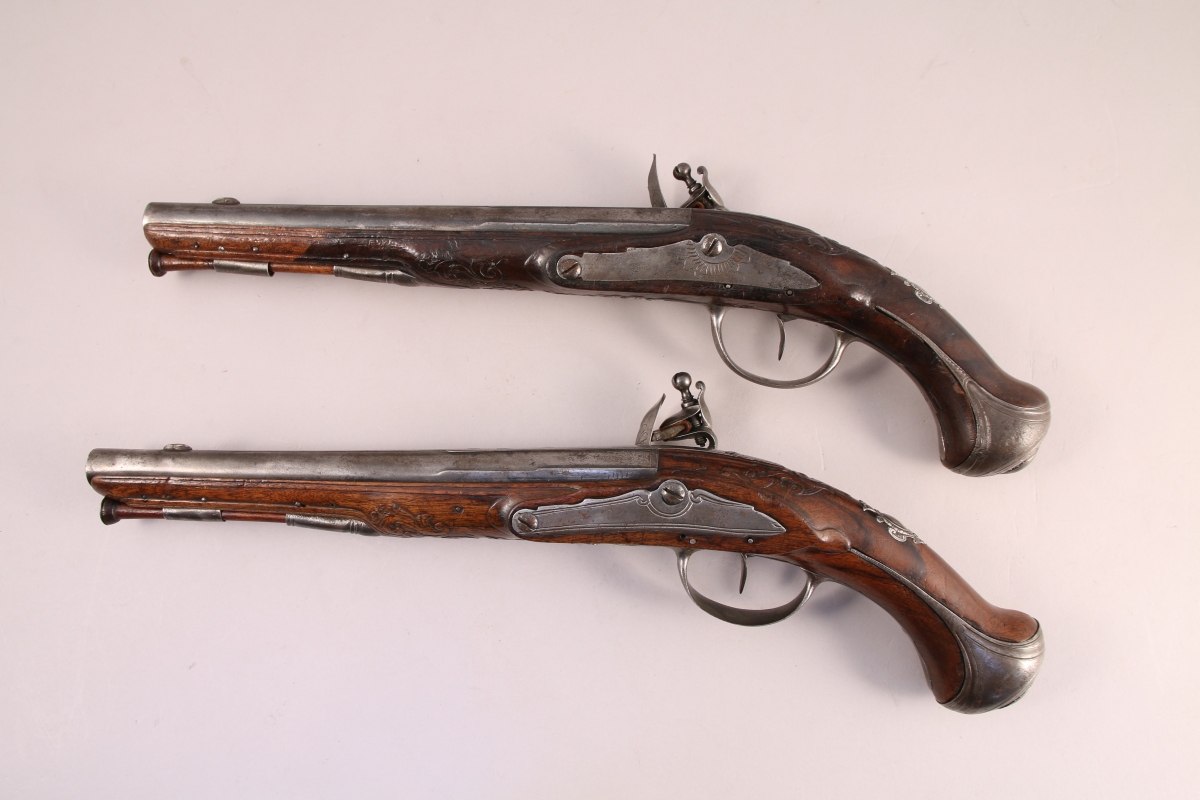Paire de PISTOLETS à silex par Jean Griottier à Saint-Etienne, deuxième quart du XVIIIe siècle. Canons ronds décorés (Long. 24 cm - Cal. 15 mm). Platines à corps et chien plats, gravées d'allégories et de rinceaux et signées JEAN / GRIOTTIER. Montures à fût long en noyer, moulurées et légèrement sculptées. Pièce de pouce en argent découpé orné d'une couronne de Marquis. Baguette avec tête en fer (postérieures).