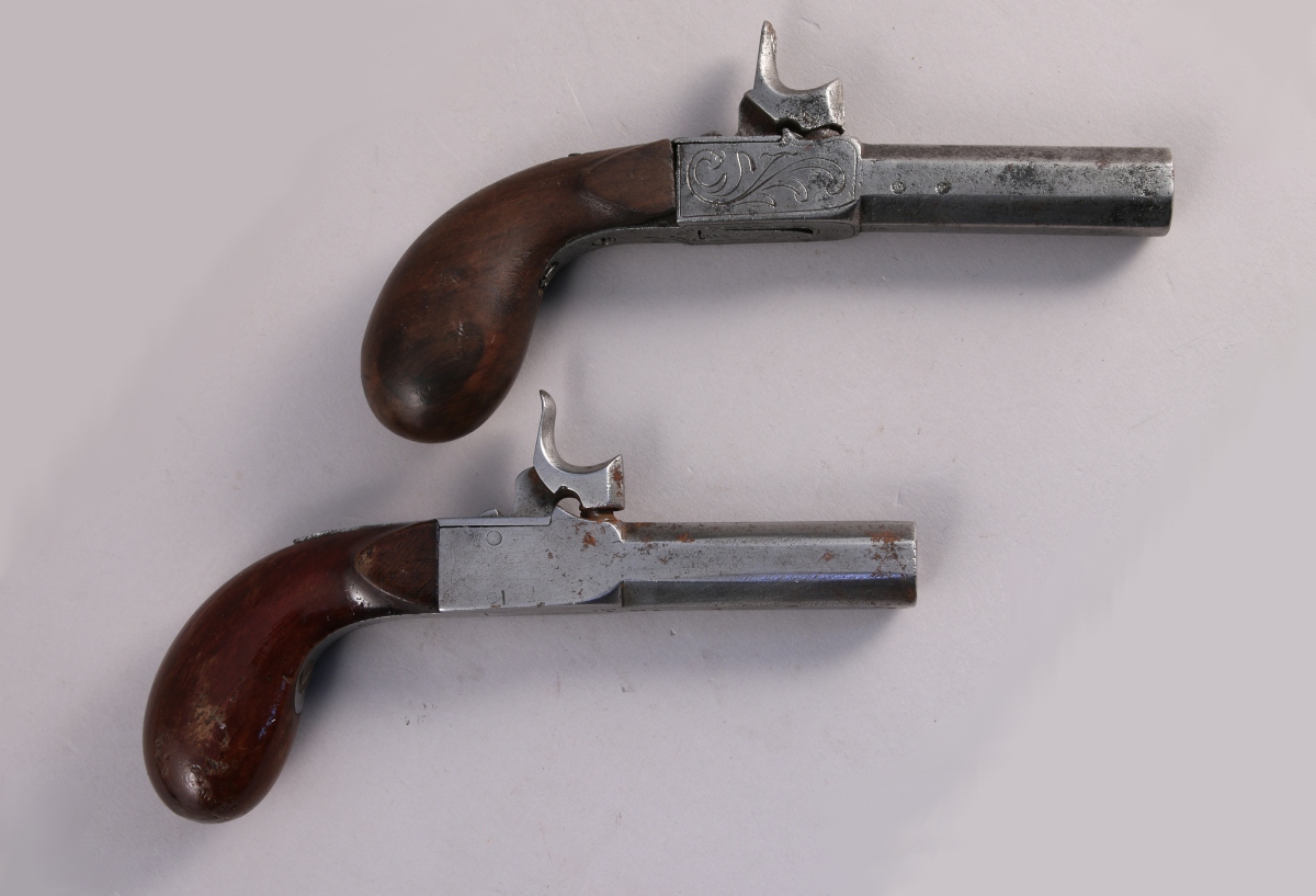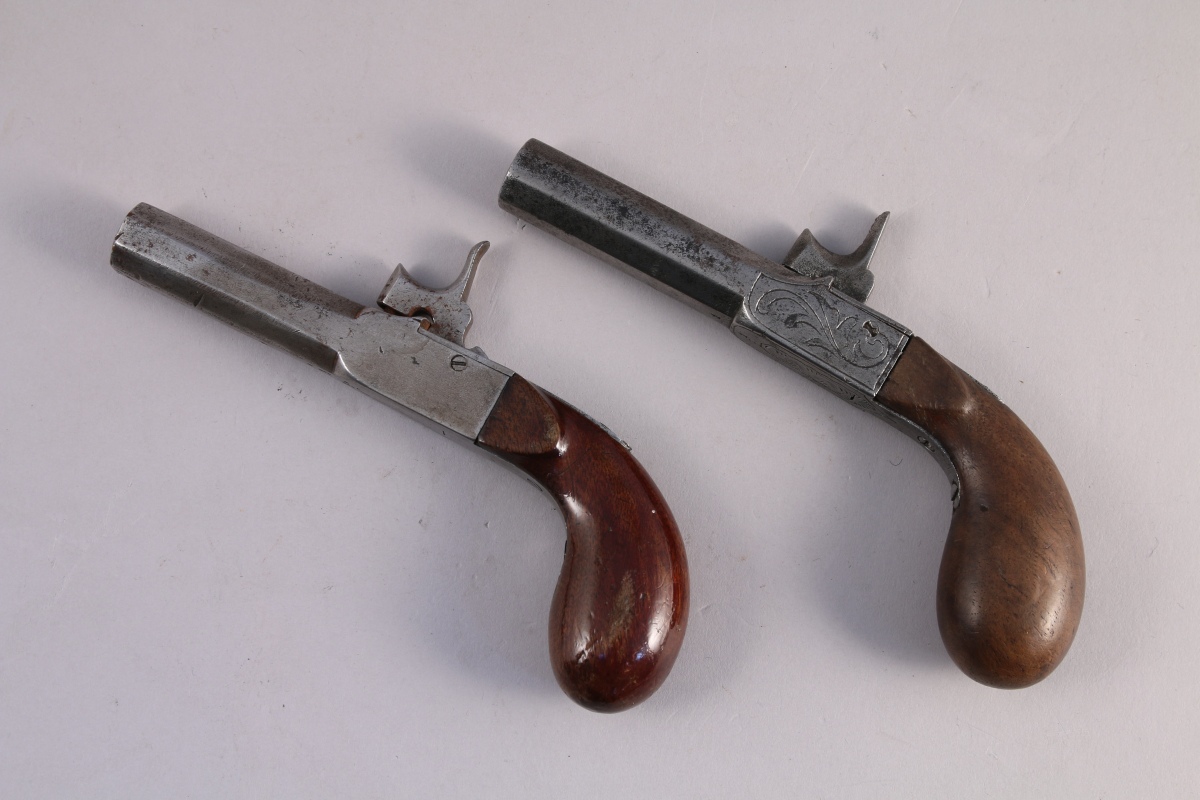 DEUX PISTOLETS À COFFRE à percussion. Canon à pans. Le coffre de l'un gravé de feuilles d'acanthe. Détente rentrante. Crosse en noyer. Mécanisme fonctionnel.