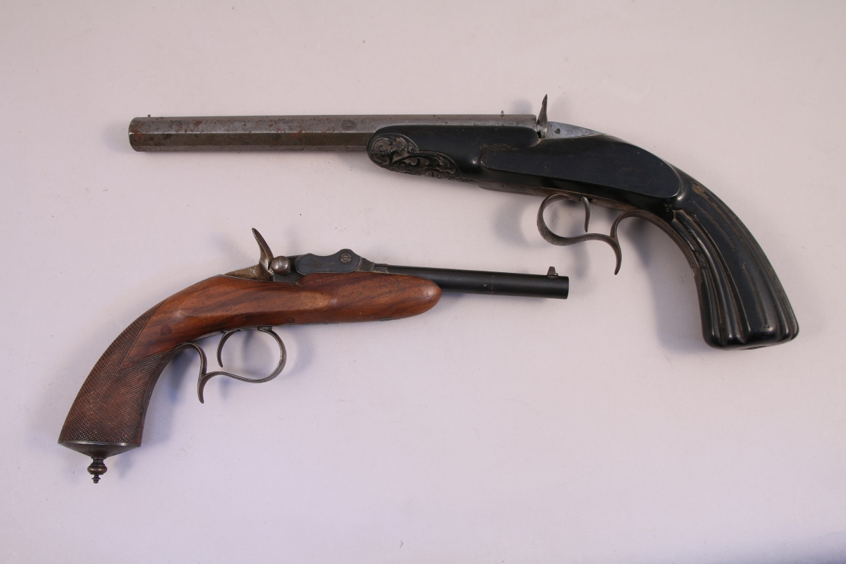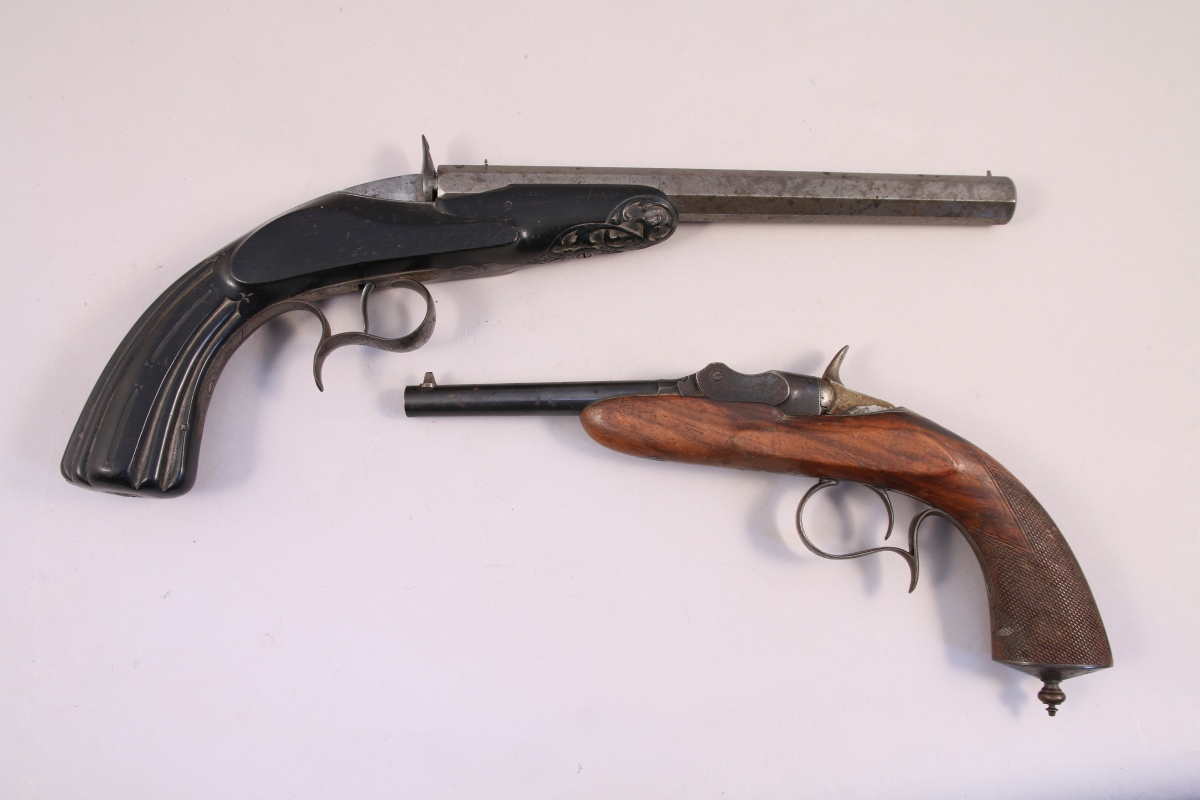 - PISTOLET à percussion annulaire. Chambre basculante actionnant un éjecteur. Canon rond bronzé signé "Eynac à Lyon". Garnitures en fer ciselées, pontet repose-doigt. Crosse en noyer quadrillée. Long. 26 cm. (mécanisme non fonctionnel)
