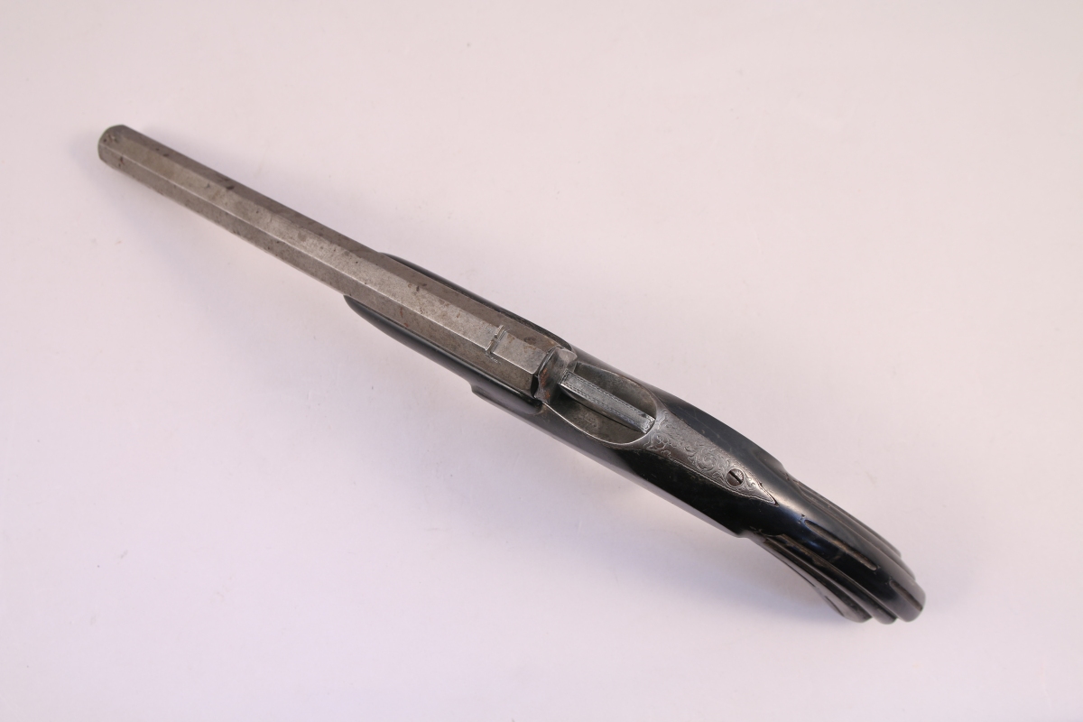 - PISTOLET à percussion annulaire. Canon à pans. Crosse en ébène sculptée de rinceaux, cannelures et godrons. Garnitures en fer ciselées, pontet repose-doigt. Long. 37 cm. (mécanisme non fonctionnel, manque la toupie de calotte)