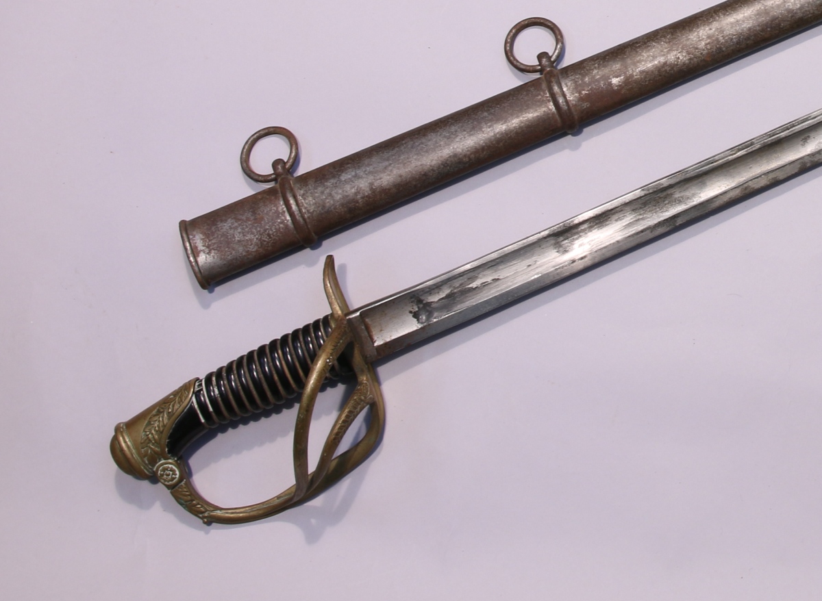 SABRE D'OFFICIER modèle 1822-1882. Garde en laiton à trois branches. Poignée en corne (manque le filigrane). Lame droite à gorge et contre-tranchant signée sur le dos: "anufre de Châtellerault". Fourreau en tôle à deux bracelets.