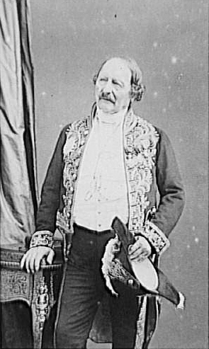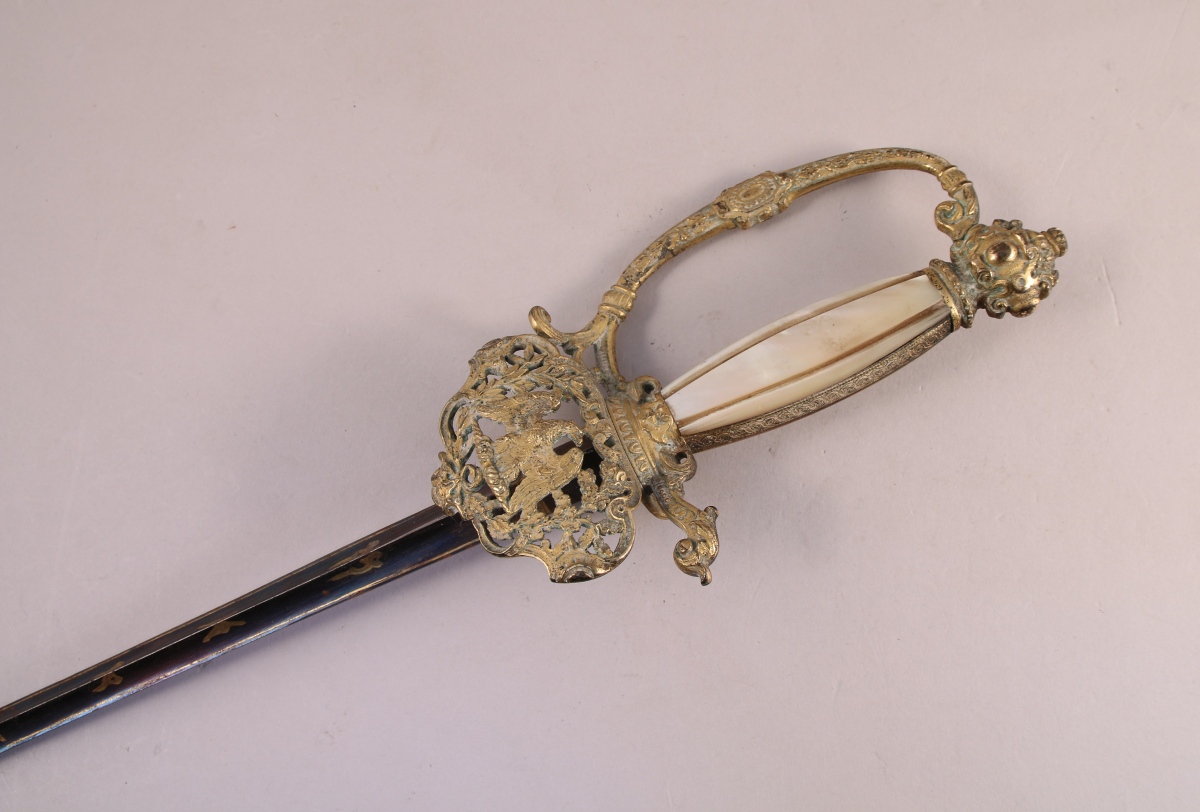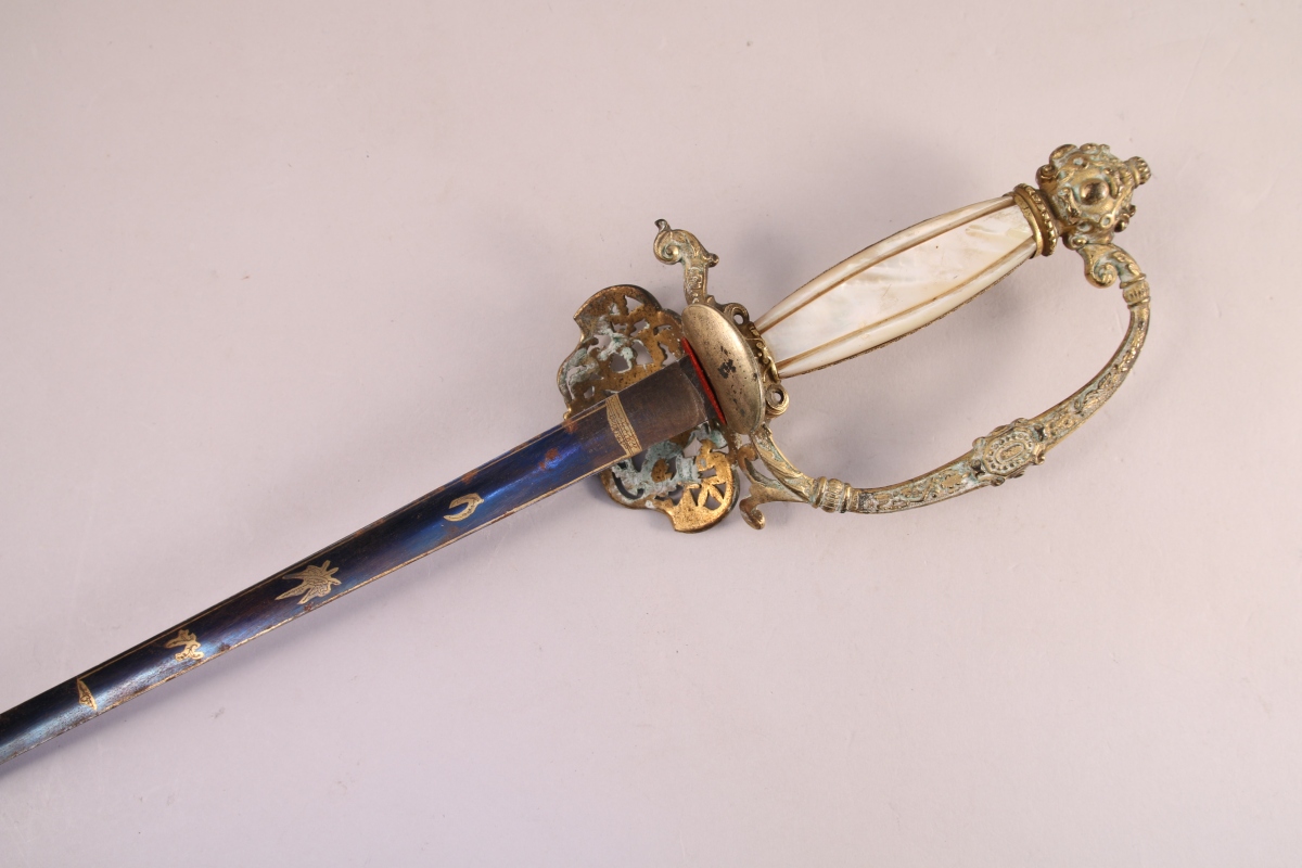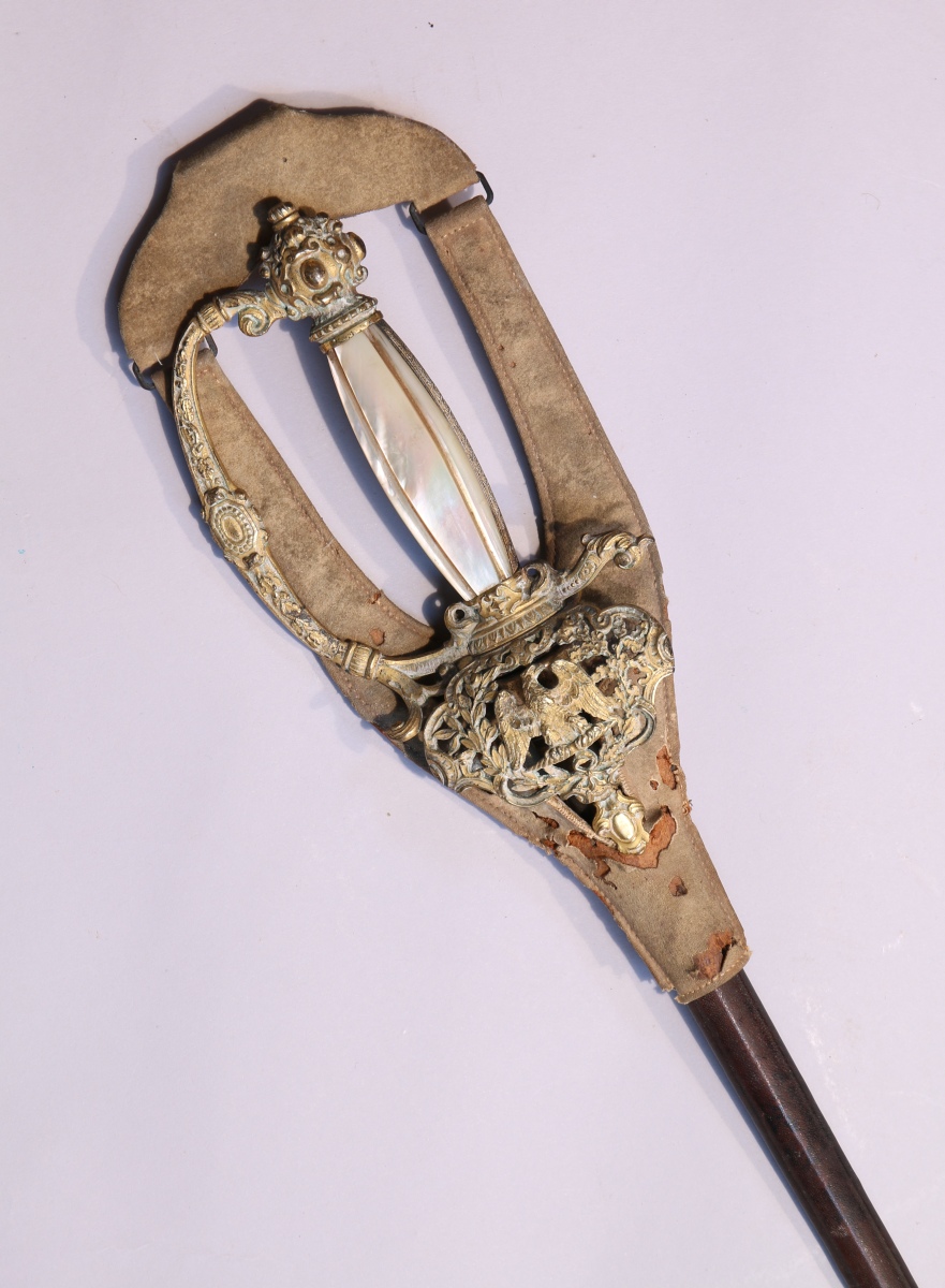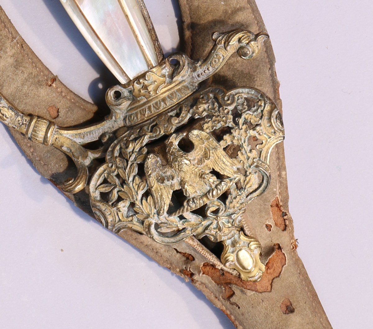 ÉPÉE DE CÉRÉMONIE ayant, selon la tradition familiale, appartenu à Maurice-Denis Larabit (1792-1896), sénateur du Second Empire de 1853 à 1870. Monture en bronze finement ciselé et doré, mat et bruni. Garde à clavier chantourné à décor ajouré de l'aigle impériale enserrant les foudres, flanquée d'une branche de laurier et d'une branche de chêne. Quillon recourbé feuillagé. Fusée à plaquettes de nacre, pommeau orné de cuirs découpés. Lame triangulaire, dorée et bleuie au tiers. Fourreau de cuir, bouterolle et chappe en bronze ciselé de feuillages et doré. Pontet en forme d'écu chantourné. Porte-fourreau en cuir recouvert de tissu blanc (accidents).