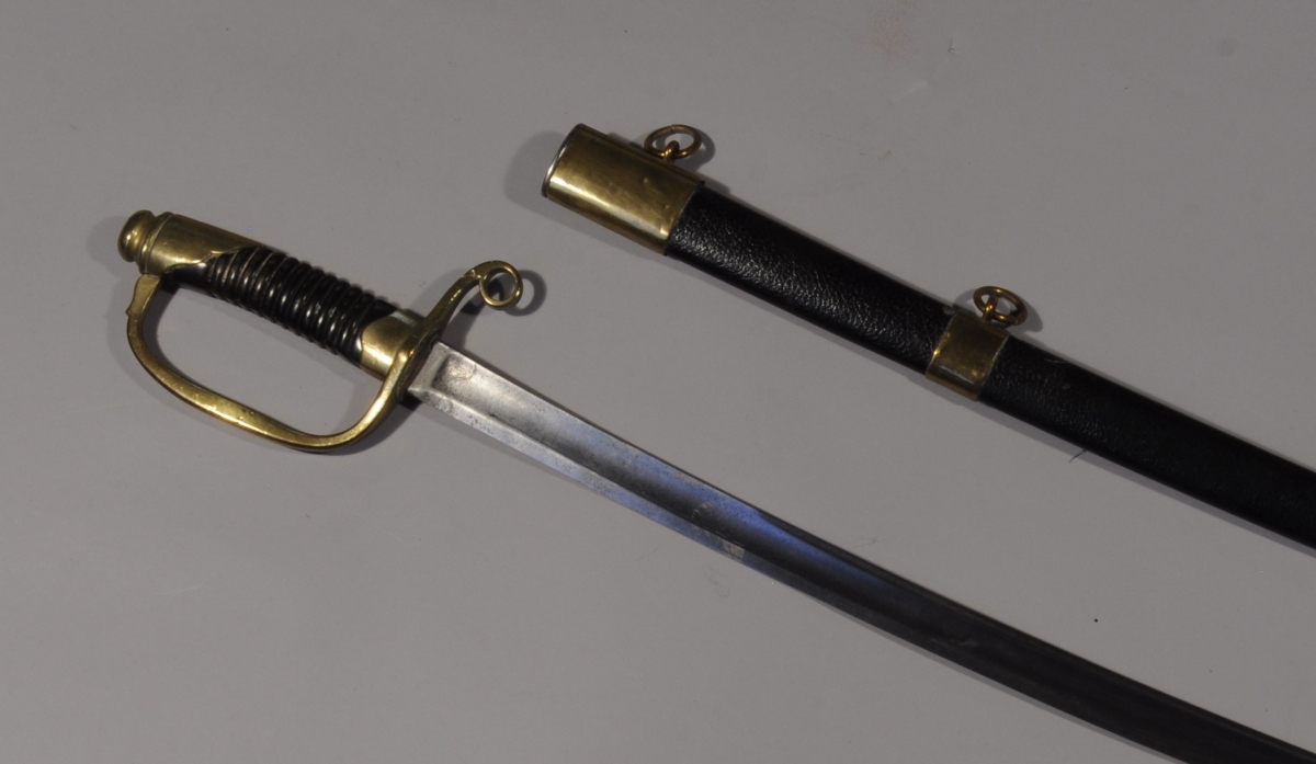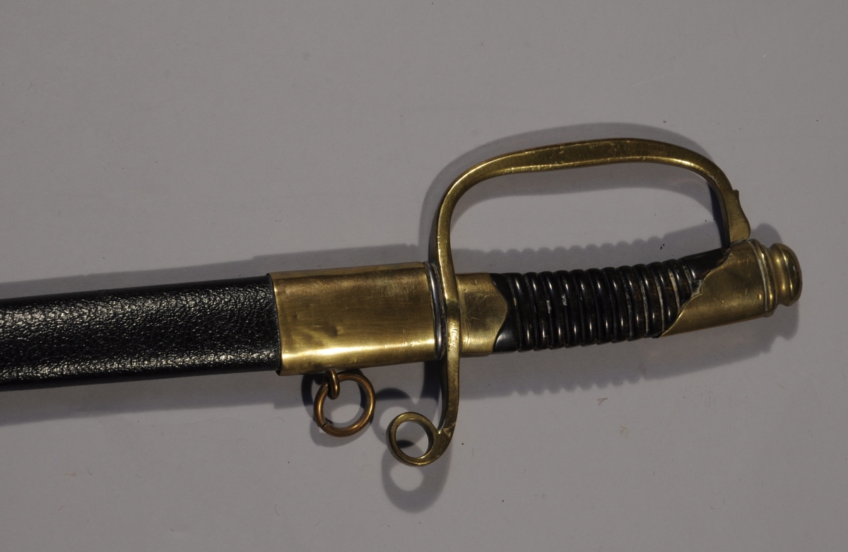 RUSSIE. SABRE DE CAVALERIE LÉGÈRE. Poignée en corne. Monture en laiton, garde à une branche. Lame courbe à dos plat et pans creux, poinçonnée au talon. Fourreau postérieur à deux garnitures en laiton.