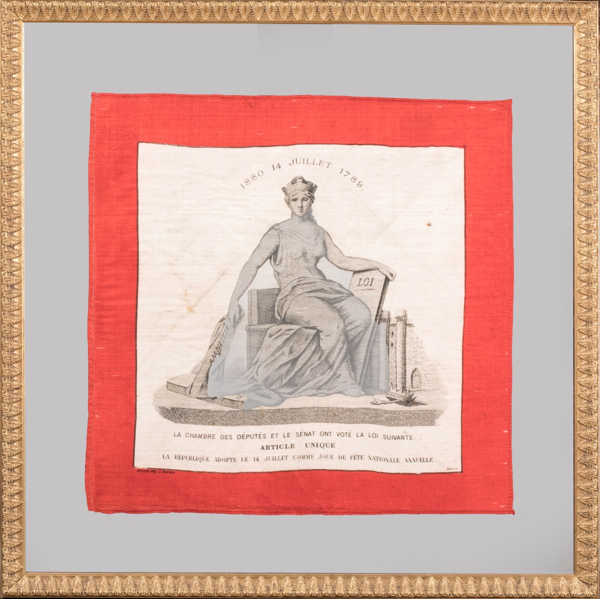 MOUCHOIR DU 14 JUILLET imprimé sur soie en souvenir du vote de la loi instaurant la fête nationale le 14 juillet 1880. Il figure une allégorie de la République et est légendé "1880 14 juillet 1789 / La Chambre des députés et le Sénat ont voté la loi suivante: / Article unique / La République adopte le 14 juillet comme jour de fête nationale annuelle". Bordure rouge. Signé "Bozzini Imp. à Tournon".