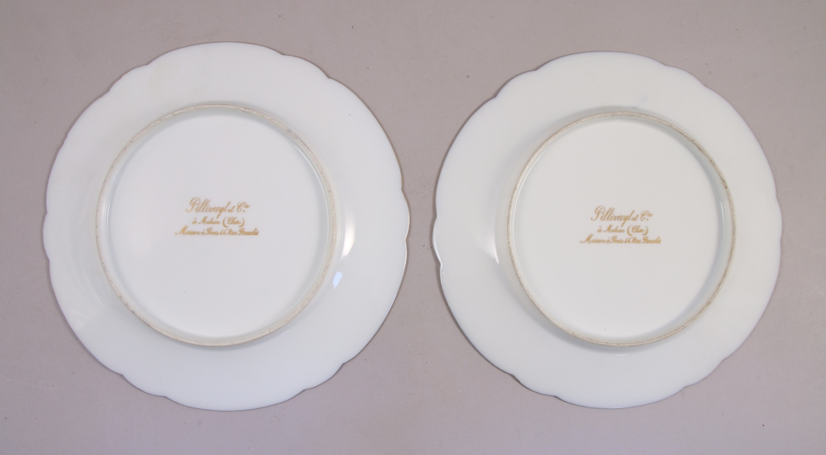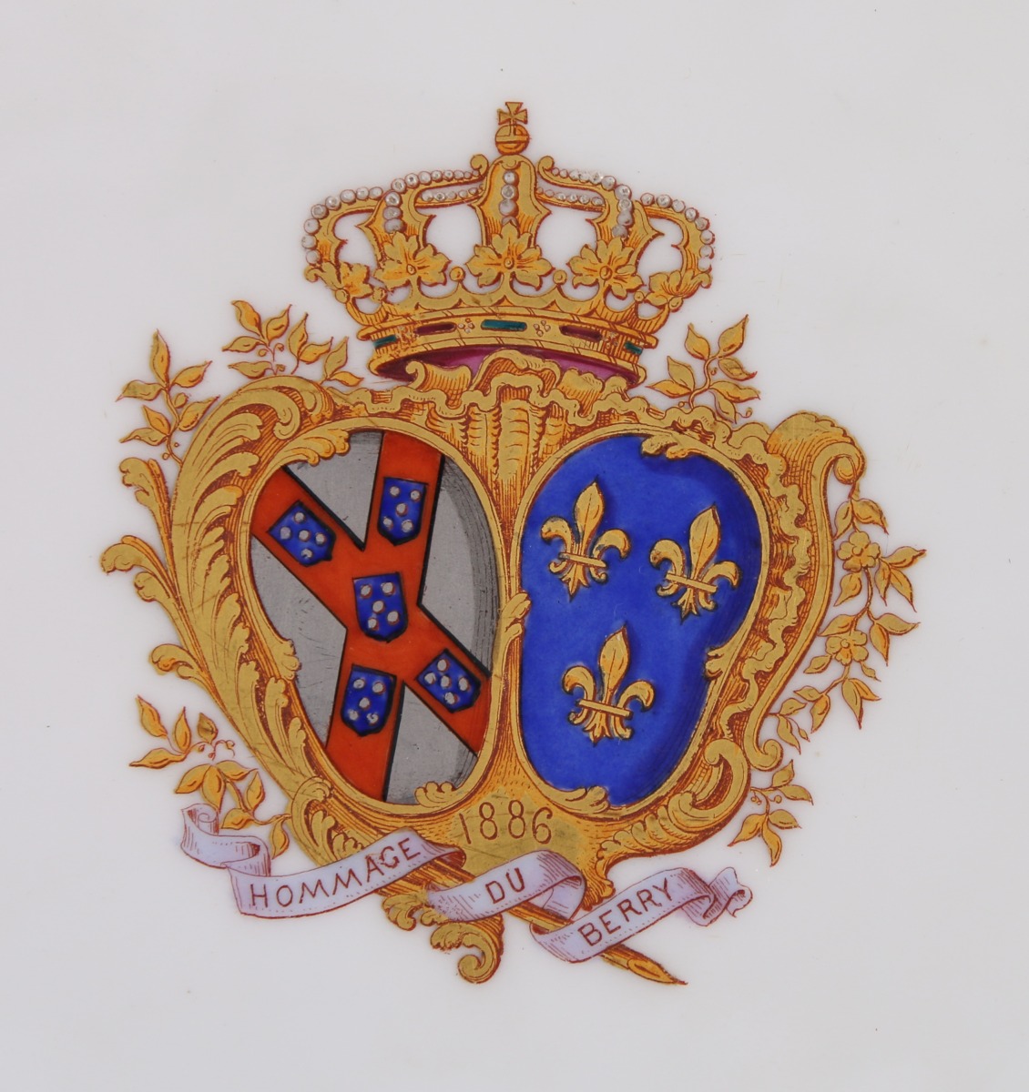 PAIRE D'ASSIETTES à bords contournés en porcelaine à décor polychrome et or des armes d'alliance Bragance-Orléans timbrées de la couronne royale de Portugal et soulignées d'un phylactère portant l'inscription "Hommage du Berry", et la date 1886. Galon fleurdelisé sur le marli et l'aile à fond bleu nuit bordée d'une frise de fleurs de lys et rinceaux en or mat et bruni. Filet or sur le bord. Marquées au revers à l'or: "Pillivuyt et Cie. / à Mehun (Cher) / Maison à Paris 46 Rue Paradis".