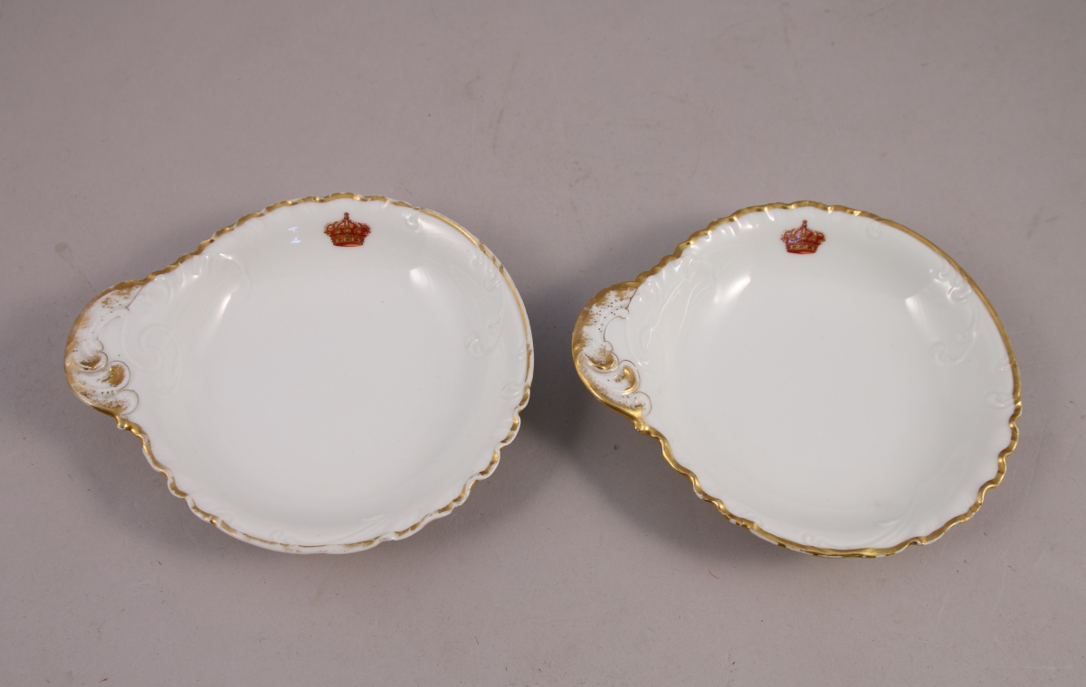 JOINT: provenant également du château de Bellevue, une PAIRE DE COUPELLES à bords contournés en porcelaine. Décor en léger relief de feuillages stylisés et motifs rocailles. L'aile ornée de la couronne royale de Portugal polychrome et or. Prise latérale, filet or sur le bord. Marques au revers: "Haviland France" et Haviland & Co Limoges".