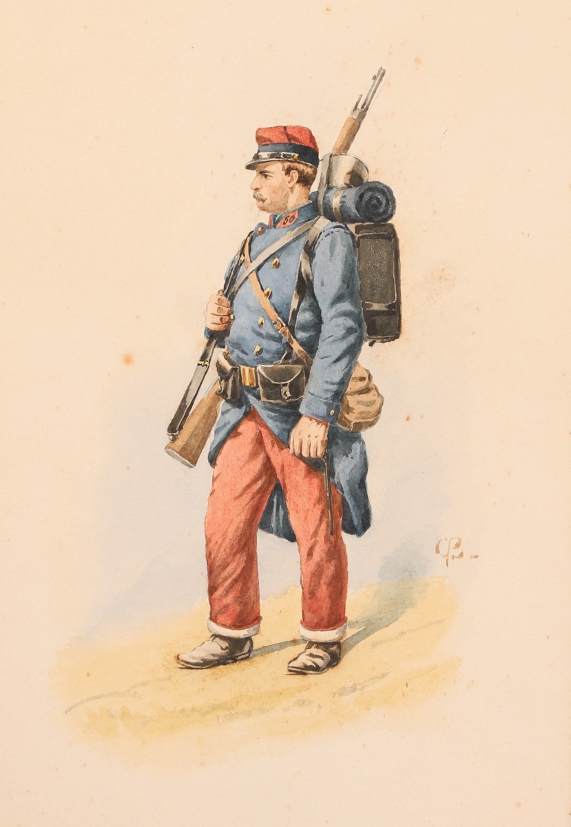 École FRANÇAISE du XIXe.Soldat du 50e régiment.Crayon et aquarelle monogrammé...