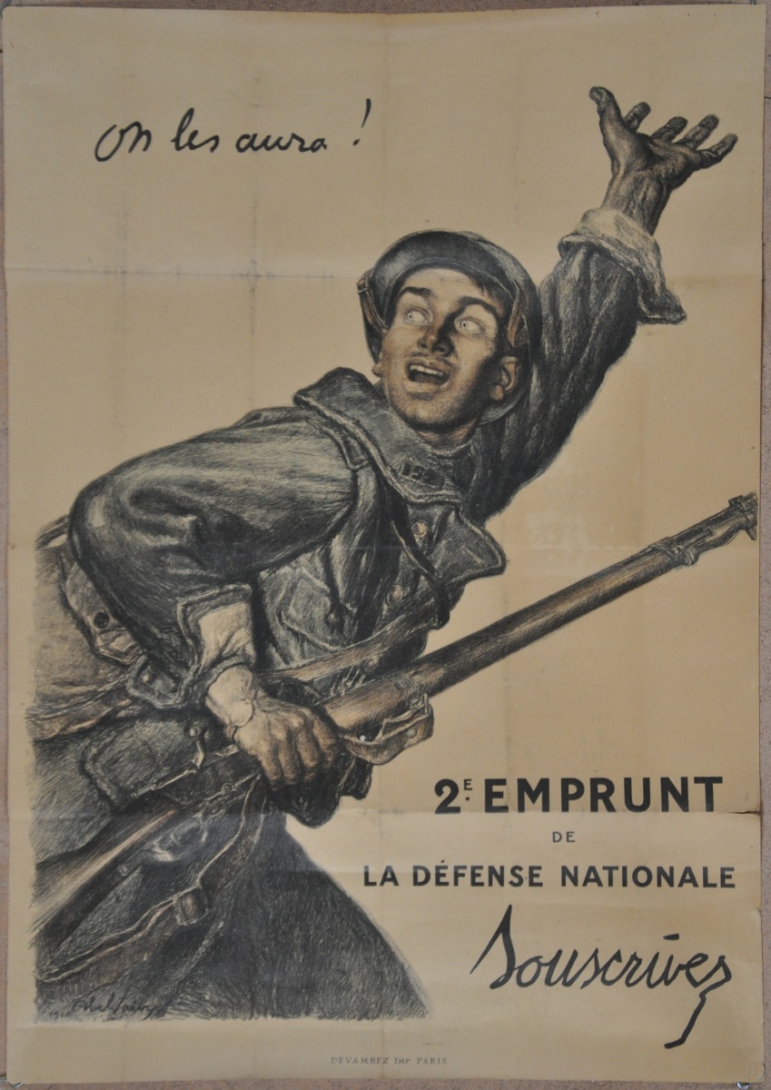 - "On les aura! 2e Emprunt de la Défense Nationale. Souscrivez" par Abel FAIVRE, Devambez impr. Paris. 114 x 80 cm.