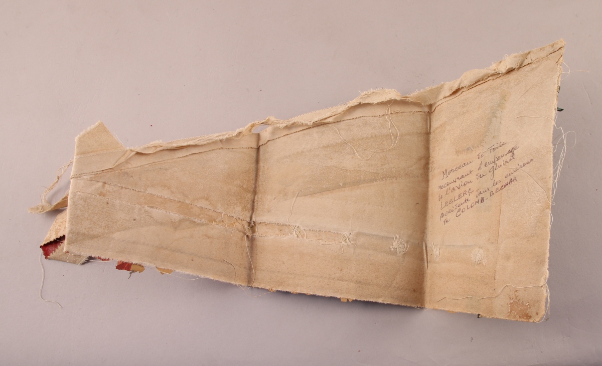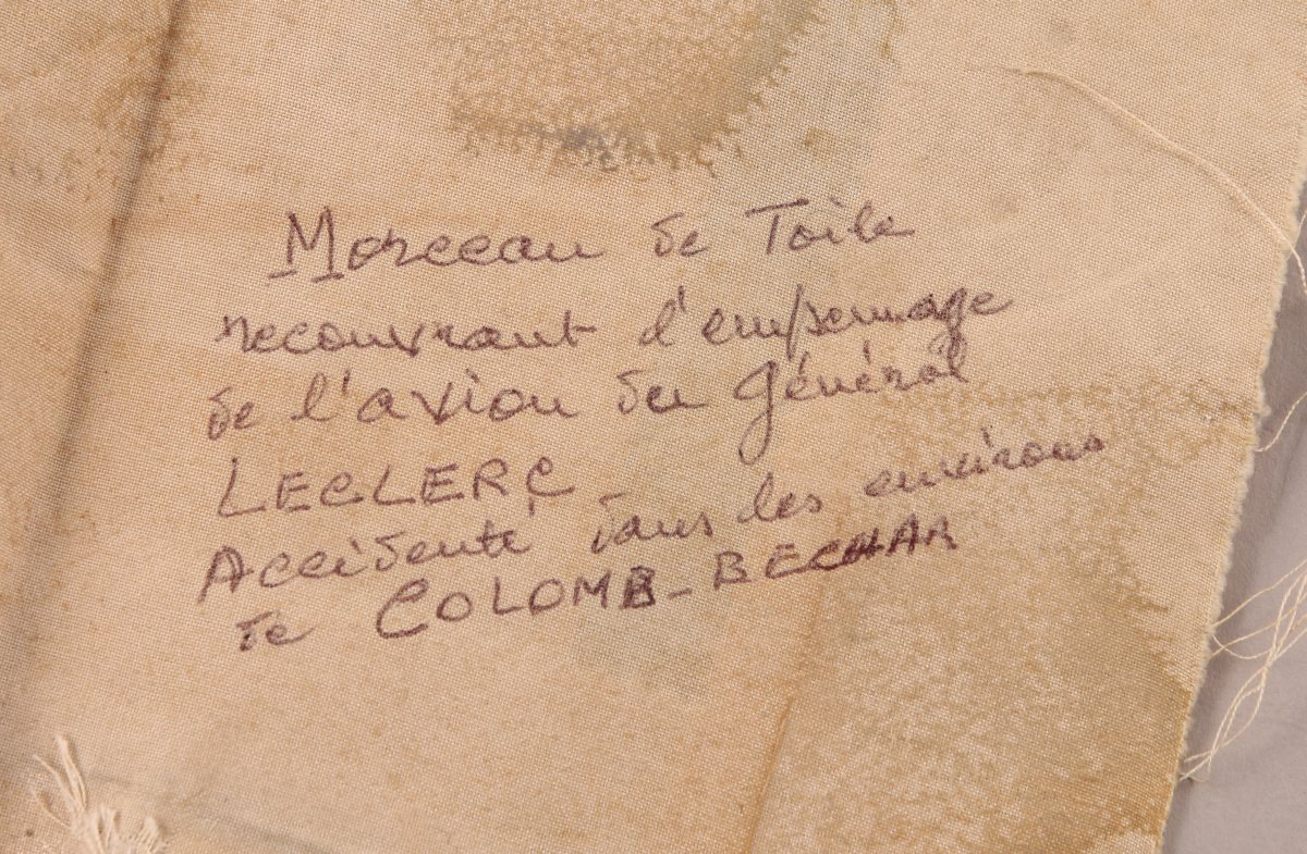 SOUVENIR DU DERNIER VOL DU GÉNÉRAL LECLERC. Selon un annotation manuscrite: "Morceau de toile recouvrant l'empennage de l'avion du général Leclerc. Accidenté dans les environs de Colomb-Béchar". Fragment de forme rectangulaire en toile laquée bleu blanc rouge.