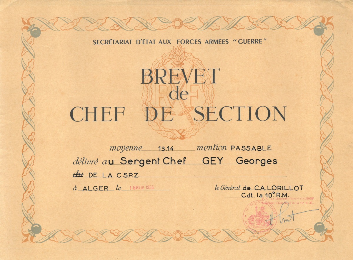 Ce fragment a été rapporté d'Algérie par l'adjudant Georges Gey (né à Paris en 1927). On joint à ce souvenir une photographie colorisée de l'djudant Gey; son brevet de Chef de Section délivré à Alger le 18 novembre 1955; son diplôme de la Médaille Commémorative des opérations de sécurité et de maintien de l'ordre en Afrique du Nord délivré à Colomb Béchar le 1er janvier 1957 et son brevet de la médaille militaire délivré le 4 décembre 1959.