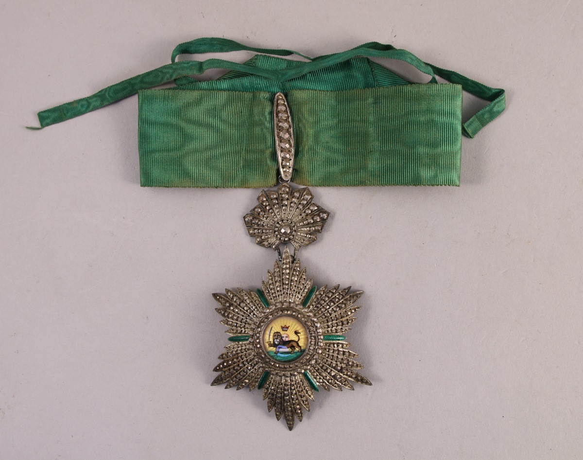 PERSE. ORDRE DU LION ET DU SOLEIL, bijou de commandeur militaire en forme d'étoile à six pointes, portée verticalement, en argent travaillé en pointes de diamants ajourées, anglée de rais émaillés vert, le centre, dans un double cerclage diamanté, est orné du lion debout portant un sabre, devant le soleil surmonté de la couronne impériale Quajar. Cravate complète. Rare fabrication européenne.