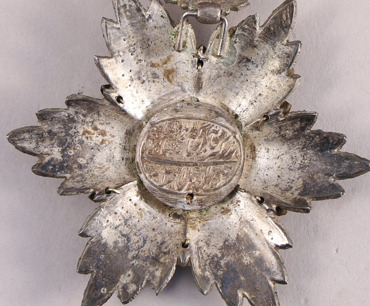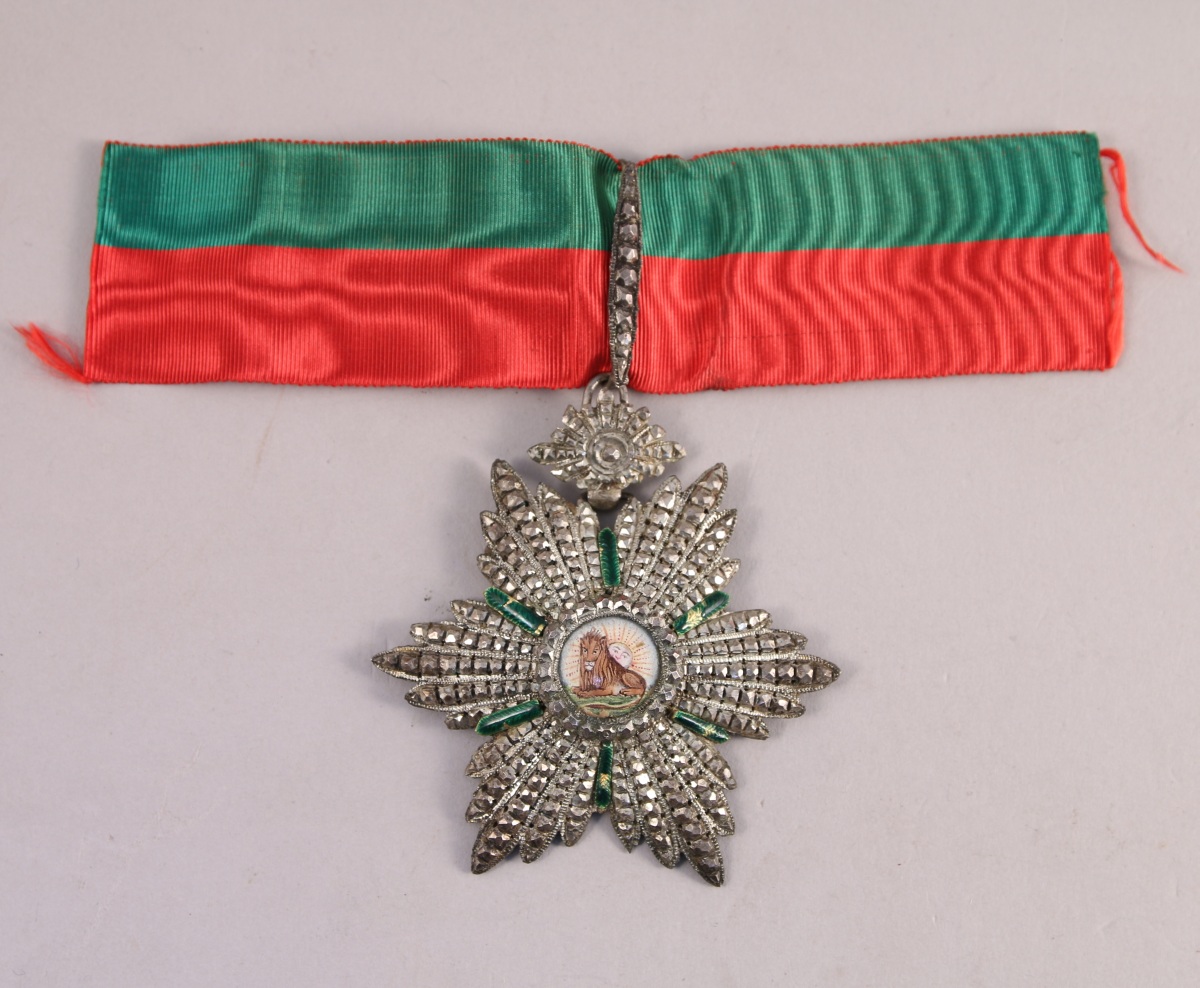 PERSE. ORDRE DU LION ET DU SOLEIL, bijou de commandeur civil en forme d'étoile à six pointes, portée horizontalement, en argent travaillé en pointes de diamants, anglée de rais émaillés vert (éclats), le centre, dans un simple cerclage diamanté, est orné du lion couché devant le soleil, le revers porte la signature d'un orfèvre persan. Ruban non conforme rouge et vert.