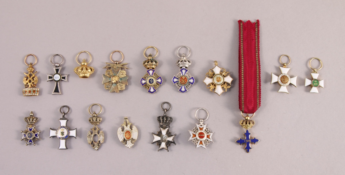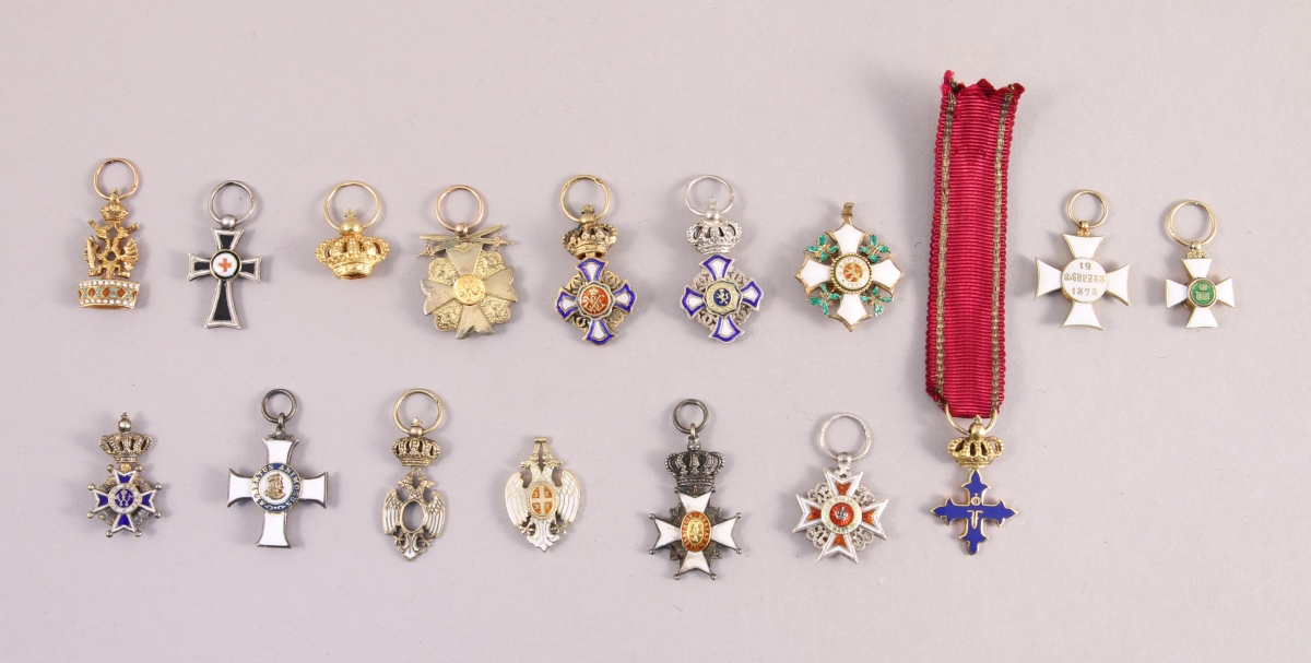 - AUTRICHE - DEUX RÉDUCTIONS: ORDRE DE LA COURONNE DE FER, or émaillé. Poinçon tête d'aigle. Poids brut: 1,6 g ; ORDRE DES CHEVALIERS TEUTONIQUES, argent émaillé. Poinçon hure de sanglier. Poids brut: 1 g.