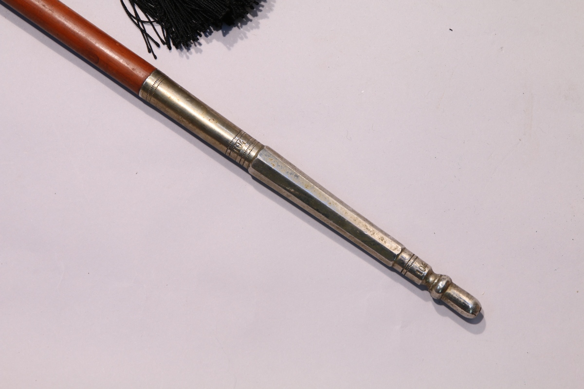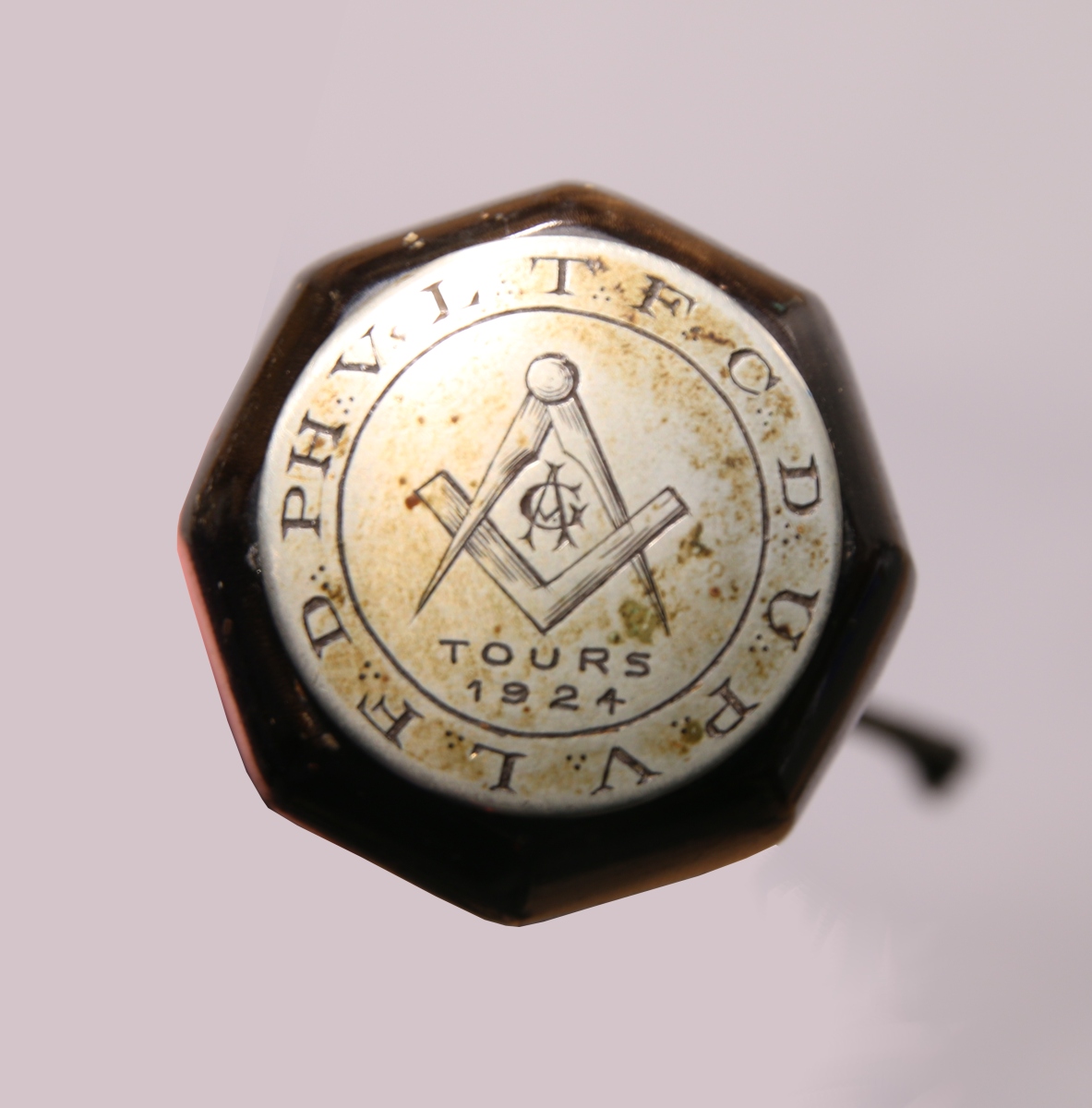 CANNE de COMPAGNON. Le pommeau en corne brune de forme octogonale orné d'un disque d'argent gravé de l'équerre et du compas avec le monogramme "CA" situé Tours et daté 1924 et autour les lettres gravées "PH VLTFCDUPVLFD". Fût en jonc à œilletons accueillant une passementerie noire à pompons. Férule en bronze argenté à facettes terminé par un gland, gravée deux fois 104 et avec les initiales AP.
